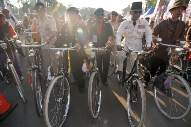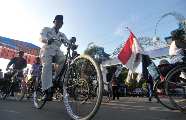 Seorang pesepeda onthel berkostum ala Bung Karno berkeliling saat kampanye bebas polusi di Tegal, Jawa Tengah, Sabtu (30/4). Kegiatan yang diikuti sebanyak 2000 pecinta sepeda onthel dari berbagai wilayah diantaranya NTB, Jakarta dan Bandung tersebut guna mengurangi polusi, bebas macet, bebas BBM, dan hidup sehat. ANTARA FOTO/Oky Lukmansyah/pd/16