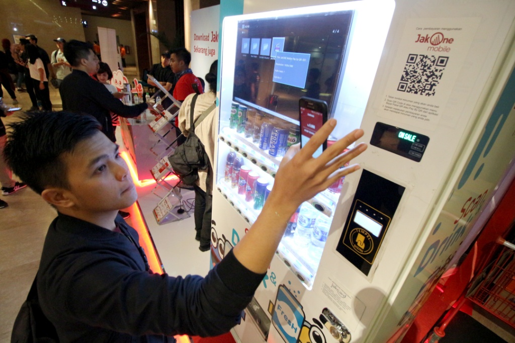Seorang pengunjung tengah melakukan transaksi dengan menggunakan JakOne Mobile Bank DKI di vending machine disela sela acara festival seni Alpus Incredibles 6 di Jakarta, Sabtu (28/10). Bank DKI terus mendorong penerapan transaksi non tunai di DKI Jakarta. Per Oktober 2017, pengguna JakOne Mobile telah mencapai 10 ribu pengguna. AKTUAL/Eko S Hilman