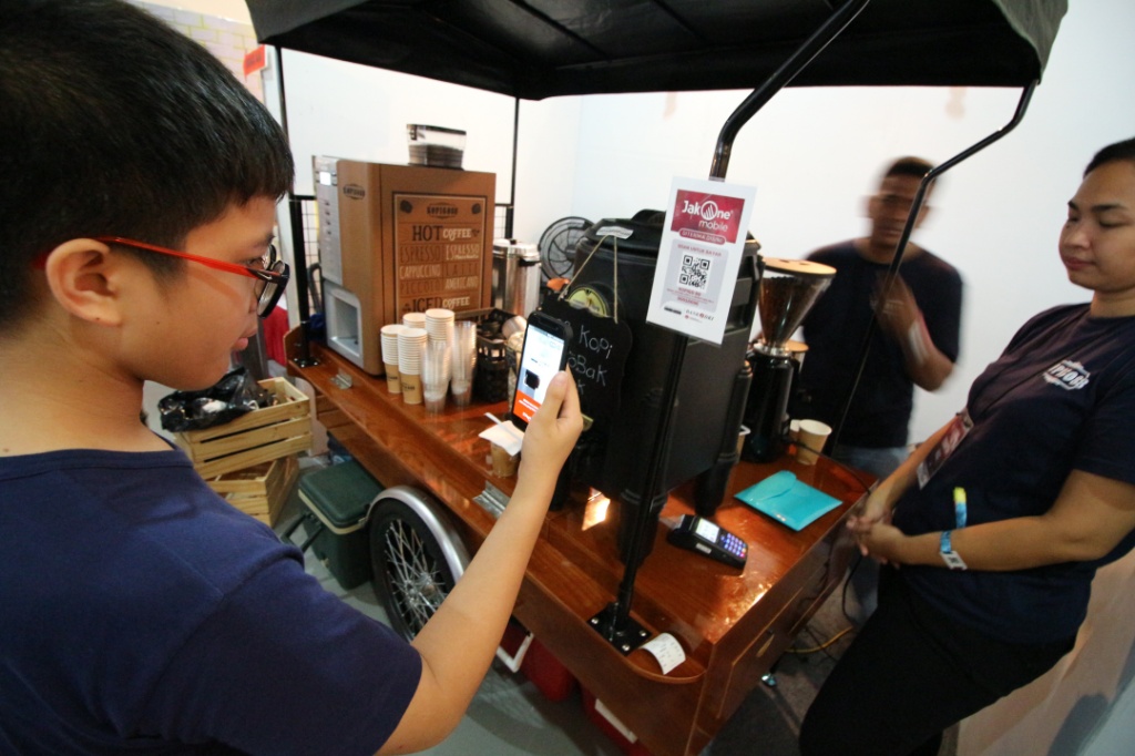 Seorang pelajar tengah melakukan transaksi dengan menggunakan JakOne Mobile Bank DKI di salah satu gerai kopi disela sela acara festival seni Alpus Incredibles 6 di Jakarta, Sabtu (28/10). Bank DKI terus mendorong penerapan transaksi non tunai di DKI Jakarta. Per Oktober 2017, pengguna JakOne Mobile telah mencapai 10 ribu pengguna. AKTUAL/Eko S Hilman