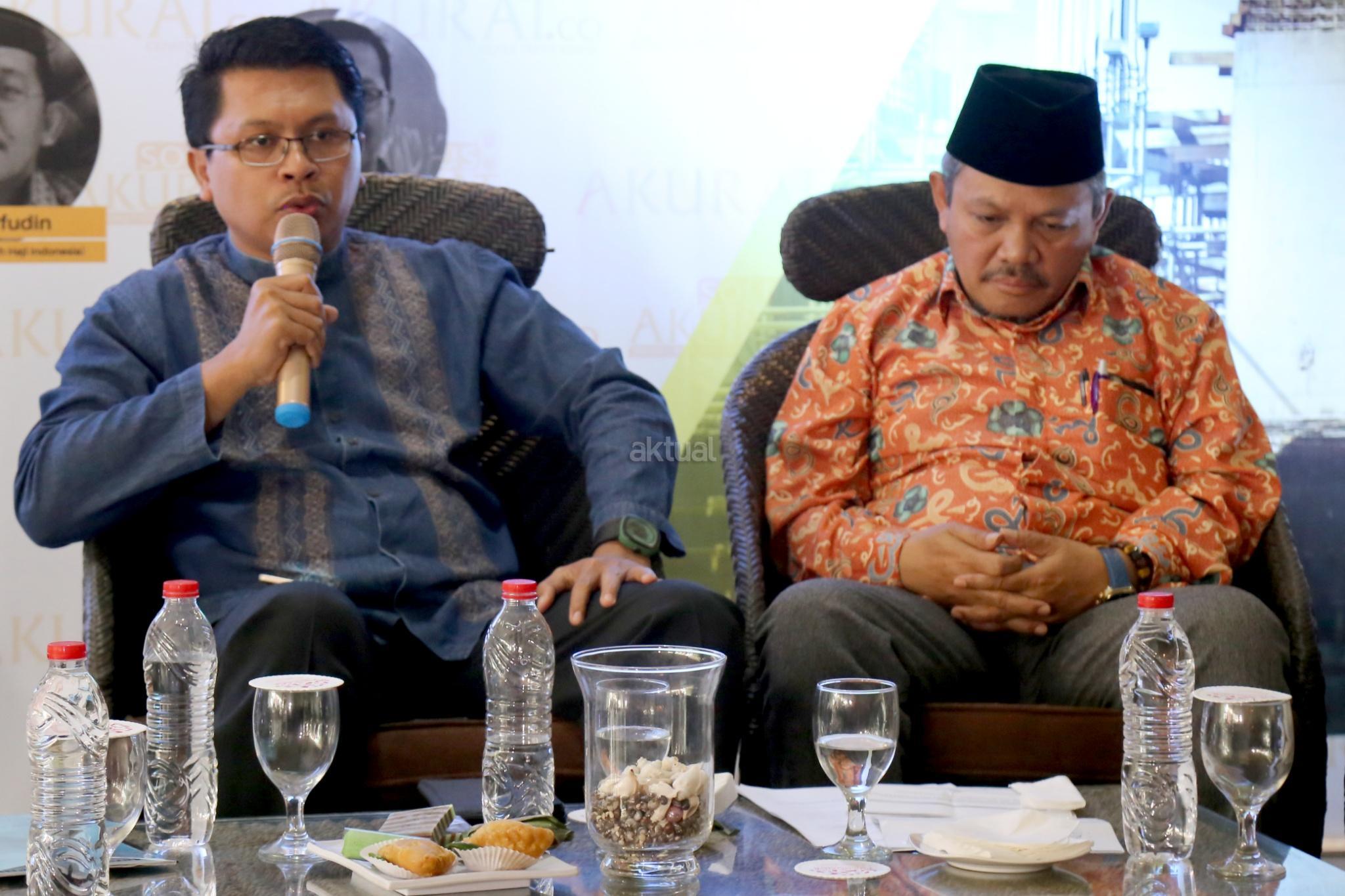 Ketua Moderate Muslim Society Zuhairi Misrawi bersama Anggota DPR Komisi VIII F-P Demokrat Khatibul Umam Wiranu saat diskusi “Untung Rugi Investasi Dana Haji” di Jakarta, Minggu (6/8). Rencana pemerintah menggunakan dana haji untuk investasi di bidang infrastruktur dinilai melanggar undang -undang No 34 tahun 2014. Sebab, dalam UU tersebut dana haji tidak boleh digunakan untuk mencari keuntungan. AKTUAL/Tino Oktaviano