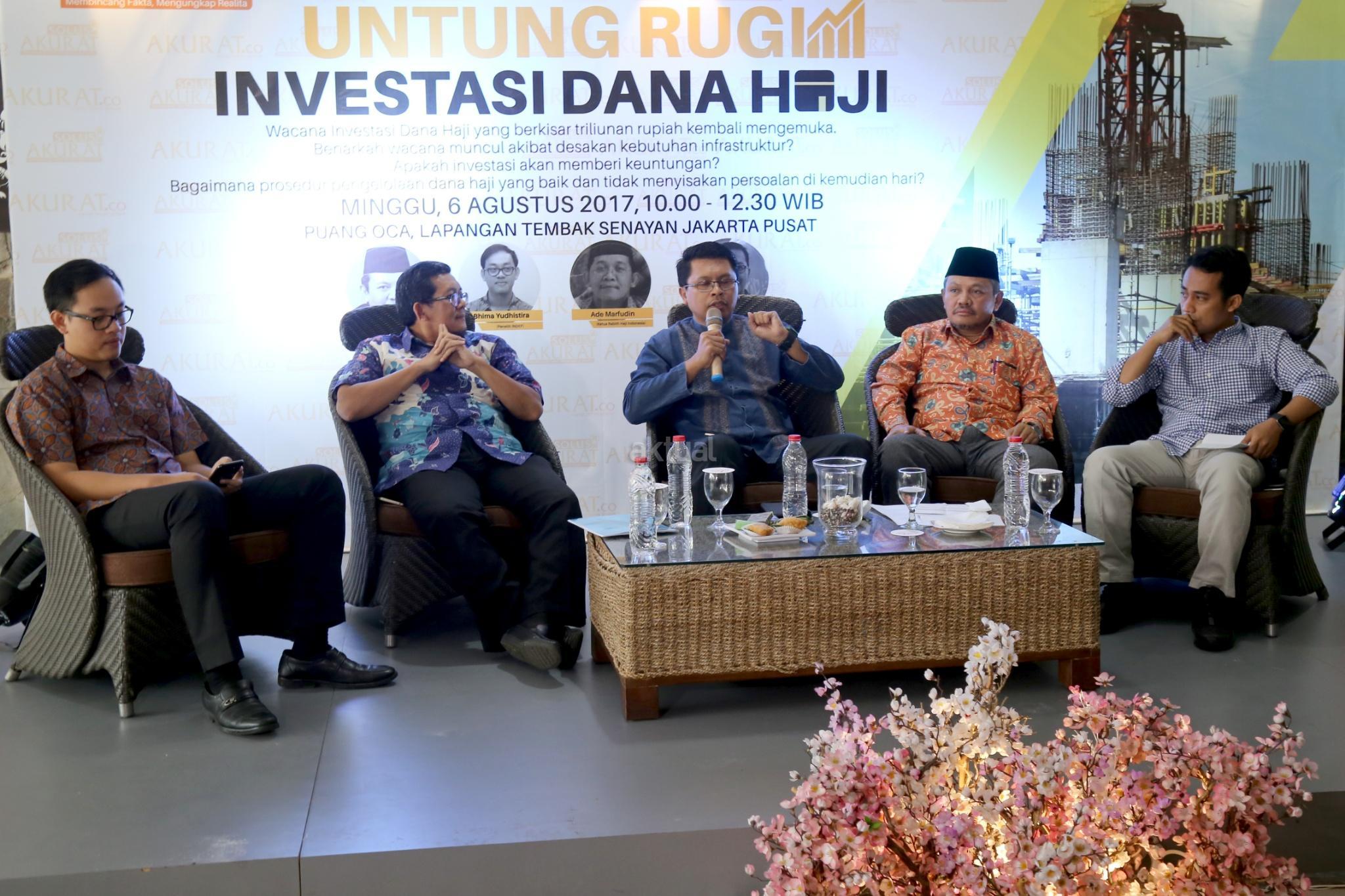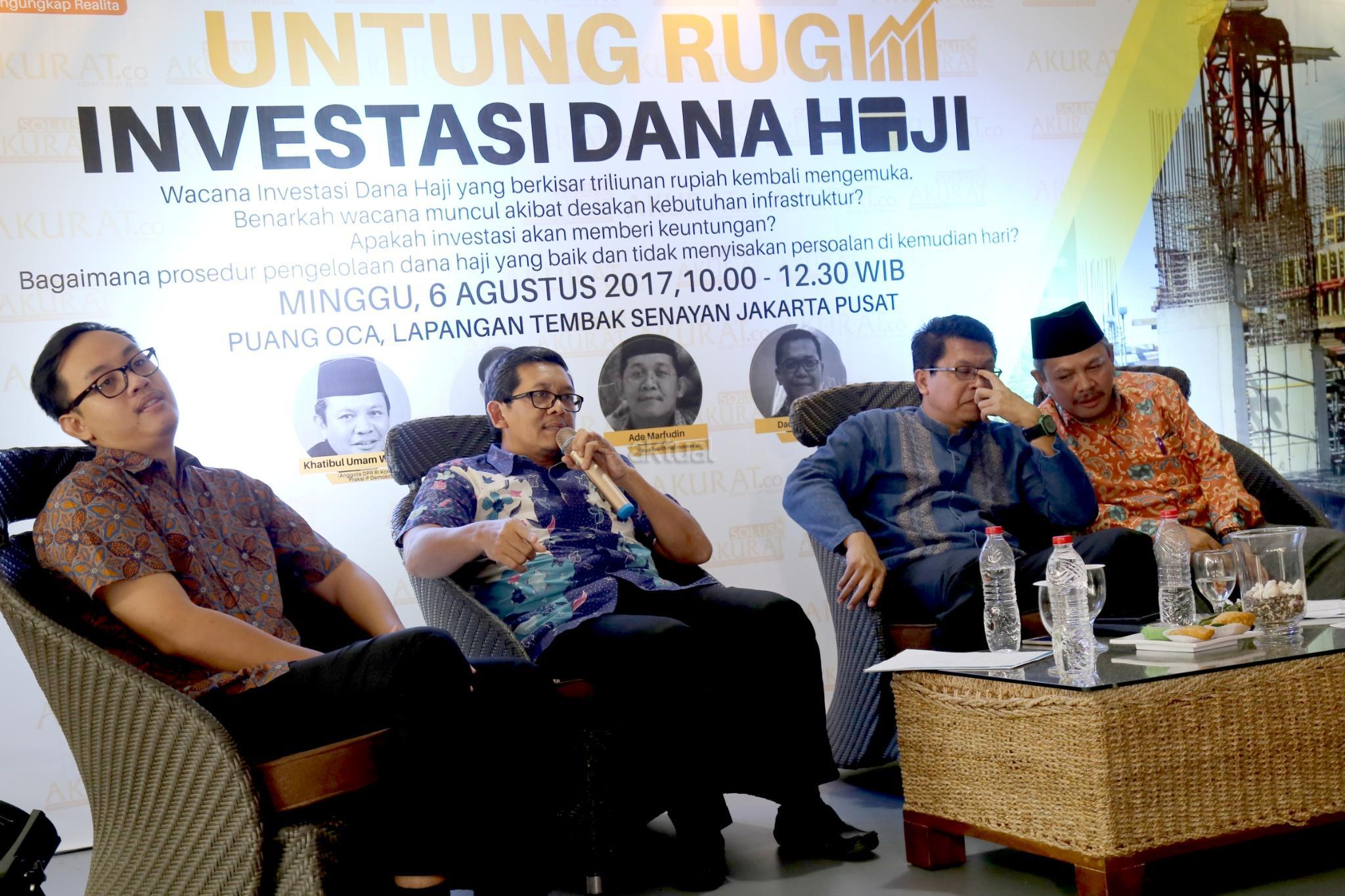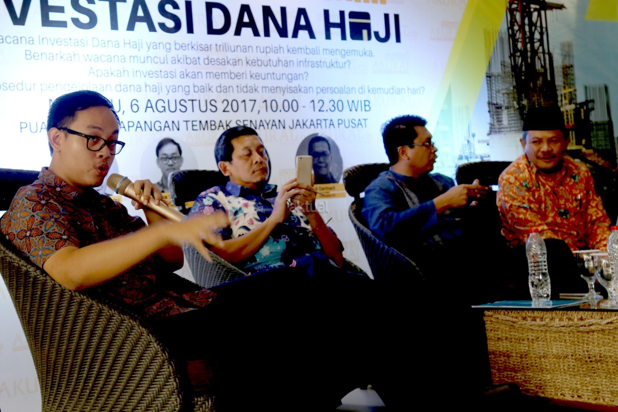 Dari kiri ke kanan, Peneliti INDEF Bima Yudhistira, Ketua Mabith Haji Indonesia Ade Marfudin, Ketua Moderate Muslim Society Zuhairi Misrawi, Anggota DPR Komisi VIII F-P Demokrat Khatibul Umam Wiranu saat diskusi "Untung Rugi Investasi Dana Haji" di Jakarta, Minggu (6/8). Rencana pemerintah menggunakan dana haji untuk investasi di bidang infrastruktur dinilai melanggar undang -undang No 34 tahun 2014. Sebab, dalam UU tersebut dana haji tidak boleh digunakan untuk mencari keuntungan. AKTUAL/Tino Oktaviano