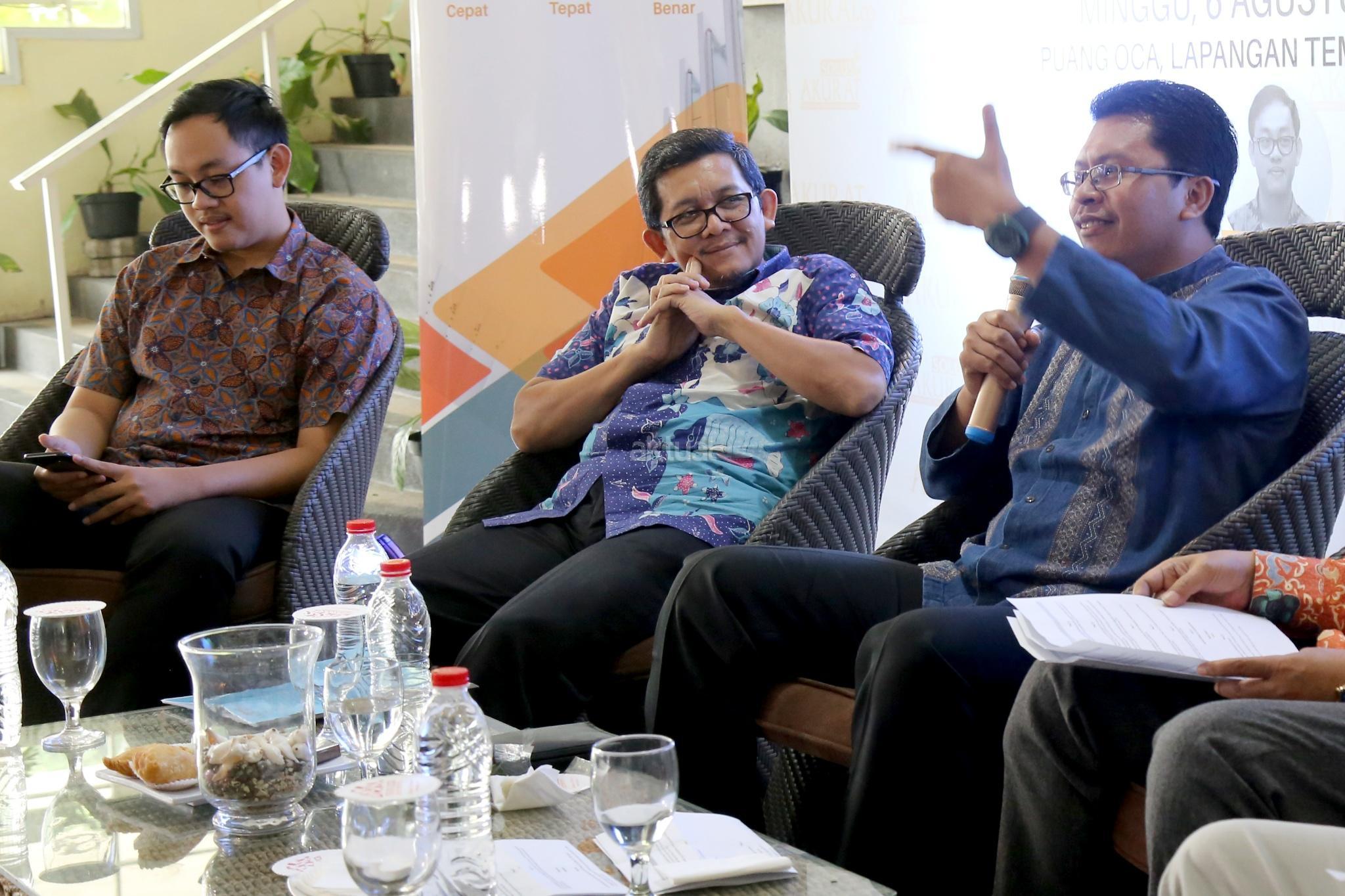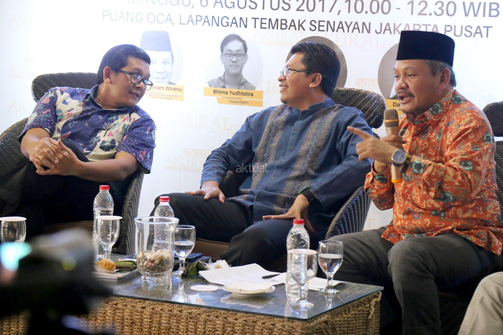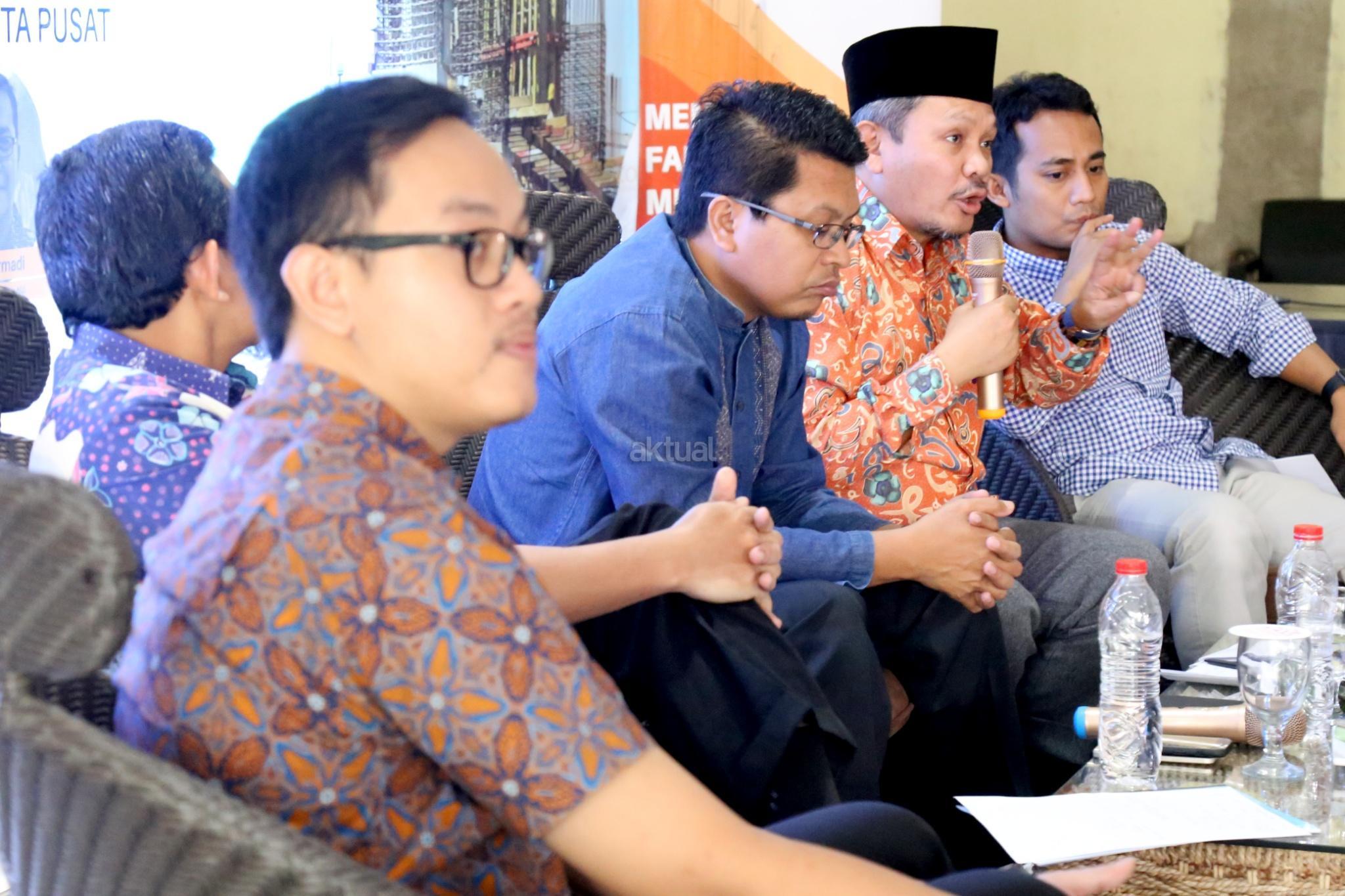 Dari kiri ke kanan, Ketua Mabith Haji Indonesia Ade Marfudin, Ketua Moderate Muslim Society Zuhairi Misrawi, Anggota DPR Komisi VIII F-P Demokrat Khatibul Umam Wiranu saat diskusi “Untung Rugi Investasi Dana Haji” di Jakarta, Minggu (6/8). Rencana pemerintah menggunakan dana haji untuk investasi di bidang infrastruktur dinilai melanggar undang -undang No 34 tahun 2014. Sebab, dalam UU tersebut dana haji tidak boleh digunakan untuk mencari keuntungan. AKTUAL/Tino Oktaviano