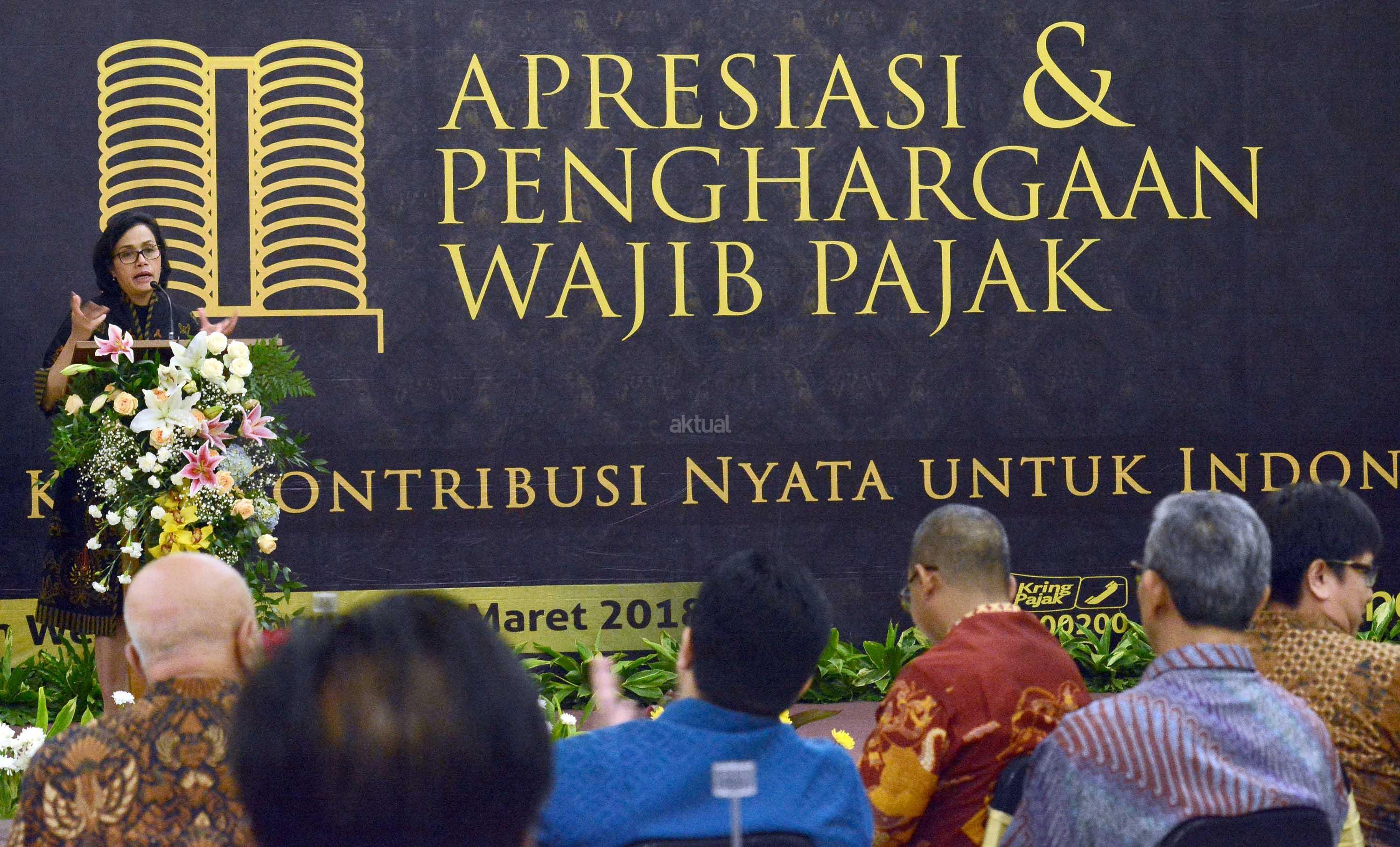 Menteri Keuangan Sri Mulyani menyampaikan sambutan di depan para wajib pajak seusai menyerahkan piagam penghargaan Wajib Pajak di Gedung Radjiman Wedyodiningrat, Jakarta, Selasa (13/3). Sebanyak 31 wajib pajak besar meraih apresiasi dan penghargaan atas kepatuhan terhadap peraturan perpajakan dan pencapaian target penerimaan Kanwil DJP Wajib Pajak Besar di tahun 2017. AKTUAL/Eko S Hilman