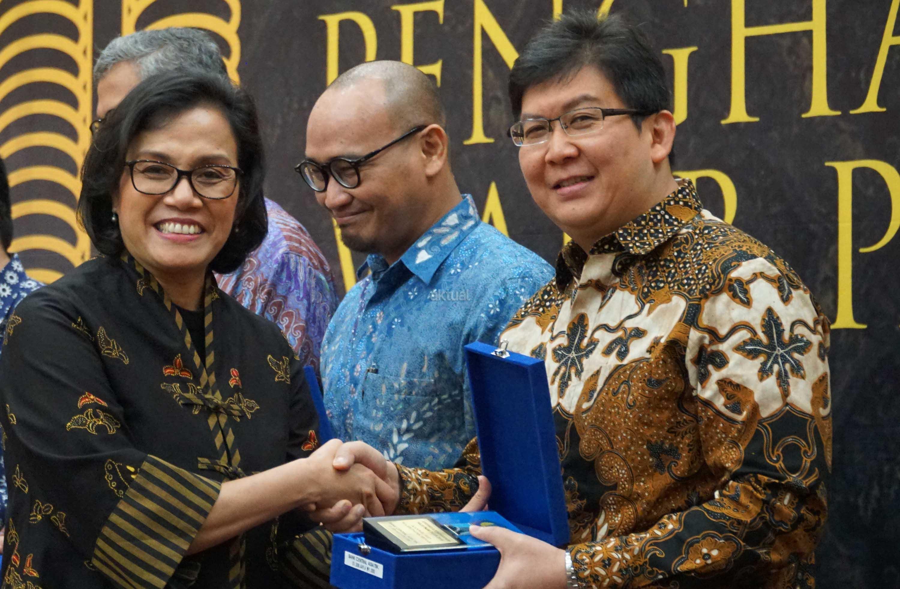 Executive Vice President Finance & Corporate Planning Division BCA Raymon Yonarto (kanan) menerima penghargaan Wajib Pajak yang diserahkan oleh Menteri Keuangan Republik Indonesia (RI) Sri Mulyani Indrawati di Gedung Radjiman Wedyodiningrat, Jakarta, Selasa (13/03). Penghargaan ini diberikan kepada 31 wajib pajak karena kepatuhan terhadap peraturan perpajakan dan pencapaian target penerimaan Kanwil DJP Wajib Pajak Besar di tahun 2017. BCA menjadi salah satu institusi yang termasuk dalam Kantor Pelayanan Pajak (KPP) Wajib Pajak Besar Satu. AKTUAL/Eko S Hilman