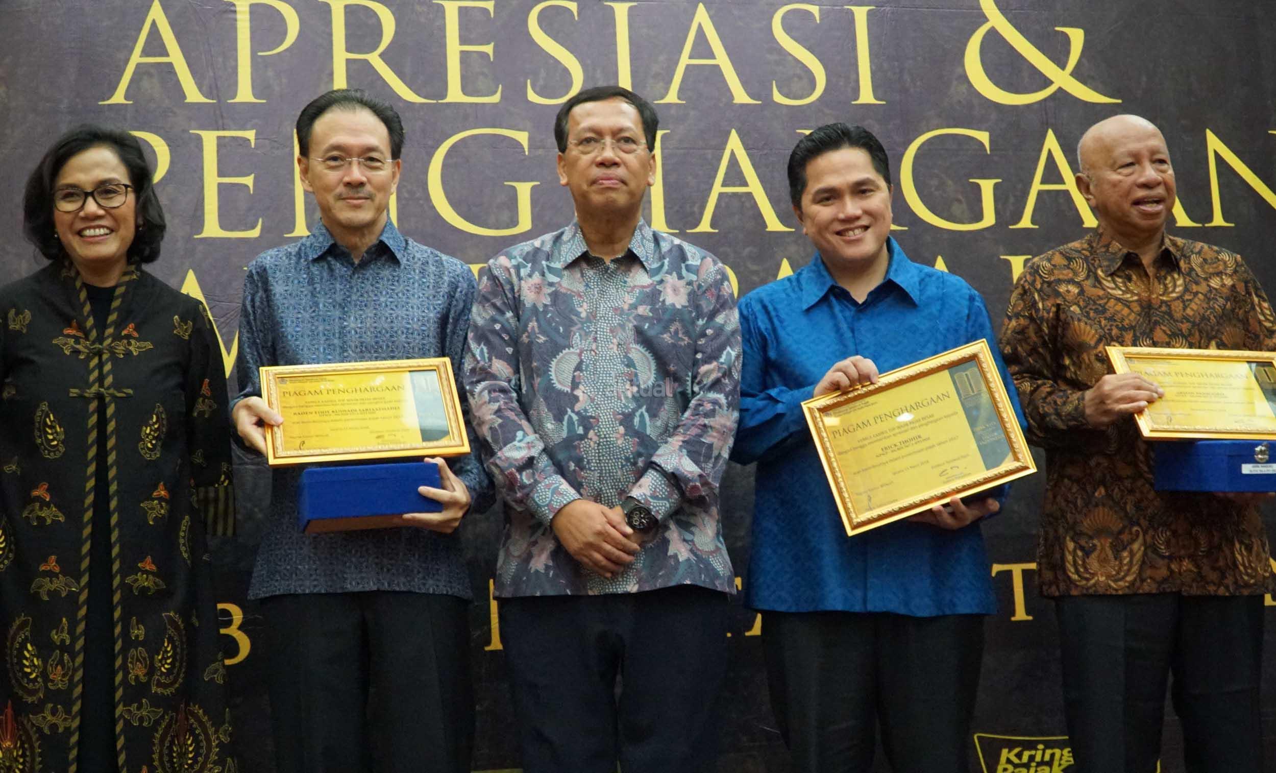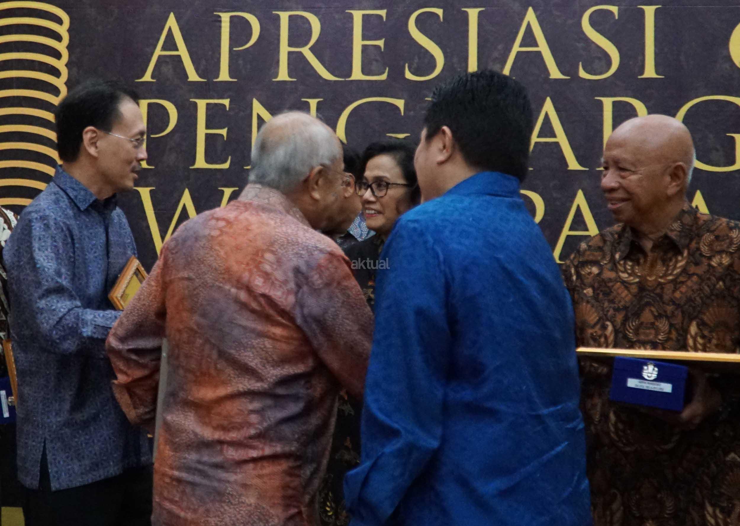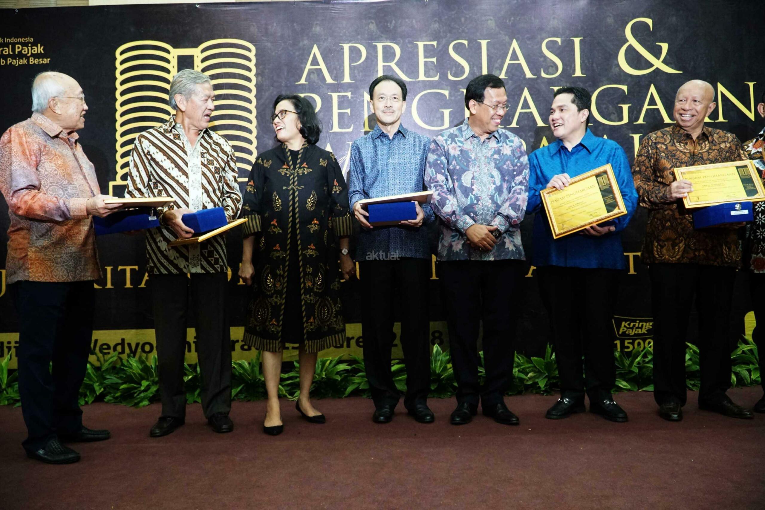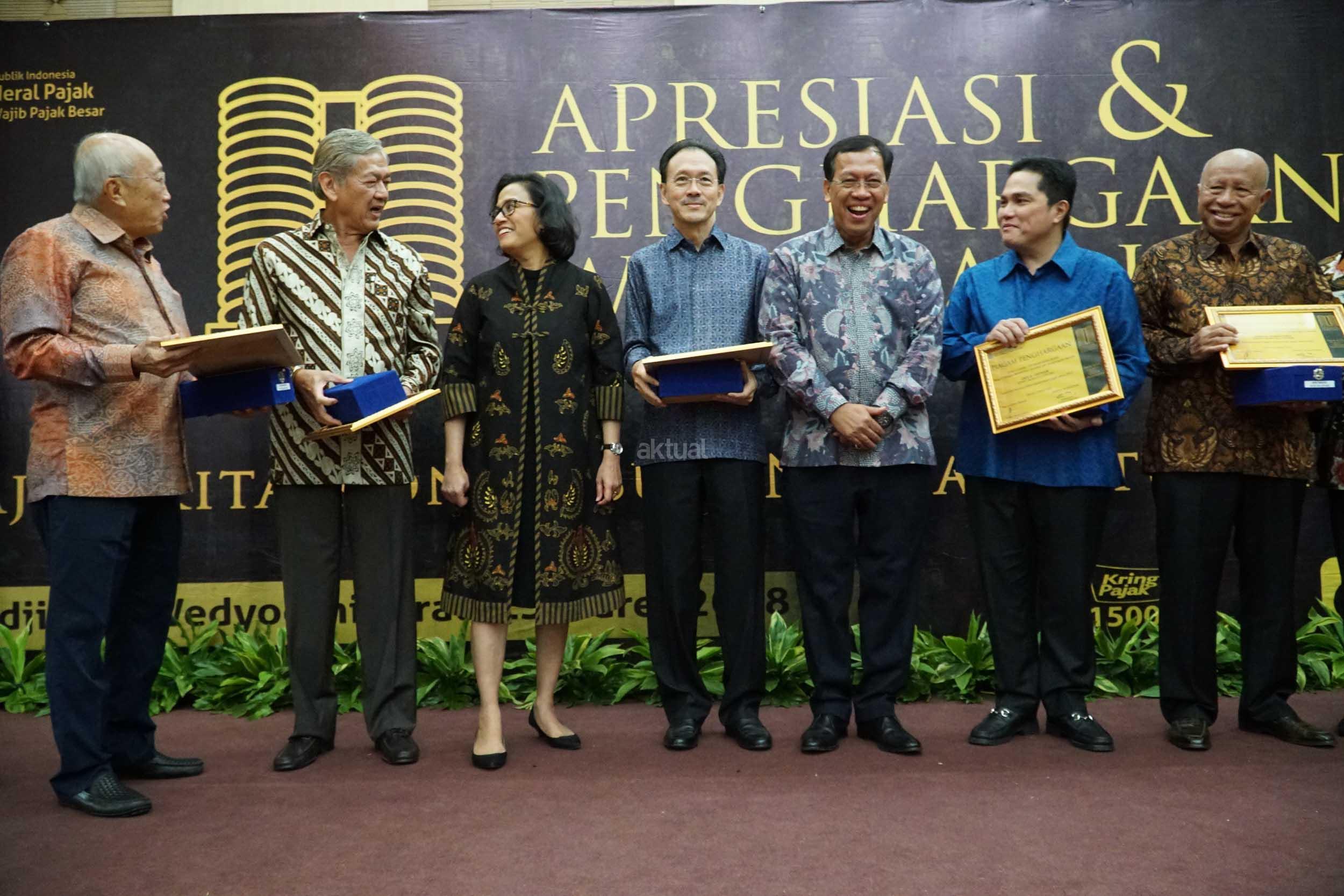 Menteri Keuangan Sri Mulyani (kiri) didampingi Dirjen Pajak Robert Pakpahan (tengah) menyerahkan piagam penghargaan Wajib Pajak kepada Pemilik Medco Group, Arifin Panigoro dan para wajib pajak lainnya di Gedung Radjiman Wedyodiningrat, Jakarta, Selasa (13/3). Sebanyak 31 wajib pajak besar meraih apresiasi dan penghargaan atas kepatuhan terhadap peraturan perpajakan dan pencapaian target penerimaan Kanwil DJP Wajib Pajak Besar di tahun 2017.Pada tahun 2017, besarnya realisasi penerimaan pajak Kanwil DJP Wajib Pajak Besar mencapai Rp 361,84 triliun.Di Tahun 2018 ini, target penerimaan Kanwil DJP Wajib Pajak Besar adalah sebesar Rp 432,37 Triliun yang berarti tumbuh 19,54% dibanding realisasi tahun 2017.Pencapaian target penerimaan Kanwil DJP Wajib Pajak Besar tahun 2018 akan mendukung 30,33% target nasional, yaitu sebesar Rp 1.424 triliun. AKTUAL/Eko S Hilman