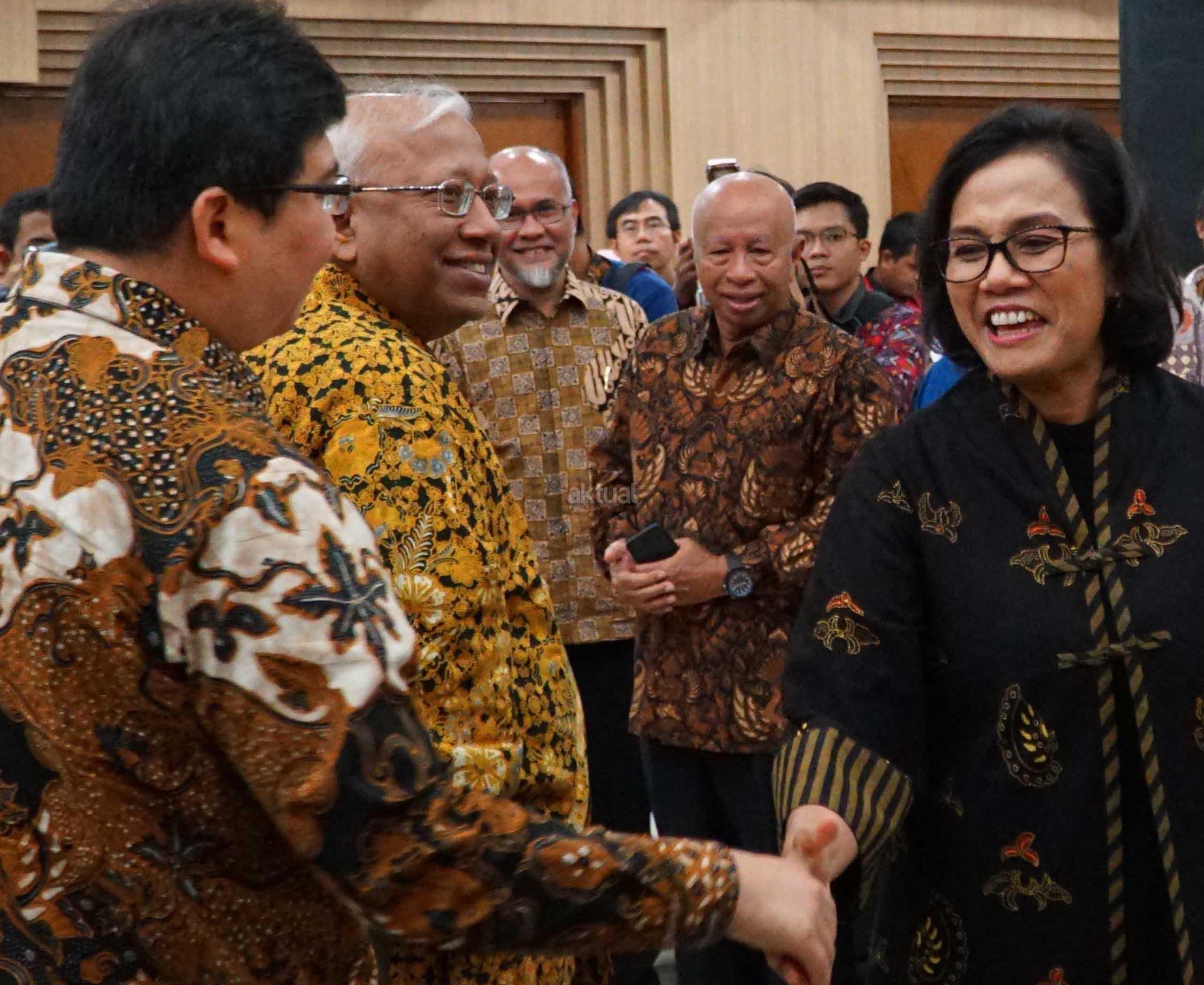 Menteri Keuangan Sri Mulyani (kanan) menyalami para wajib pajak seusai menyerahkan piagam penghargaan Wajib Pajak di Gedung Radjiman Wedyodiningrat, Jakarta, Selasa (13/3). Sebanyak 31 wajib pajak besar meraih apresiasi dan penghargaan atas kepatuhan terhadap peraturan perpajakan dan pencapaian target penerimaan Kanwil DJP Wajib Pajak Besar di tahun 2017. AKTUAL/Eko S Hilman