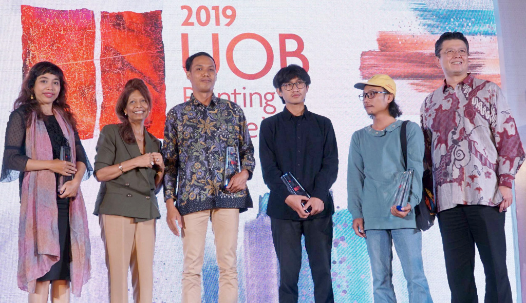 Wakil Presiden Direktur UOB Indonesia Hendra Gunawan (kanan), Chief Woman Singapore Chamber of Commerc Noor Meurling memberikan trophy pemenang untuk kategori perupa profesional kompetisi kepada Pemenang lomba UOB Painting of the year 2019 Anagard saat malam penghargaan UOB Painting Of The Year 2019 (Indonesia) di Jakarta, Kamis (17/10).