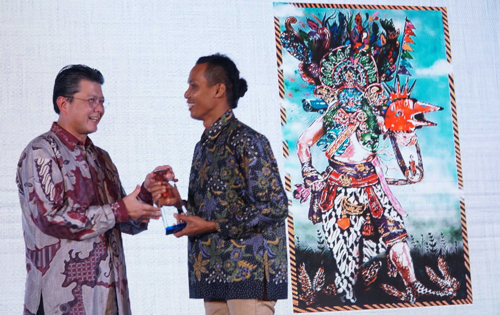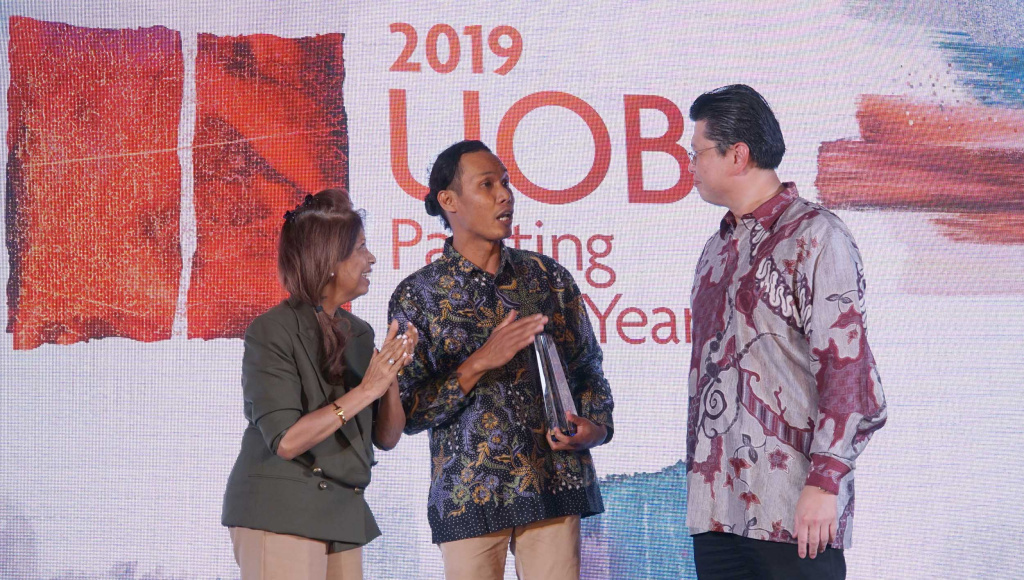 Wakil Presiden Direktur UOB Indonesia Hendra Gunawan (kiri) memberikan trophy pemenang untuk kategori perupa profesional kompetisi kepada Pemenang lomba UOB Painting of the year 2019 Anagard saat malam penghargaan UOB Painting Of The Year 2019 (Indonesia) di Jakarta, Kamis (17/10).