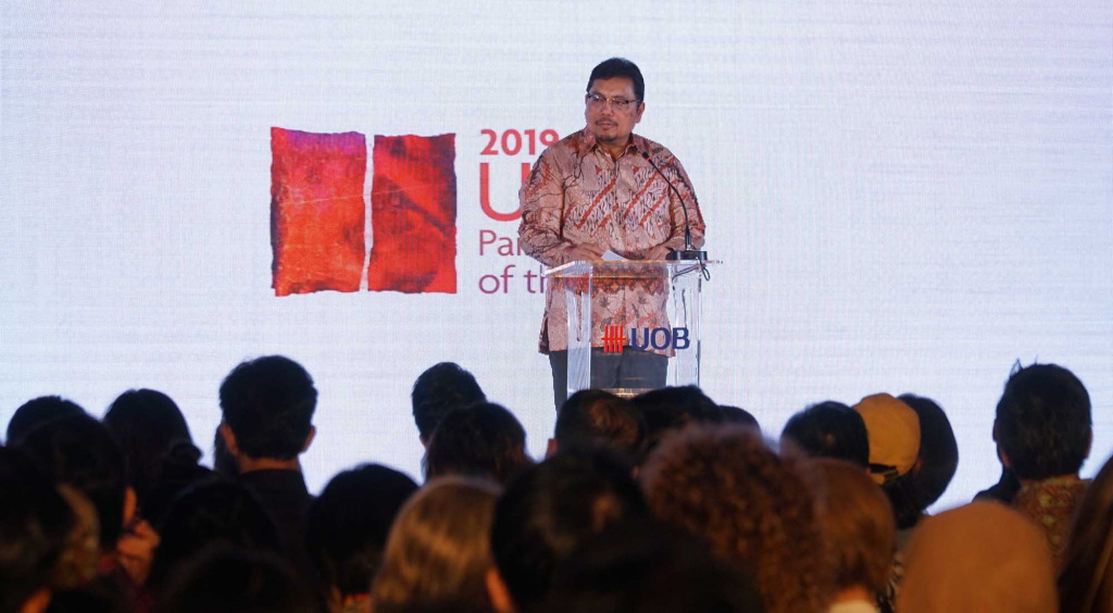 Perupa muda dari Yayasan Daya Pelita Kasih Gunottama (kedua kanan) menyerahkan lukisan karyanya kepada Sekretaris Jenderal Kementrian Keuangan RI Hadiyanto (kanan) disaksikan oleh Senior VP Strategic Communications & Brand Head UOB Indonesia Maya Rizano (kiri) dan Wakil Presiden Direktur UOB Indonesia Hendra Gunawan (kedua kiri) di acara Malam Penganugerahan "UOB Painting of the Year 2019" Museum Nasional, Jakarta, Kamis (17/10). PT Bank UOB Indonesia menganugerahkan penghargaan UOB Painting Of The Year 2019 kepada Anagard untuk karyanya yang berjudul "Welcome Perdamaian, Goodbye Kedengkian" Karya Lukisan pemenang lomba UOB Painting of the year 2019 Hendra Gunawan, menggambarkan arsitektur unik dari rumah ibadah Bukit Rhema, yang memiliki atap berbentuk kepala merpati sebagai simbol perdamaian, untuk mempresentasikan multikulturalisme dan toleransi di Indonesia. AKTUAL/STR-Eko S Hilman
