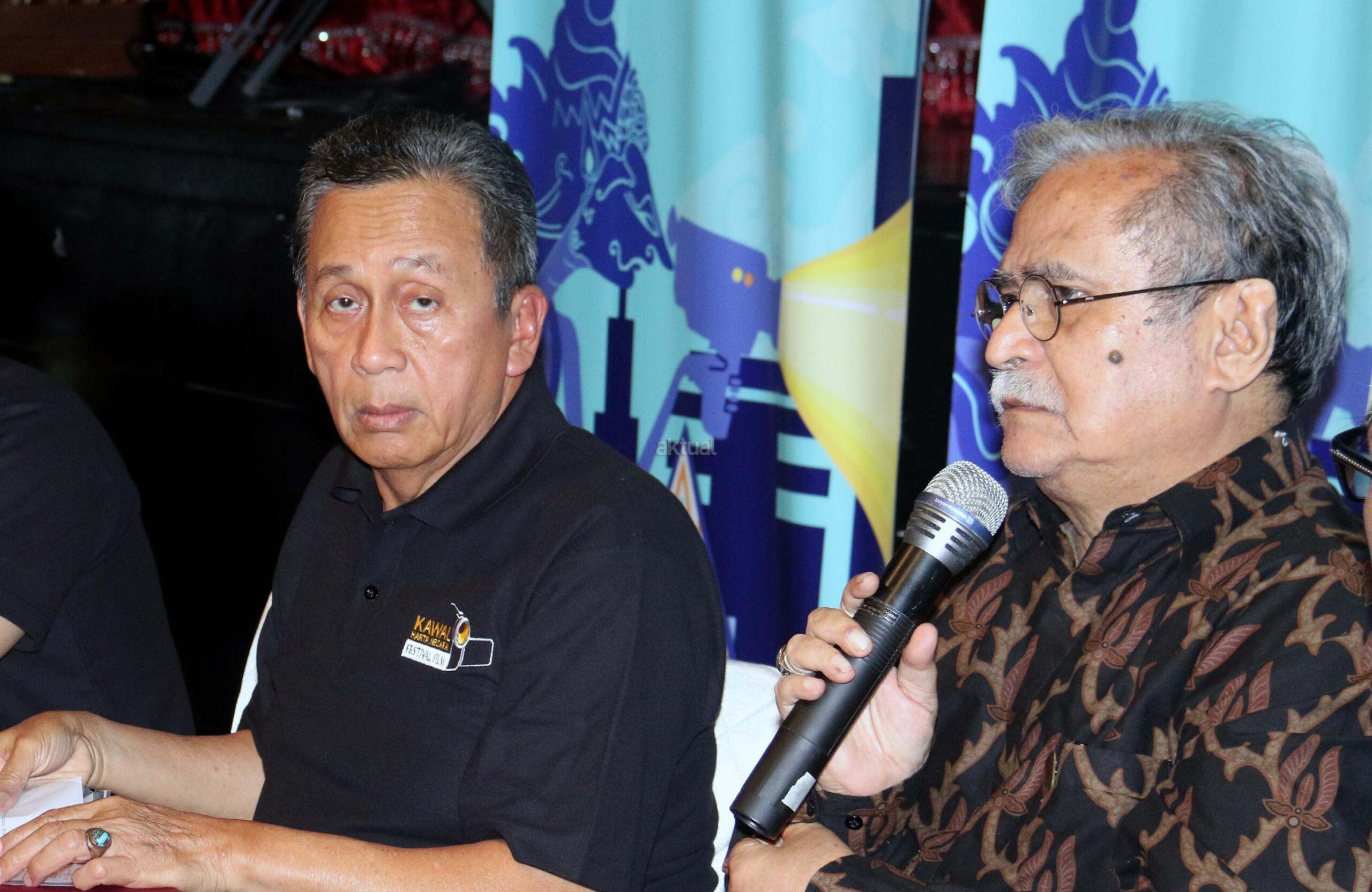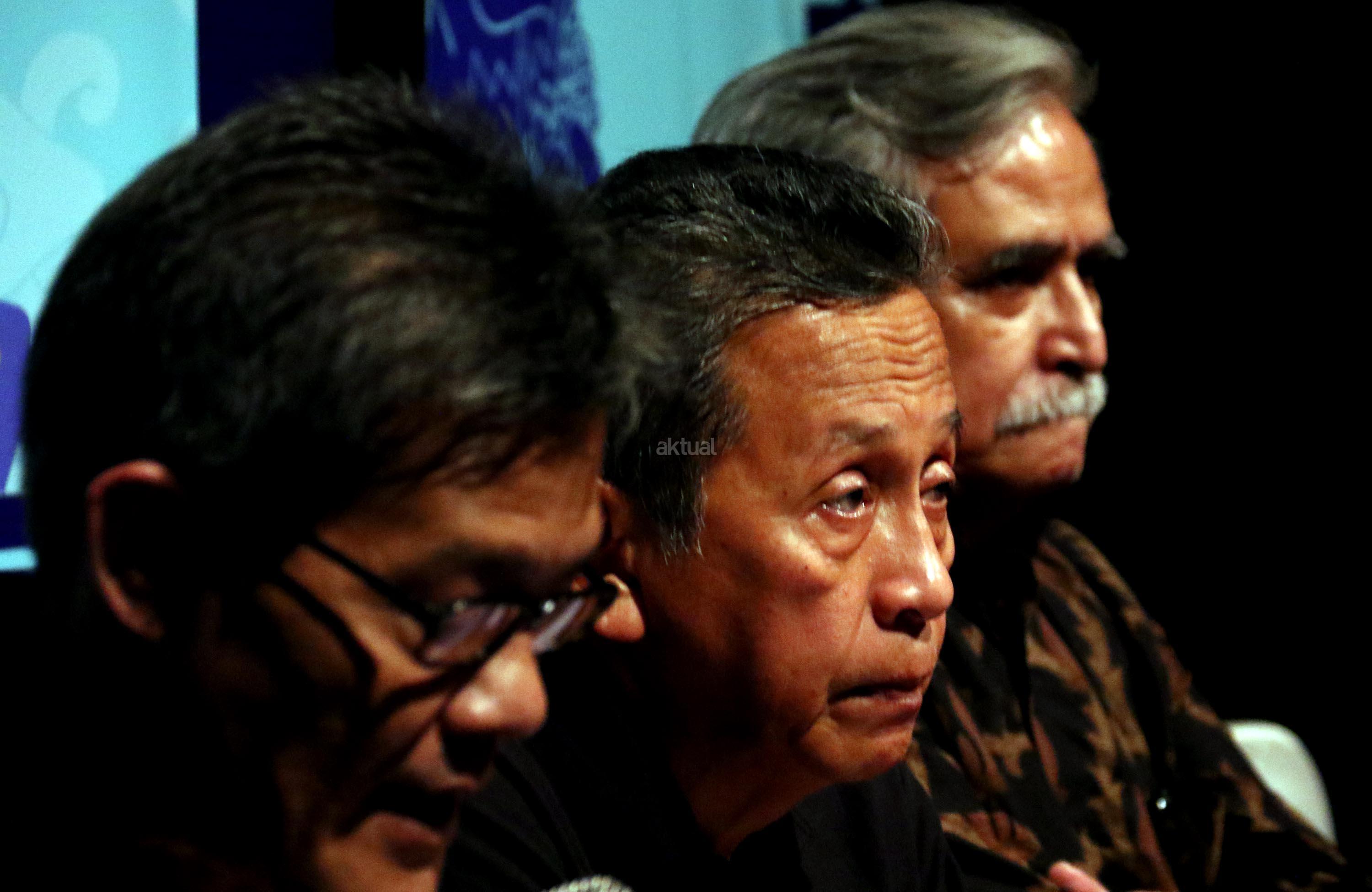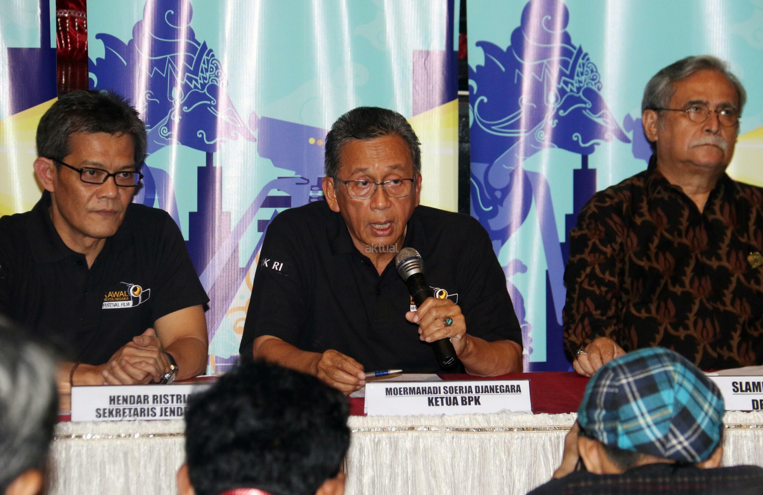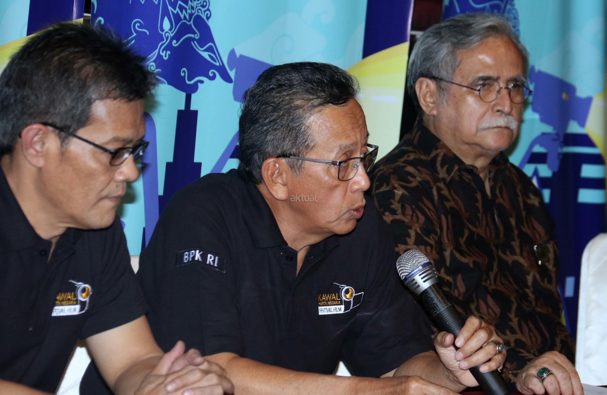 Ketua BPK RI Moehamadi Soerja Djanegara (tengah) memberikan keterengan persnya di dampingi Sekjen BPK RI Hendar Ristriawan (kiri) dan Ketua Dewan Juri Festival Film Kawal Harta Negara Slamet Rahardjo Djarot (kanan) terkait pengumuman pemenang Festival Film Kawal Harta Negara (FFKHN) di theater kecil, Taman Ismail Marzuki (TIM), Jakarta, Selasa (29/8/2017), malam. Dalam jumpa persnya BPK RI melakukan pengumuman malam penganugerahan FFKHN 2017 dan menghasilkan 10 film terbaik dari Total semuanya ada 176 karya film dari peserta. Dengan nominasi 23 film. AKTUAL/Munzir