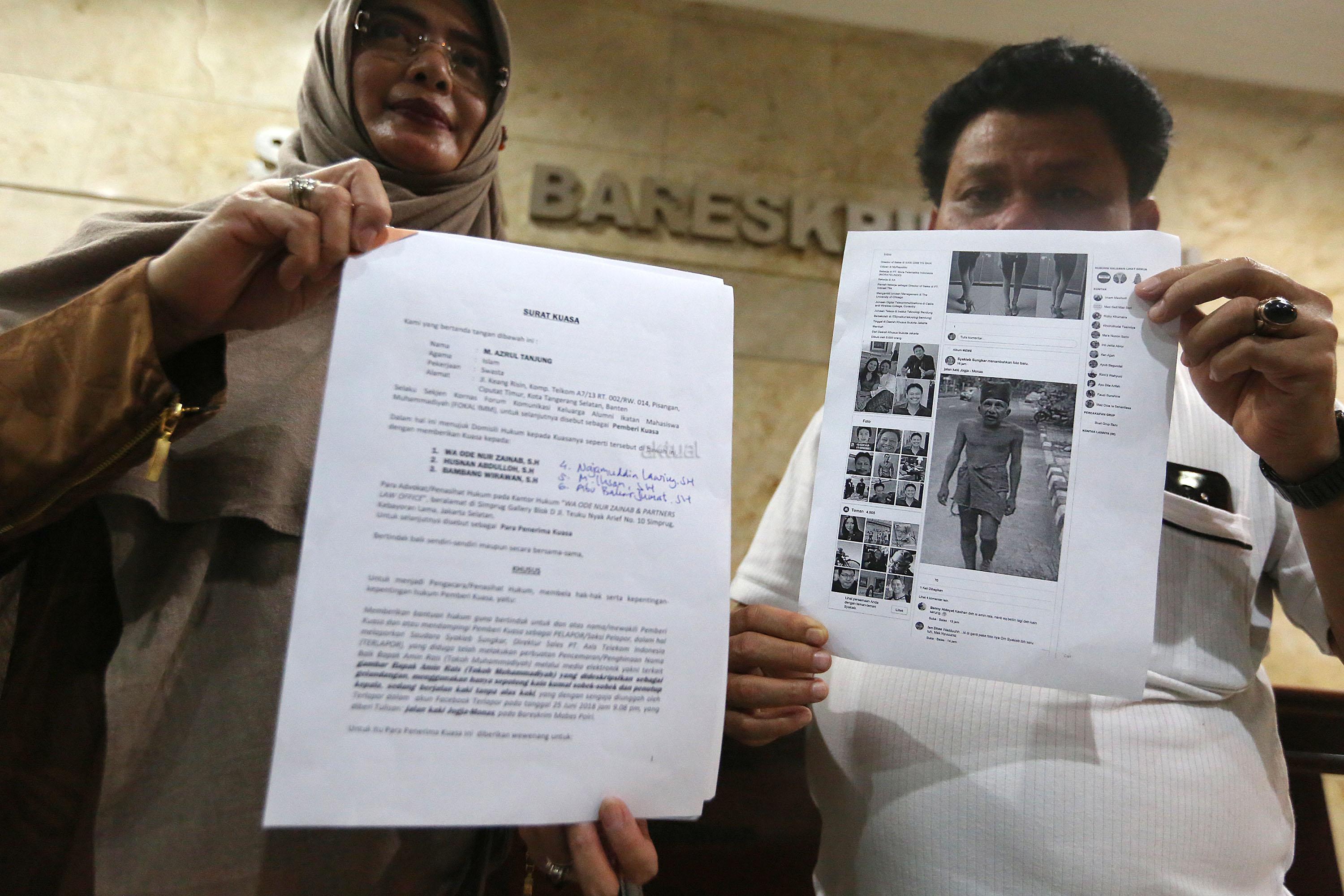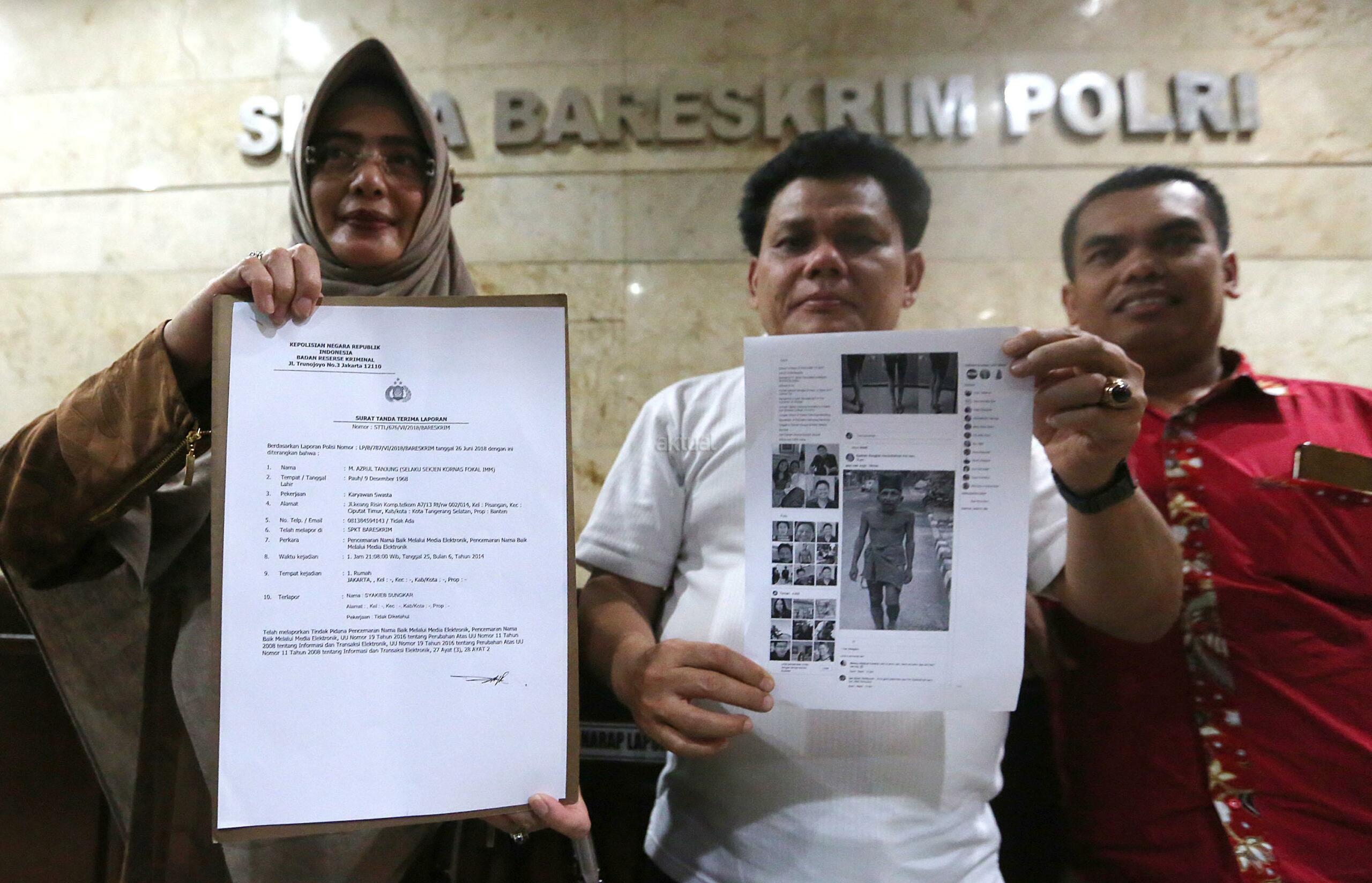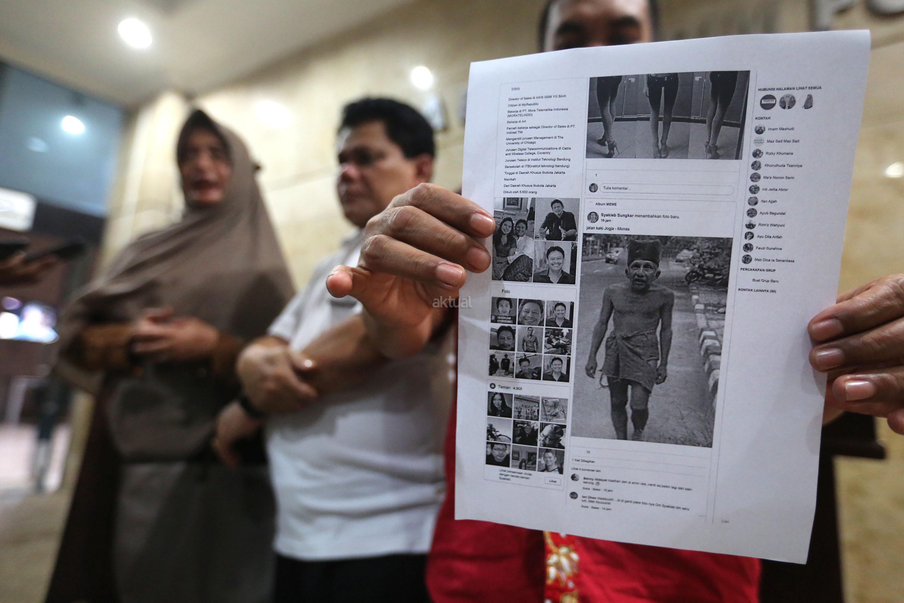 Pengacara menunjukkan meme Amien Rais yang diunggah di akun Facebook Syakieb Sungkar di Gedung Bareskrim Polri Jakarta, Selasa (26/6). Sekjen Forum komunikasi Keluarga Alumni Ikatan Mahasiswa Muhammadiyah (Fokal IMM), Azrul Tanjung melaporkan penyebar meme Amien Rais ke Bareskrim Polri. AKTUAL/Tino Oktaviano