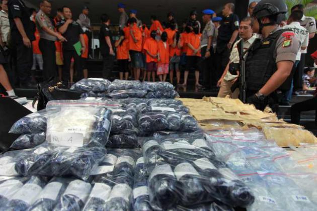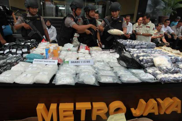 Petugas Dir Resnarkoba Polda Metro Jaya menata barang bukti saat akan gelar Pengungkapan Narkotika Jenis Sabu dan Ekstasi Jaringan Internasional di Polda Metro Jaya, Jakarta, Rabu (9/9). Ditresnarkoba mengungkap kasus narkotika jaringan internasional yang melibatkan tiga WN Nigeria, tiga WN Tiongkok dan 17 WNI serta barang bukti 115 kg sabu dan 5450 butir ekstasi dengan nilai konversi dalam setara Rp174.500.000. ANTARA FOTO/Muhammad Adimaja/