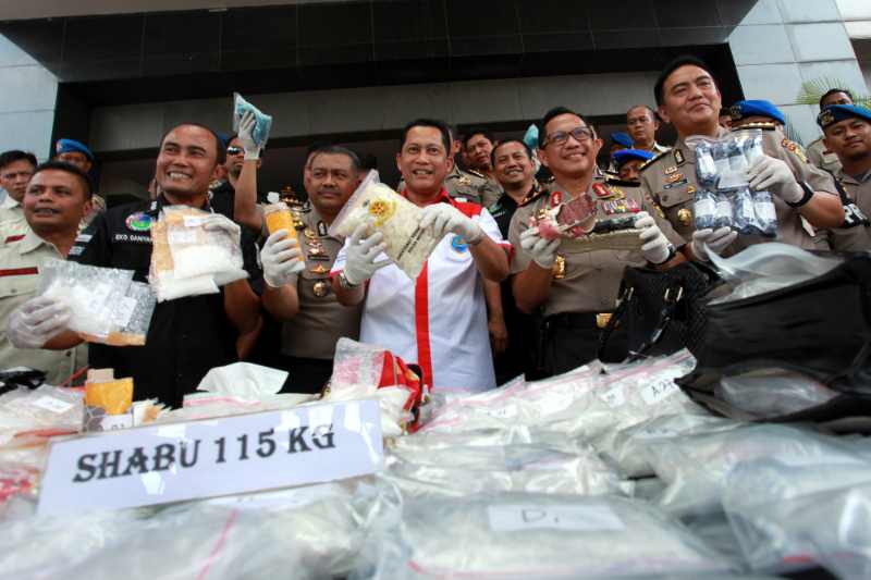 Kapolda Metro Jaya Irjen Pol Tito Karnavian (kedua kanan) bersama Kepala Badan Narkotika Nasional Komjen Pol Budi Waseso (ketiga kanan), Kabid Humas Polda Metro Jaya Kombes Pol M Iqbal (kanan) dan Dir Resnarkoba Polda Metro Jaya Kombes Pol Eko Daniyanto (kiri) menunjukan barang bukti saat gelar Pengungkapan Narkotika Jenis Sabu dan Ekstasi Jaringan Internasional di Polda Metro Jaya, Jakarta, Rabu (9/9). Ditresnarkoba mengungkap kasus narkotika jaringan internasional yang melibatkan tiga WN Nigeria, tiga WN Tiongkok dan 17 WNI serta barang bukti 115 kg sabu dan 5450 butir ekstasi dengan nilai konversi dalam setara Rp174.500.000. ANTARA FOTO/Muhammad Adimaja