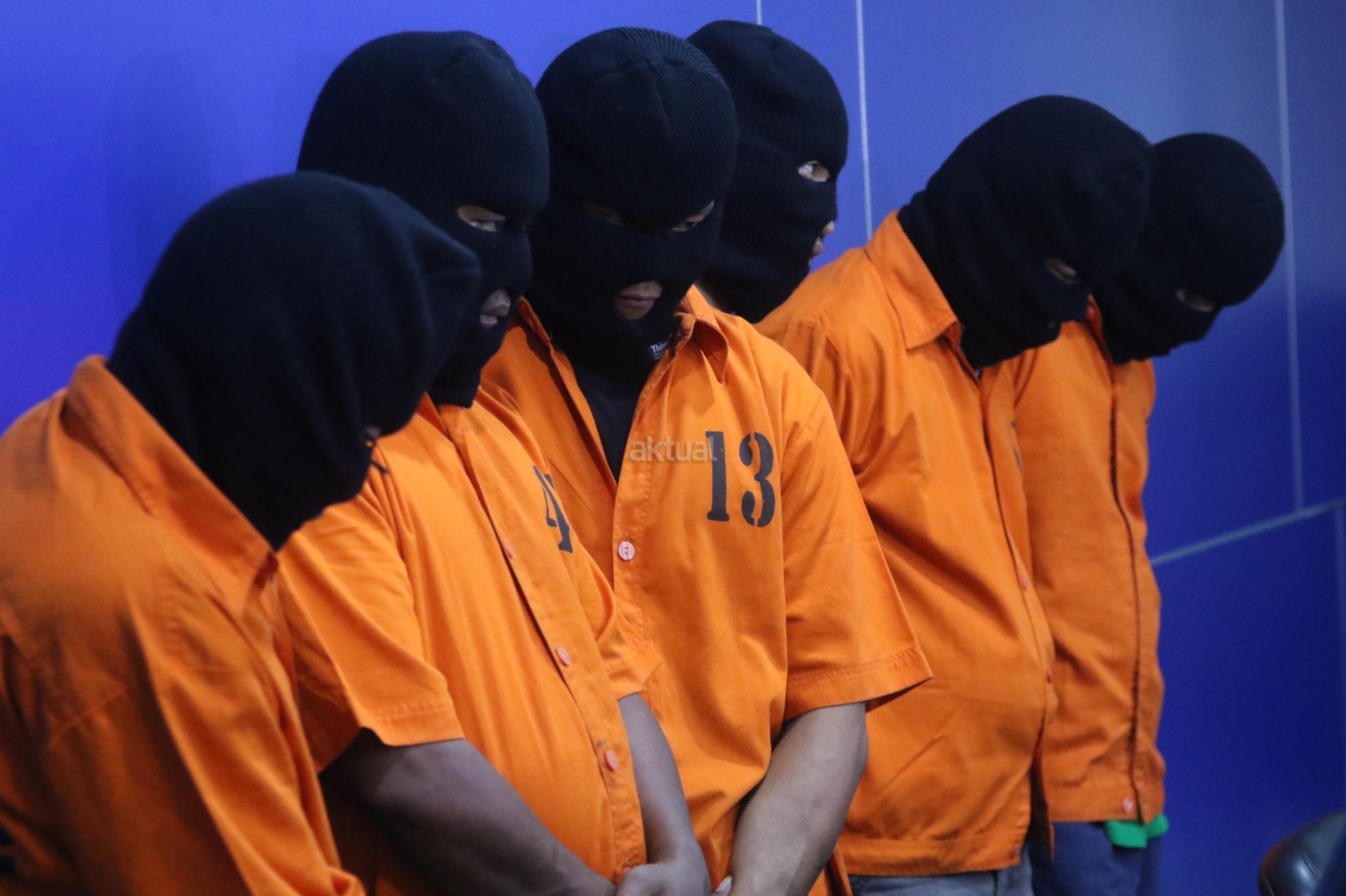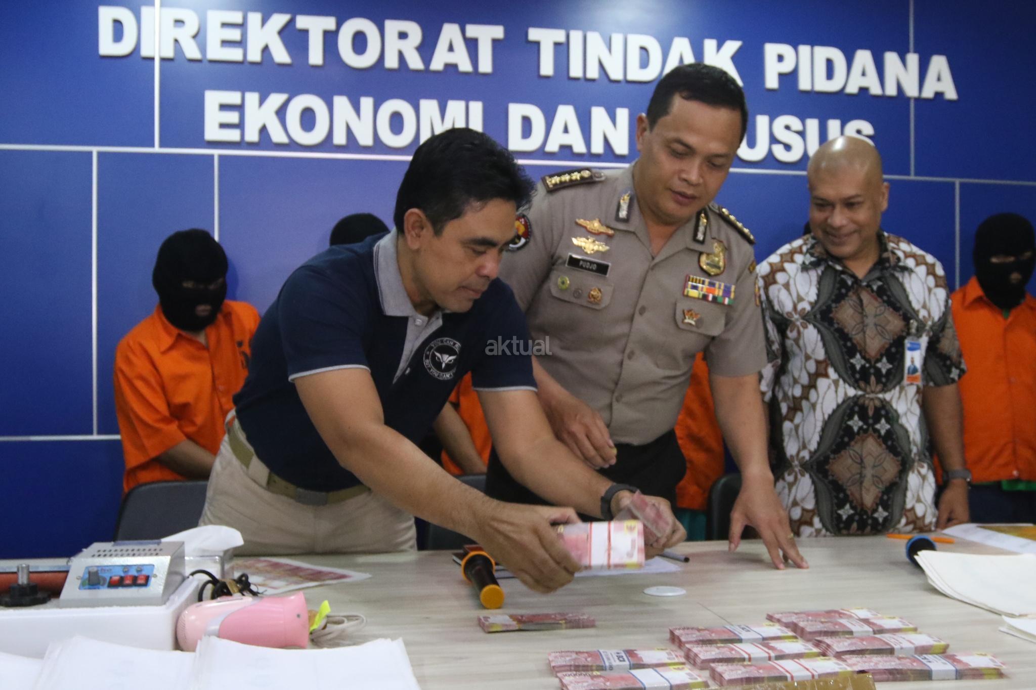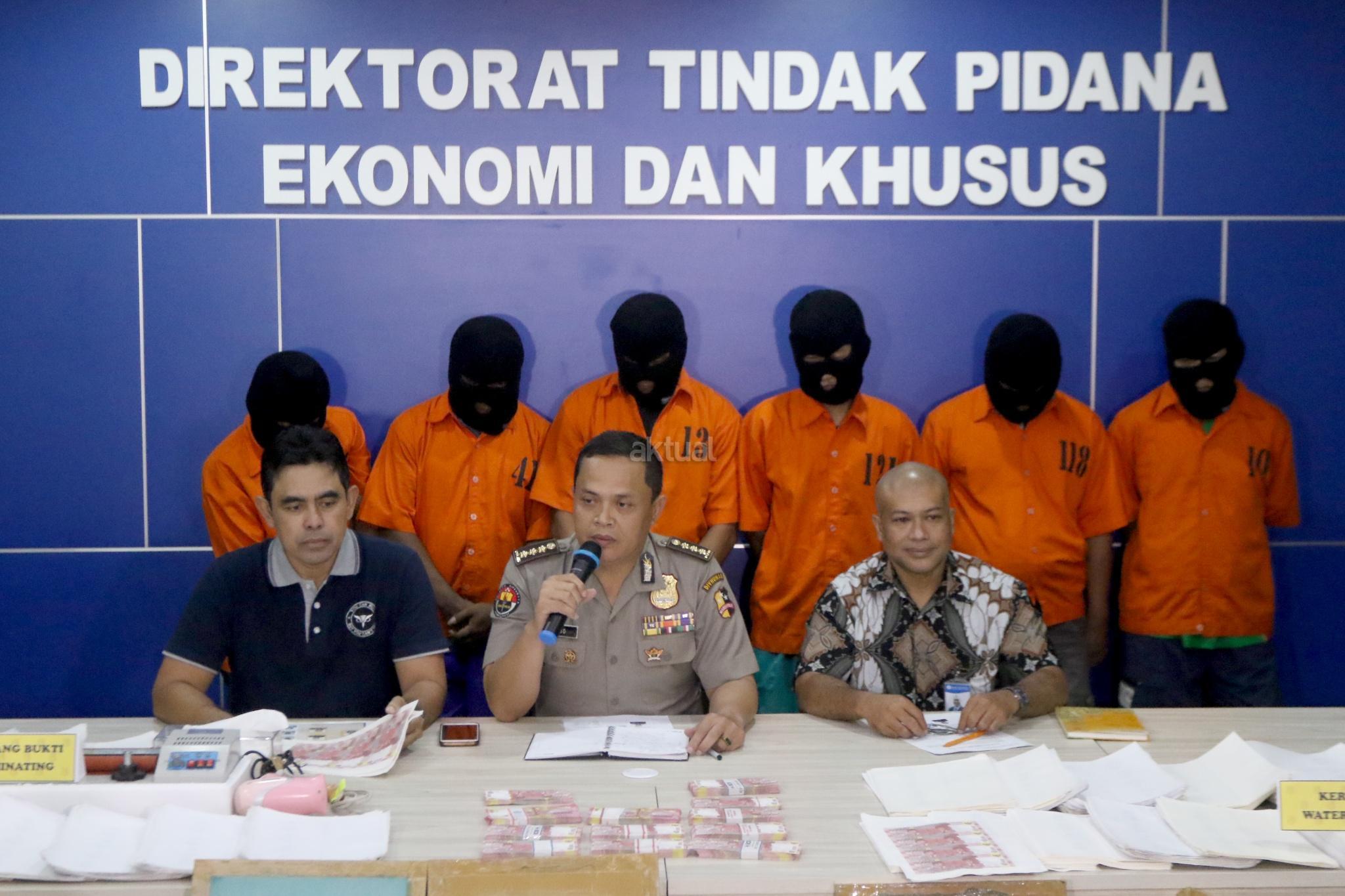 Tersangka dihadirkan saat rilis pengungkapan jaringan pengedar dan pembuat uang palsu di kantor Dittipideksus Bareskirm Polri, Jakarta, Jumat (16/3). Dirtipideksus Bareskirm Polri bersama Bank Indonesia menggagalkan peredaran dan pembuatan uang palsu dengan menangkap enam tersangka dan menyita barang bukti berupa uang palsu siap edar, alat sablon dan sejumlah alat pendukung pembuatan uang palsu. AKTUAL/Tino Oktaviano