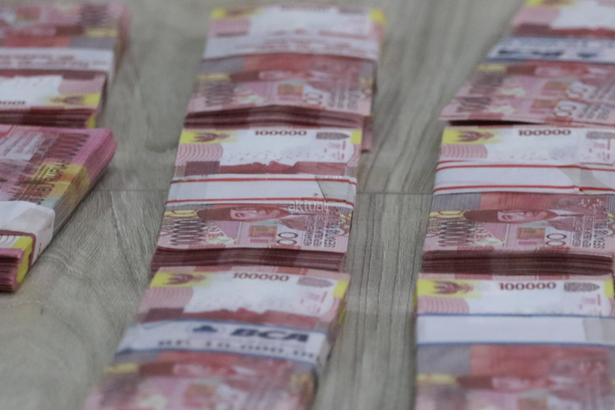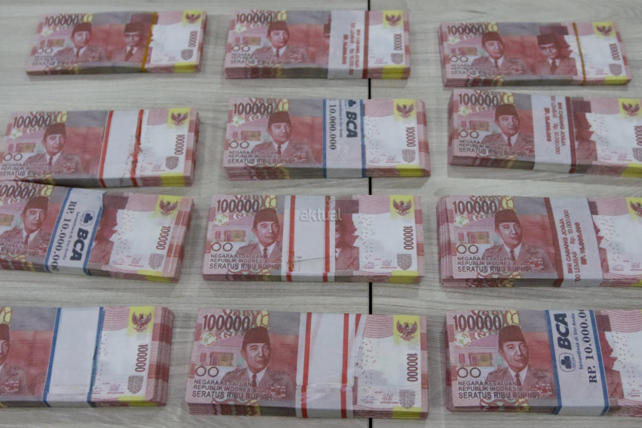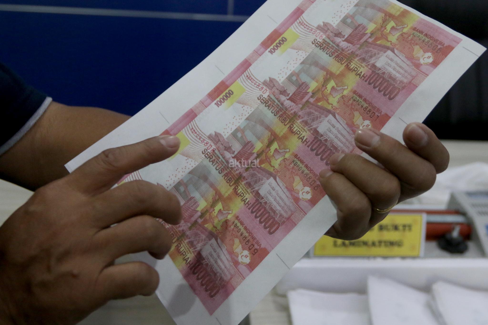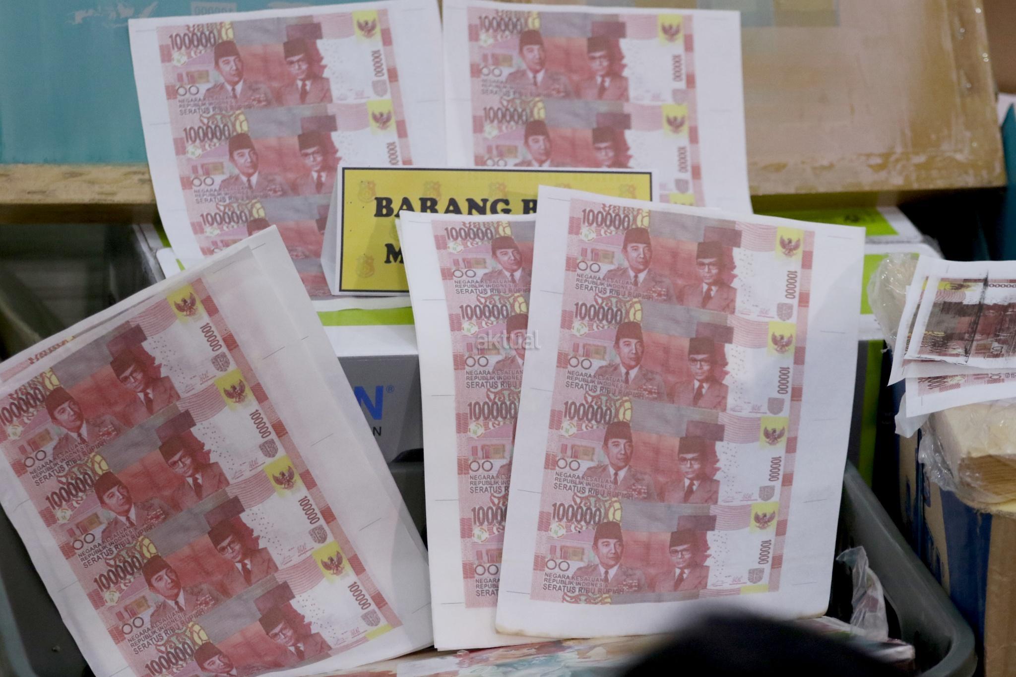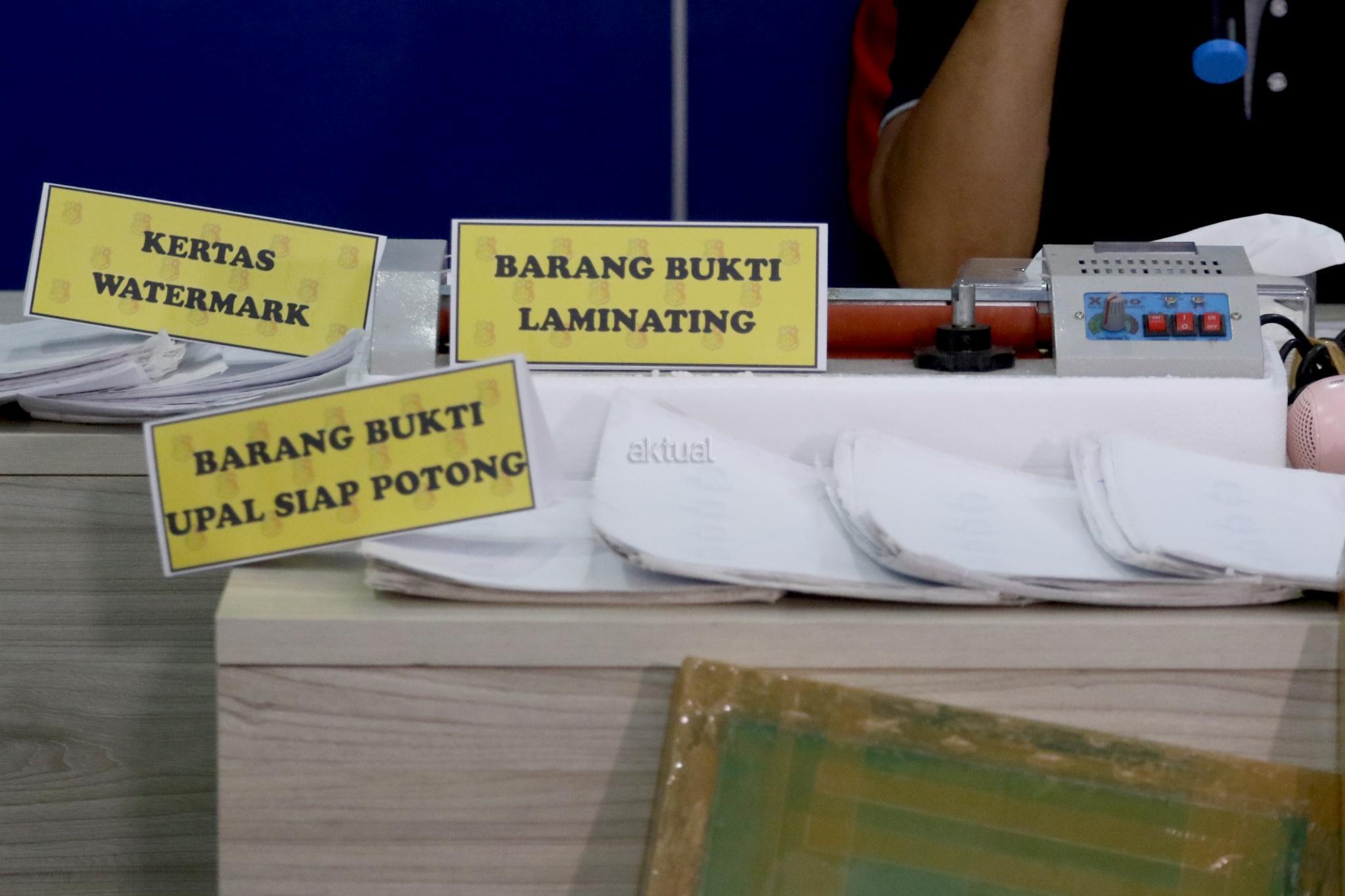 Barang bukti pembuat uang palsu di kantor Dittipideksus Bareskirm Polri, Jakarta, Jumat (16/3). Dirtipideksus Bareskirm Polri bersama Bank Indonesia menggagalkan peredaran dan pembuatan uang palsu dengan menangkap enam tersangka dan menyita barang bukti berupa uang palsu siap edar, alat sablon dan sejumlah alat pendukung pembuatan uang palsu. AKTUAL/Tino Oktaviano