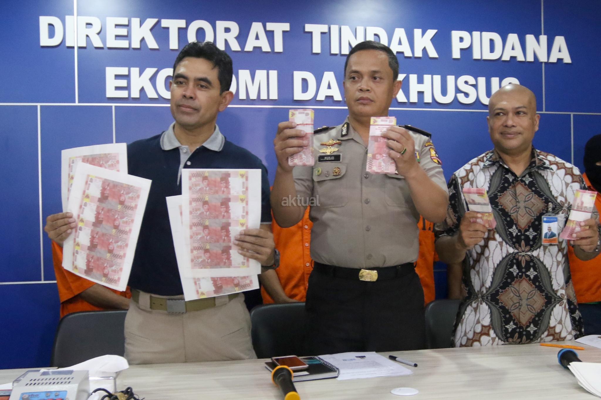Analis Kebijakan Humas Polri Kombes Pol Sulistyo Pudjo (tengah) didampingi Kasubdit Uang Palsu Dirtipideksus Bareskrim Polri Kombes Pol Wisnu Hermawan (kiri) dan Kepala Divisi Penanggulangan Uang Palsu Departemen Pengelolaan Uang BI Asral Mashuri (kanan) memberikan keterangan saat rilis pengungkapan jaringan pengedar dan pembuat uang palsu di kantor Dirtipideksus Bareskirm Polri, Jakarta, Jumat (16/3). Dirtipideksus Bareskirm Polri bersama Bank Indonesia menggagalkan peredaran dan pembuatan uang palsu dengan menangkap enam tersangka dan menyita barang bukti berupa uang palsu siap edar, alat sablon dan sejumlah alat pendukung pembuatan uang palsu. AKTUAL/Tino Oktaviano