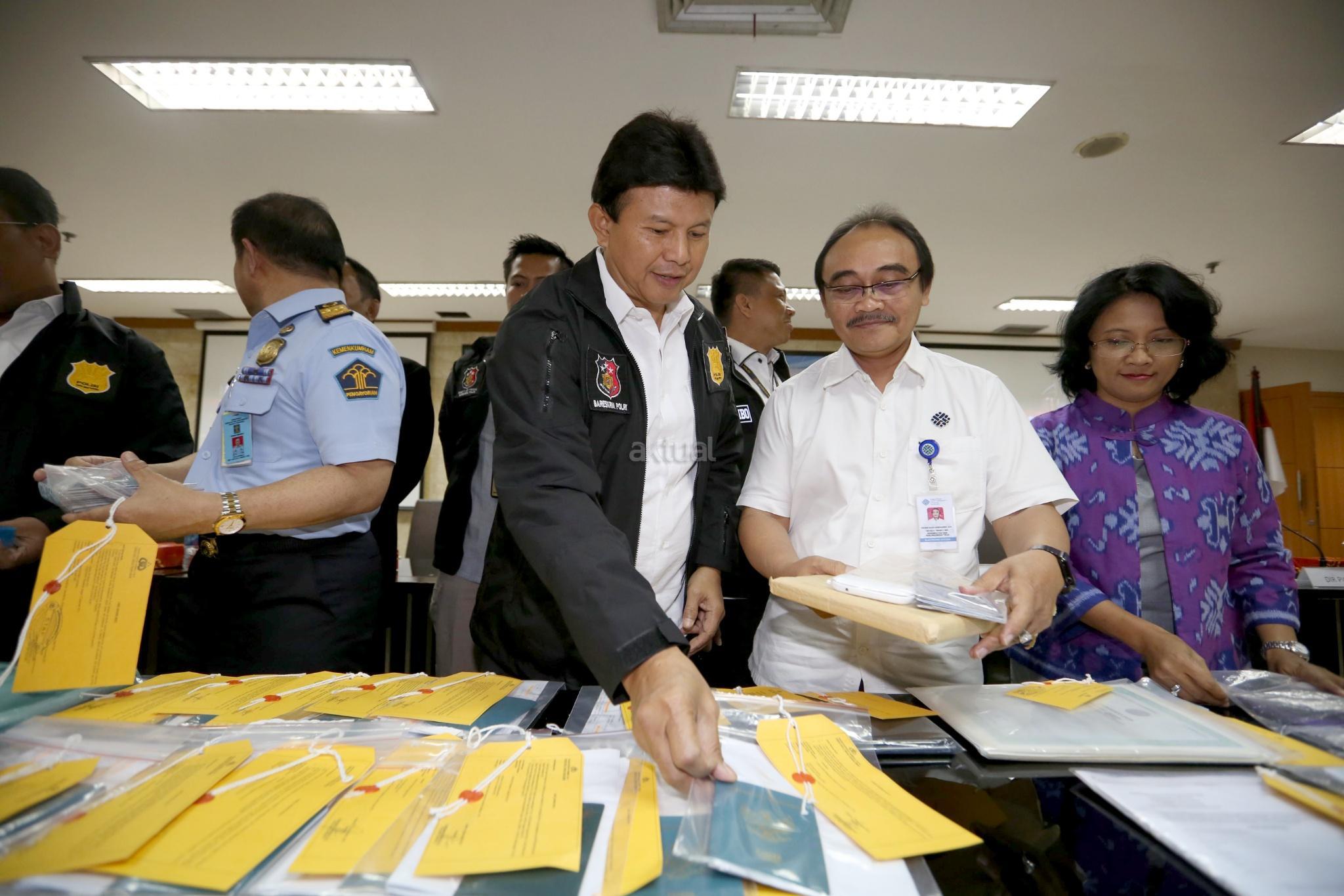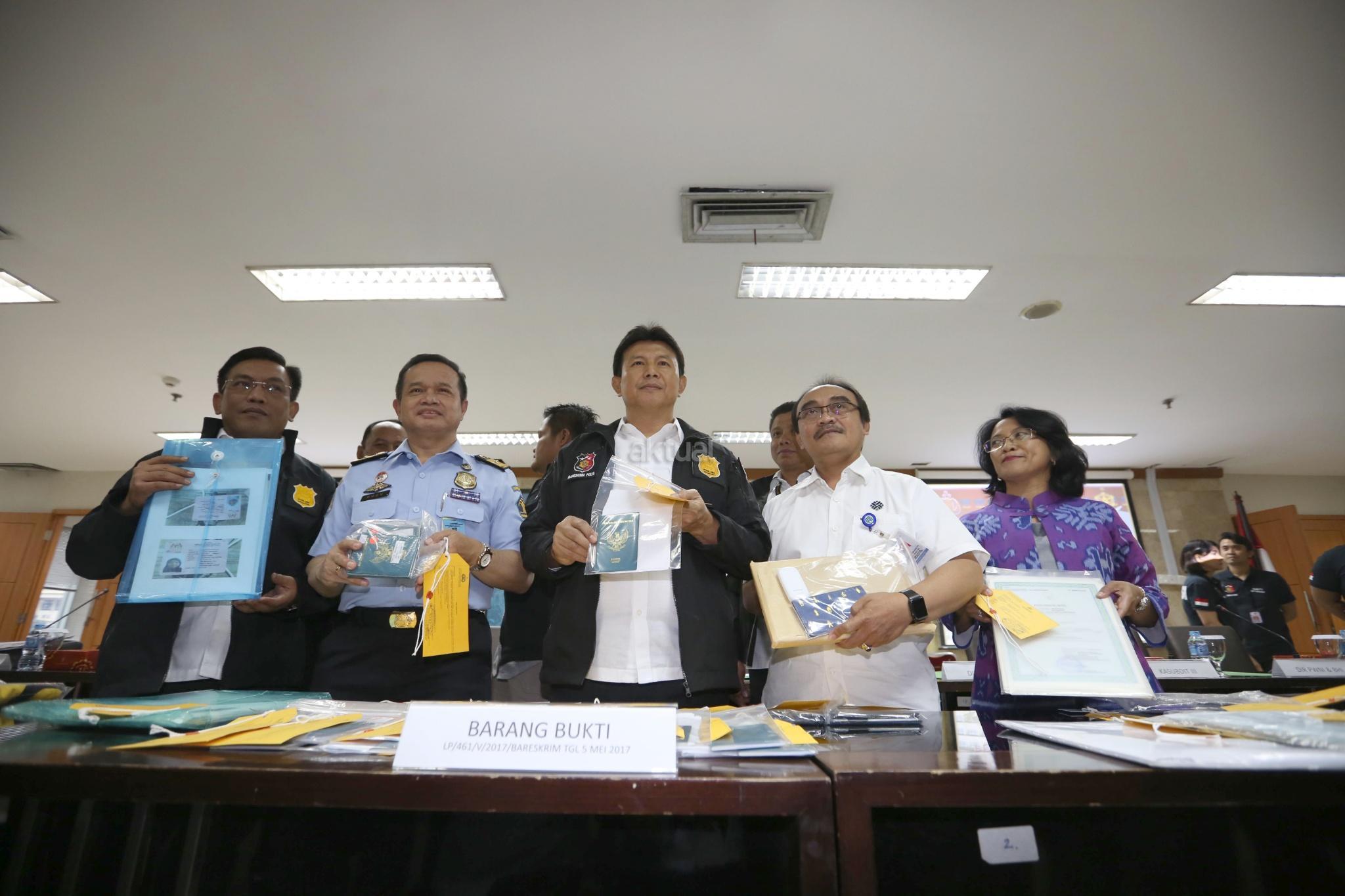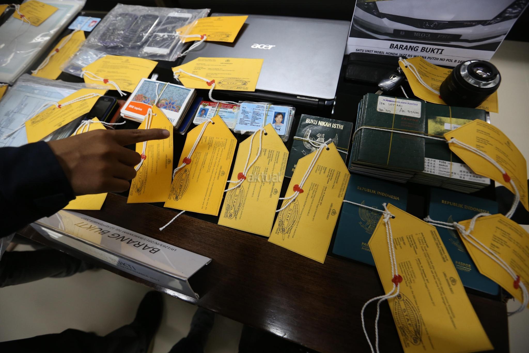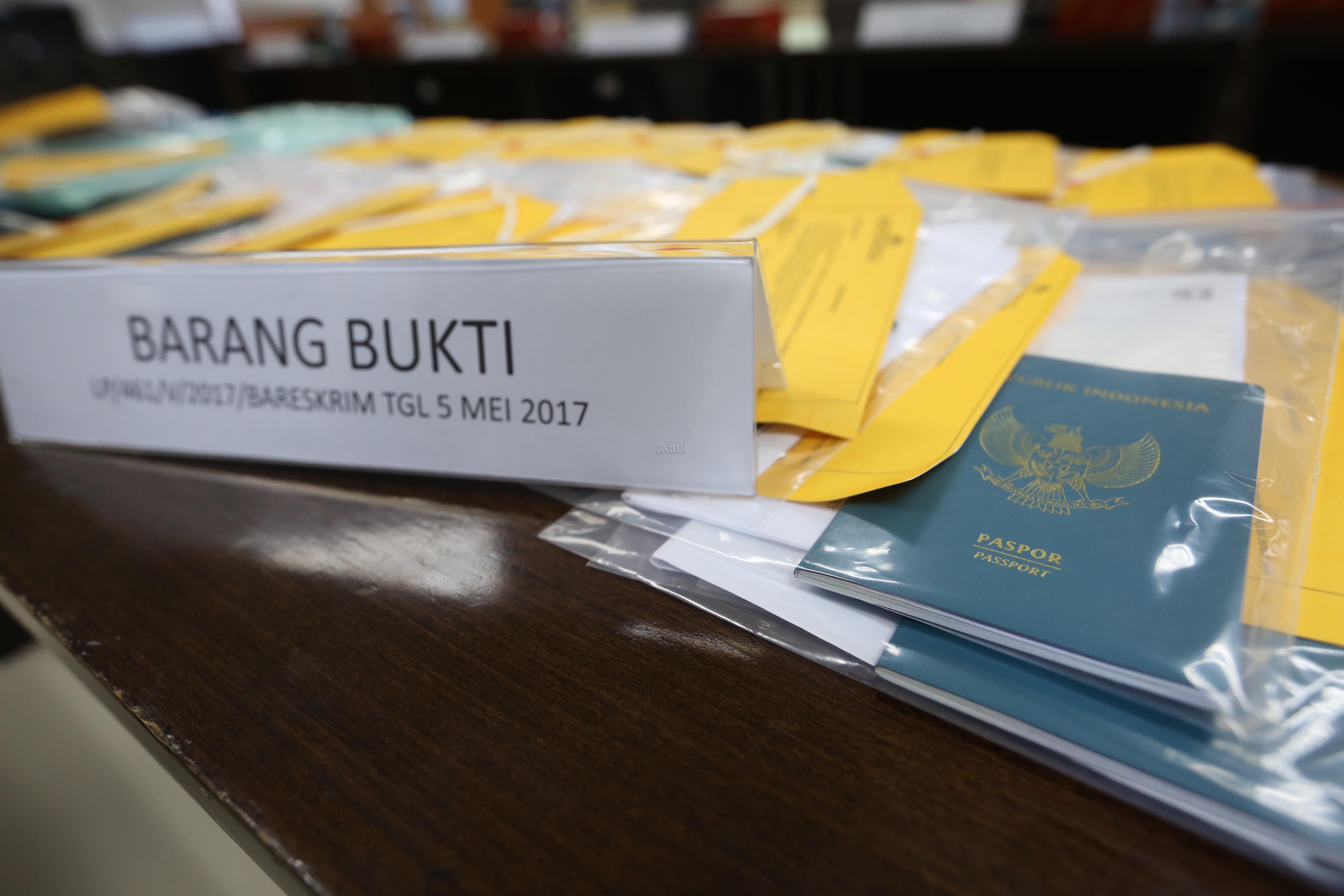 Sejumlah barang bukti diperlihatkan saat rilis pengungkapan kasus tindak pidana perdagangan orang di Jakarta, Kamis (21/12). Bareskrim Mabes Polri berhasil melakukan pengungkapan kasus tindak pidana perdagangan orang jaringan Arab Saudi, Jaringan Asia Pasifik dan Jaringan China dengan mengamankan 7 orang tersangka beserta sejumlah barang bukti. AKTUAL/Tino Oktaviano