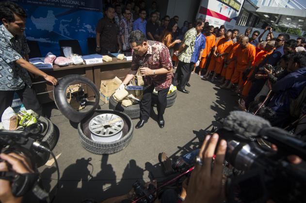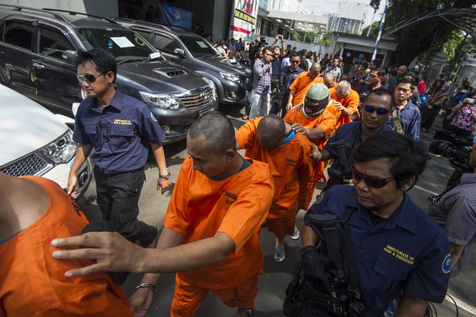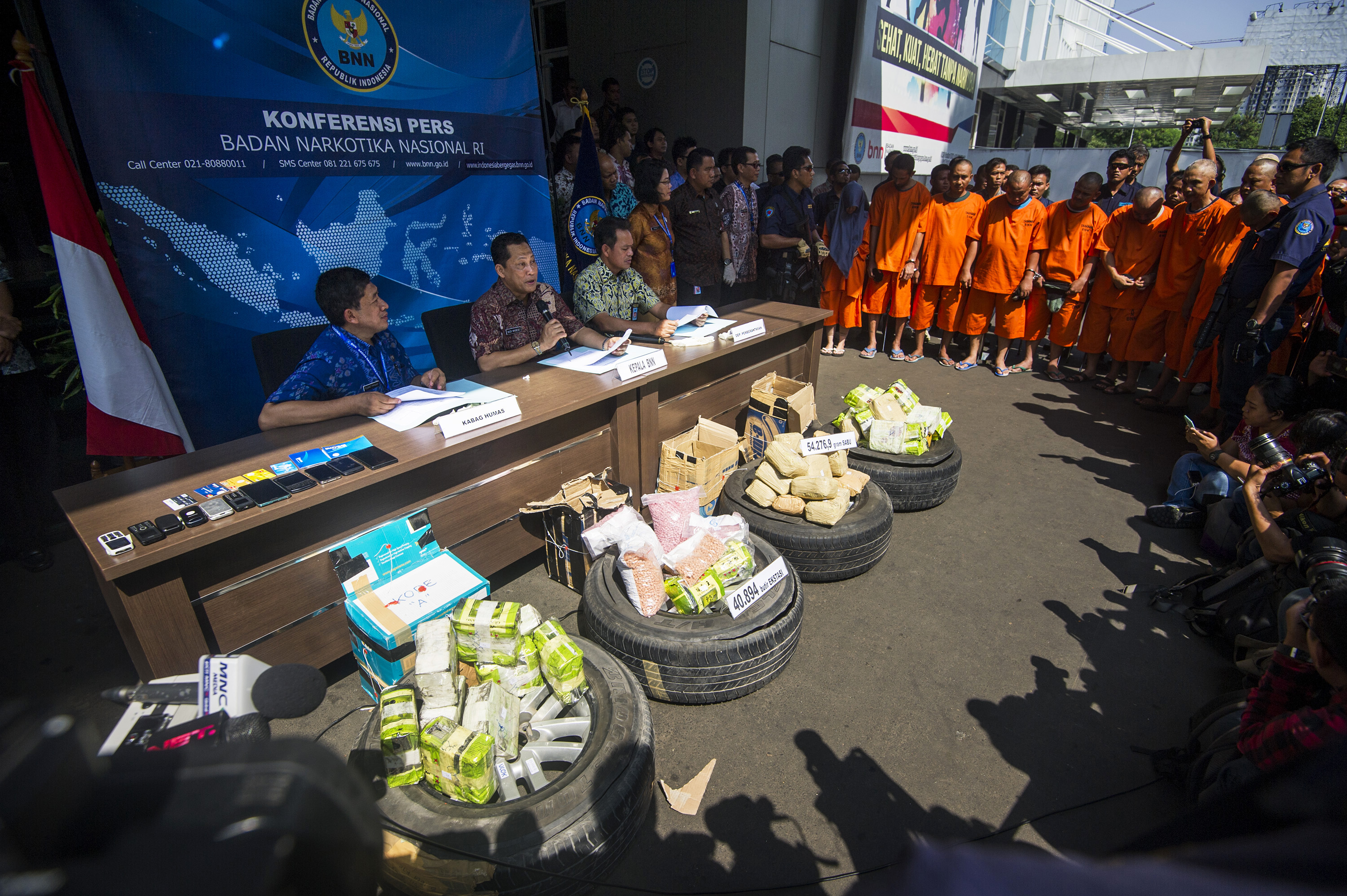 Petugas BNN mengawal para pelaku dalam rilis pengungkapan jaringan sindikat narkotika internasional di Kantor BNN, Jakarta Timur, Jumat (13/5). BNN berhasil meringkus sembilan orang pelaku warga negara Indonesia dan mengamankan barang bukti sabu seberat 54,2 kg serta pil ekstasi sebanyak 40.894 butir dari Malaysia yang akan diedarkan di Indonesia dengan cara diselipkan dalam ban serep mobil. ANTARA FOTO/Sigid Kurniawan/aww/16.