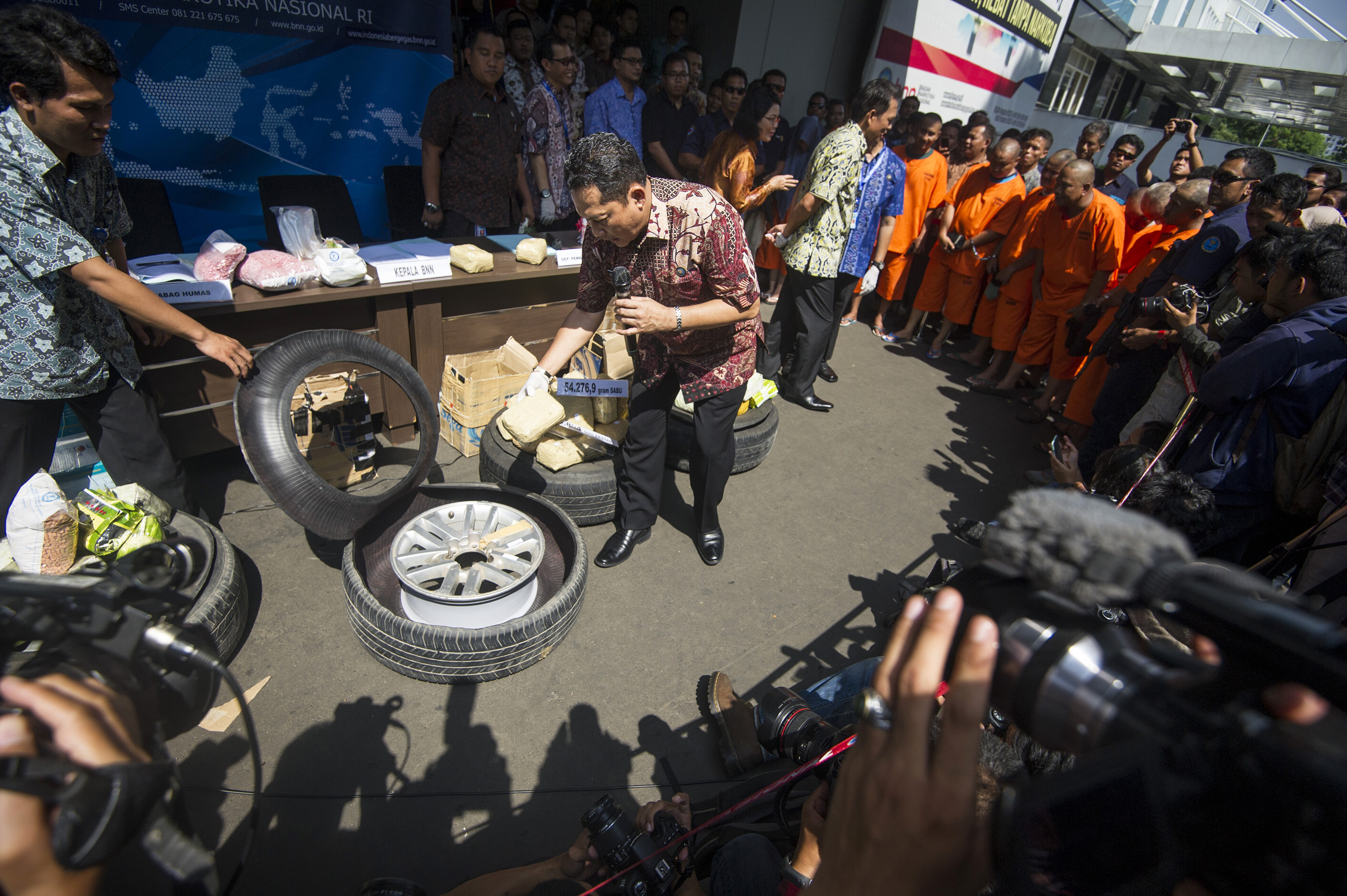 Kepala BNN Komjen Pol Budi Waseso (kiri) menunjukkan barang bukti dan pelaku dalam rilis pengungkapan jaringan sindikat narkotika internasional di Kantor BNN, Jakarta Timur, Jumat (13/5). BNN berhasil meringkus sembilan orang pelaku warga negara Indonesia dan mengamankan barang bukti sabu seberat 54,2 kg serta pil ekstasi sebanyak 40.894 butir dari Malaysia yang akan diedarkan di Indonesia dengan cara diselipkan dalam ban serep mobil. ANTARA FOTO/Sigid Kurniawan/aww/16.