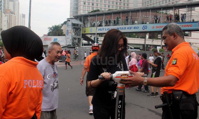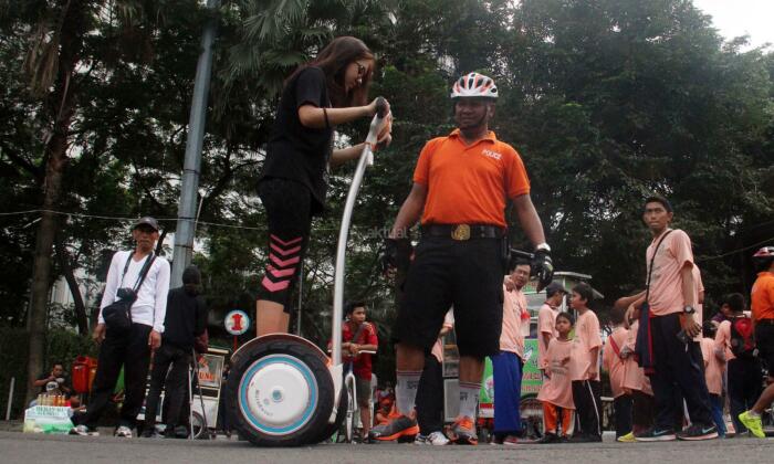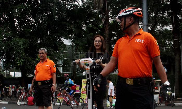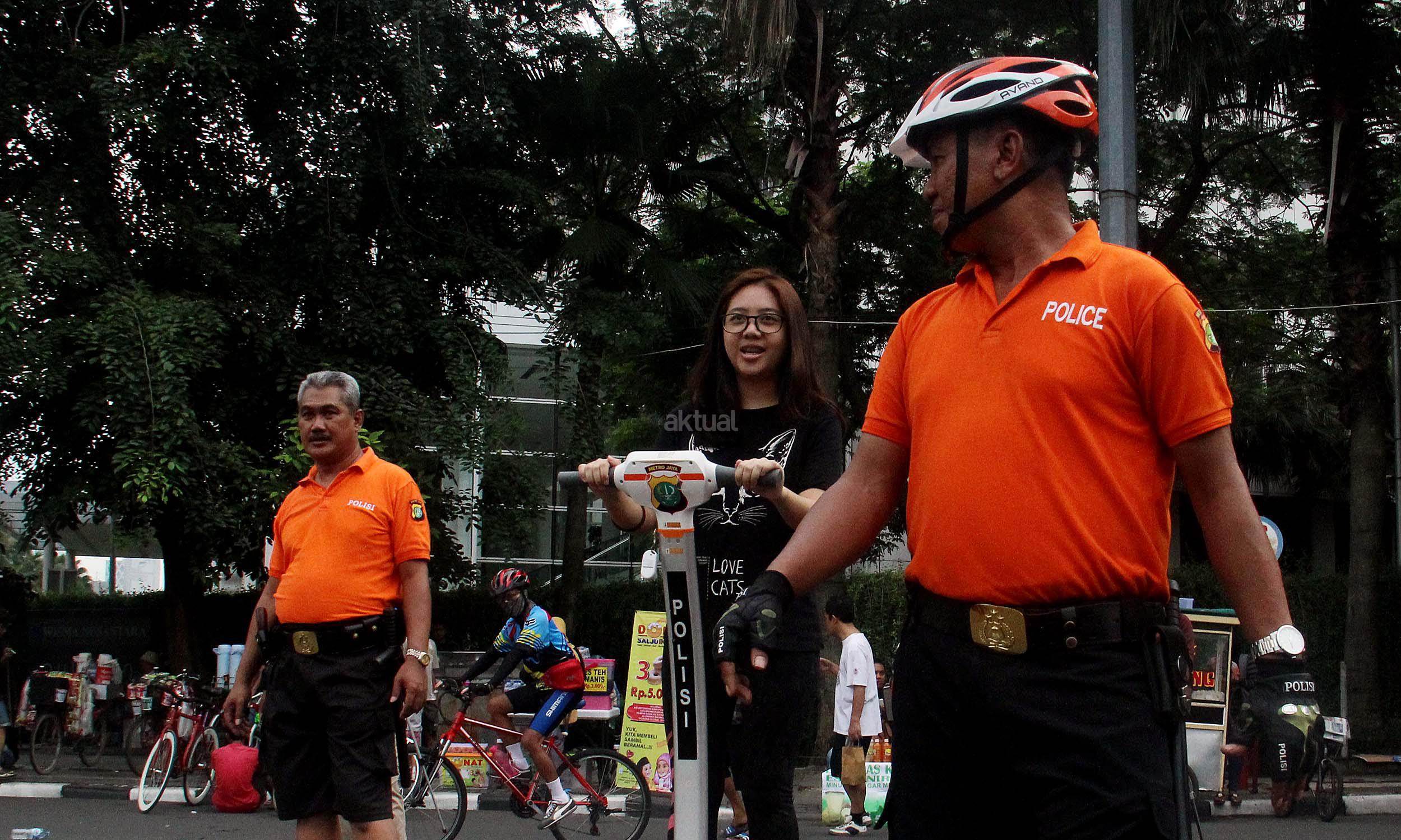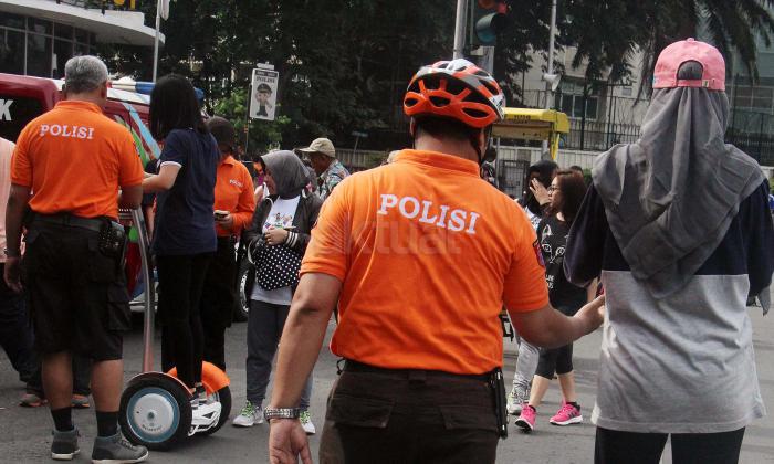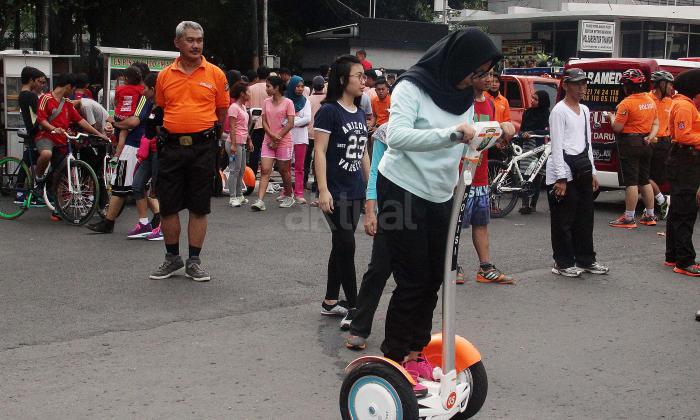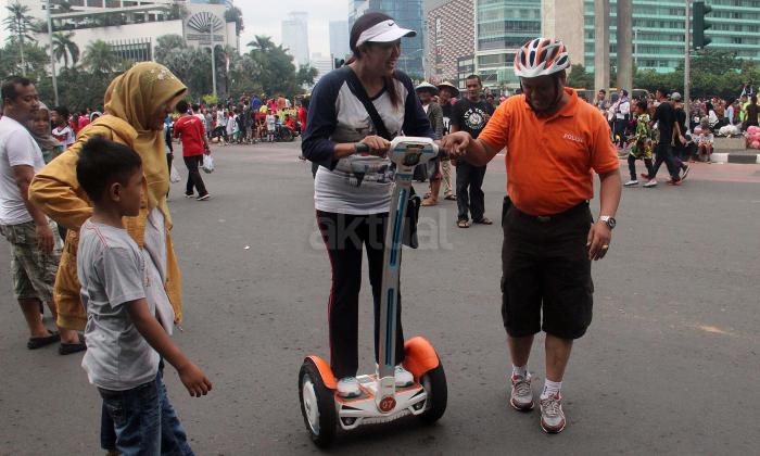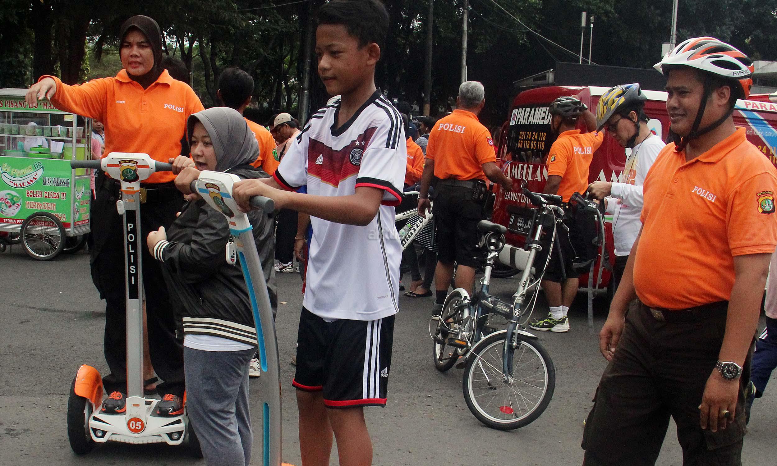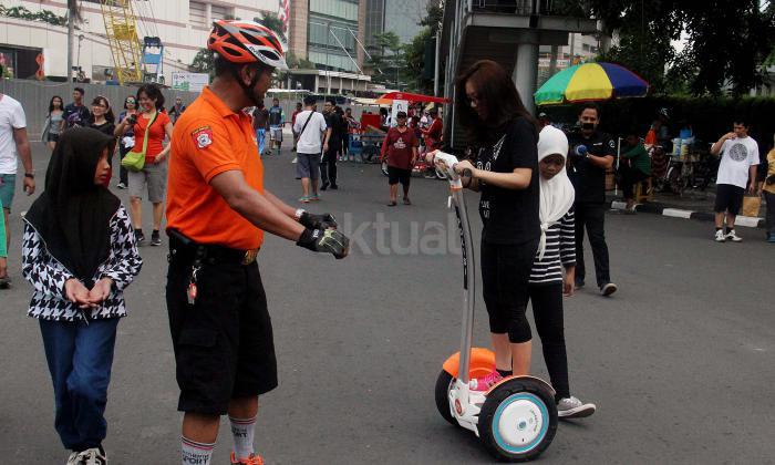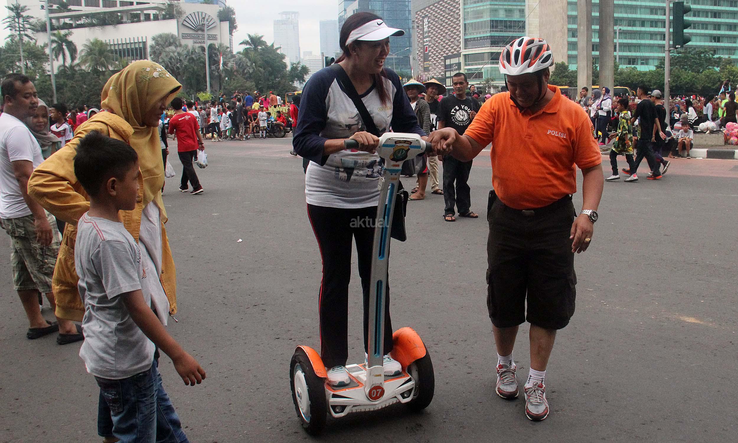 Pengunjung car free day mencoba kendaraan listrik Segway yang dioperasikan Pam Obvit Polda Metro Jaya di Bunderan HI, Jakarta (29/5/2016). Segway adalah kendaraan bagi anggota Direktorat Pengamanan Objek Vital sebagai upaya untuk mempercepat manuver dalam rangka pengamanan car free day.