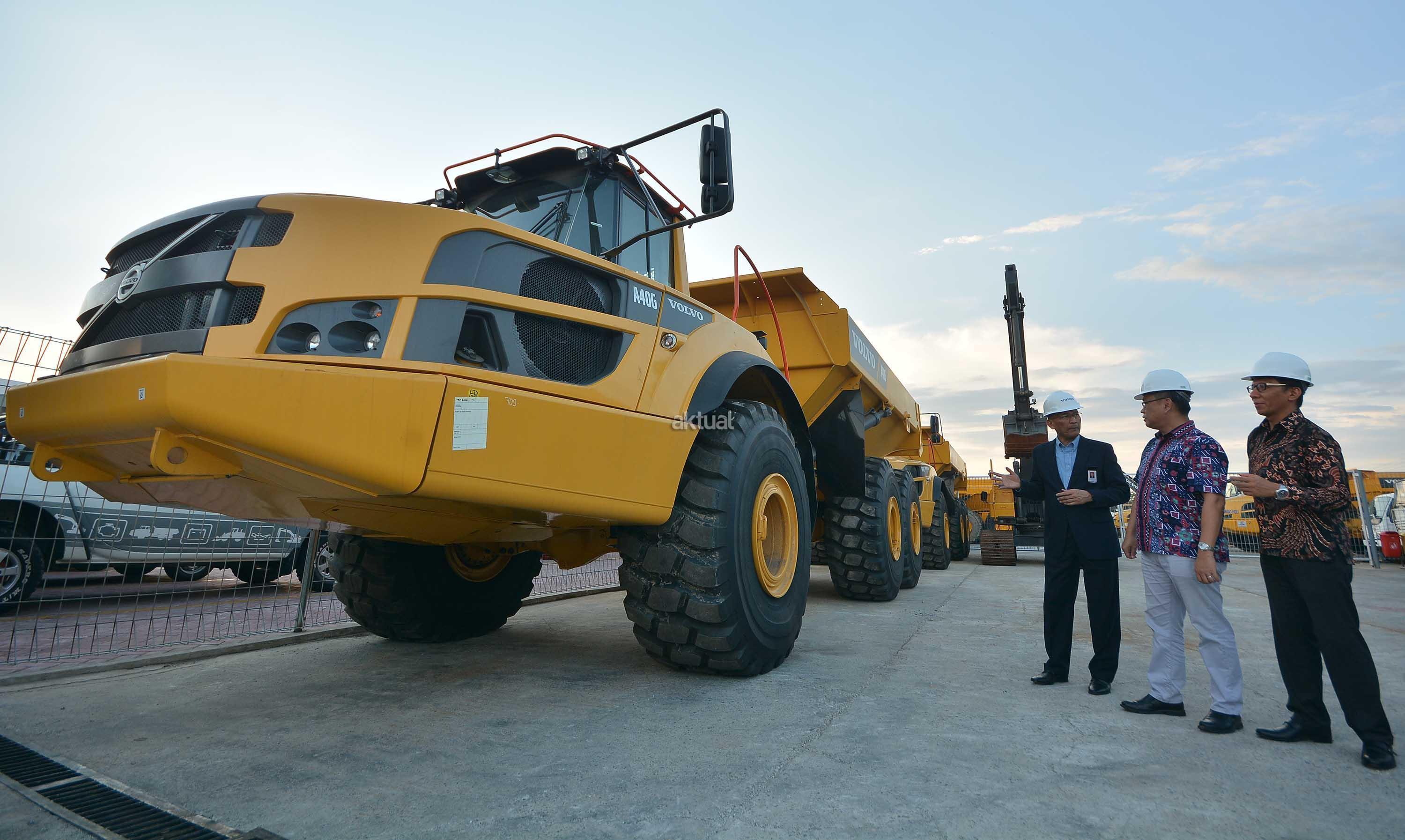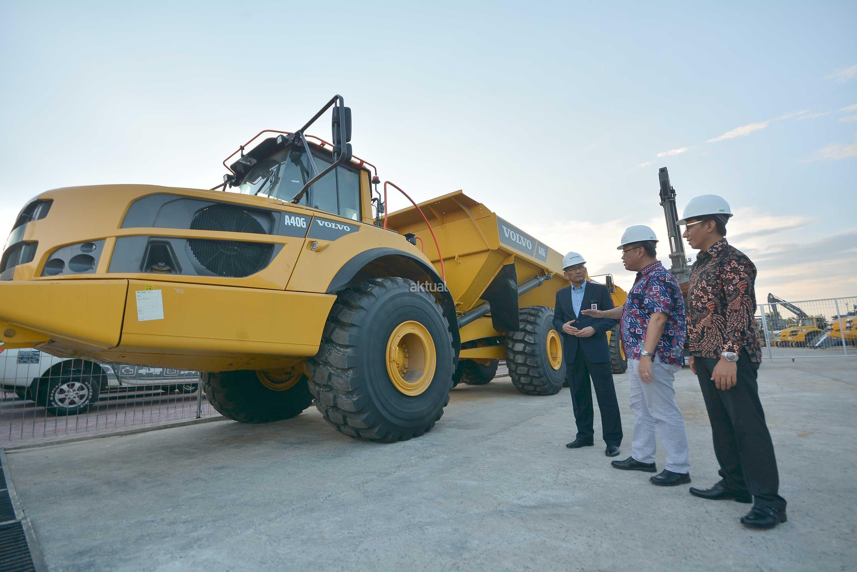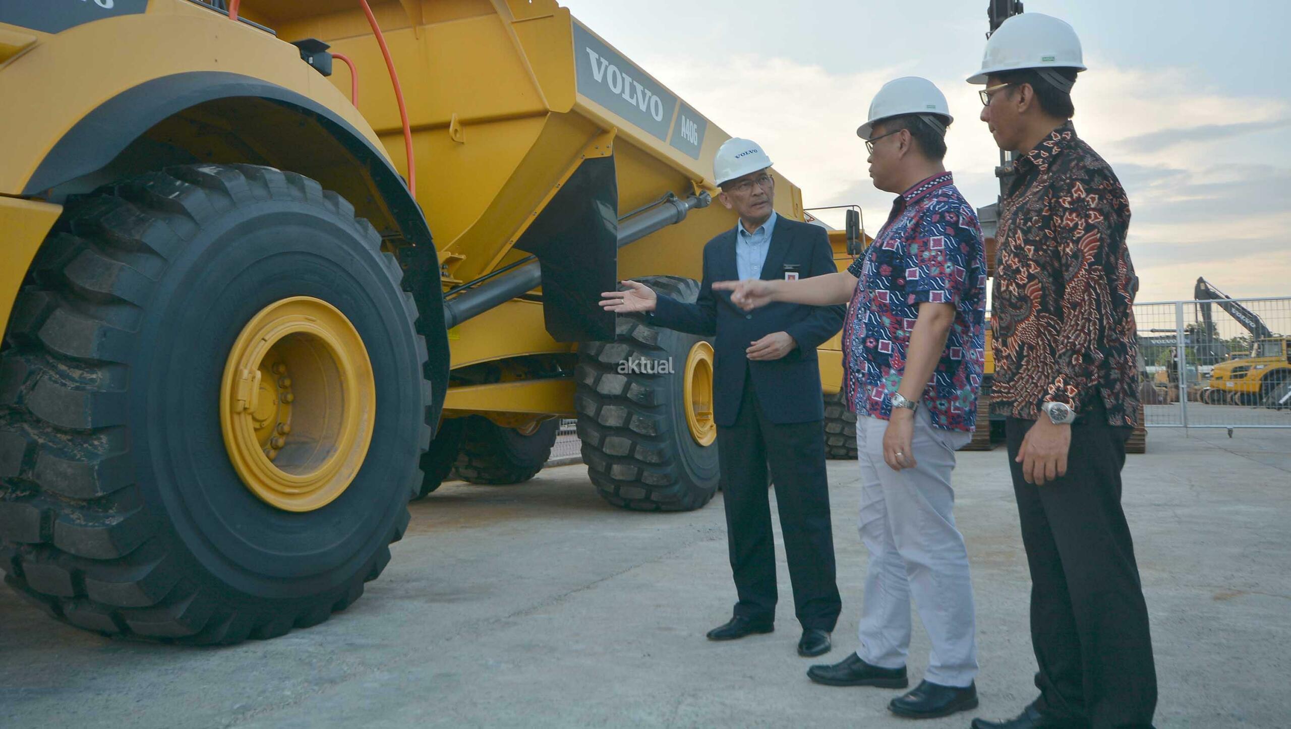 Direktur PT Intraco Penta Tbk. (INTA) Effendi Ibnoe (kiri), Corporate Secretary INTA Stepanus Ardhanova (kanan), dan Direktur PT Intraco Penta Prima Servis (IPPS) Guntur Haludin, berbincang mengenai alat berat articulate dump truck di workshop IPPS Balikpapan, Kalimantan Timur, Selasa (25/9). Tingginya penjualan alat berat dan konstruksi INTA Group salah satunya didorong oleh anak usaha yaitu IPPS yang memegang keagenan merek Volvo CE dan SDLG (untuk Kalimantan, Sulawesi dan Maluku) serta merek Dressta untuk seluruh Indonesia. Berdasarkan data ERG Report per Juni 2018, penjualan merek Volvo CE serta SDLG lebih tinggi dari brand alat berat lainnya hingga mencapai pertumbuhan sebesar 69% dan 45% . AKTUAL/Eko S Hilman