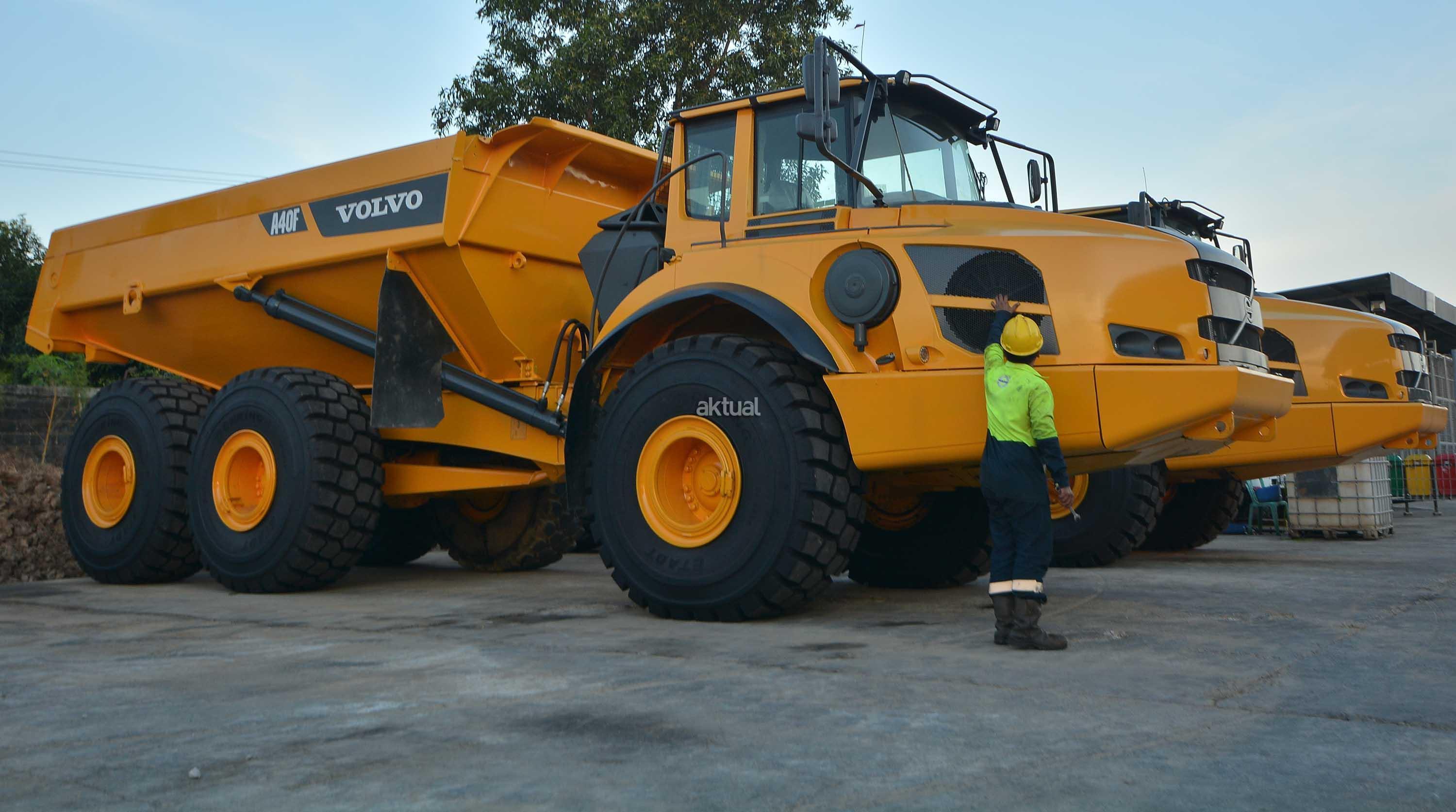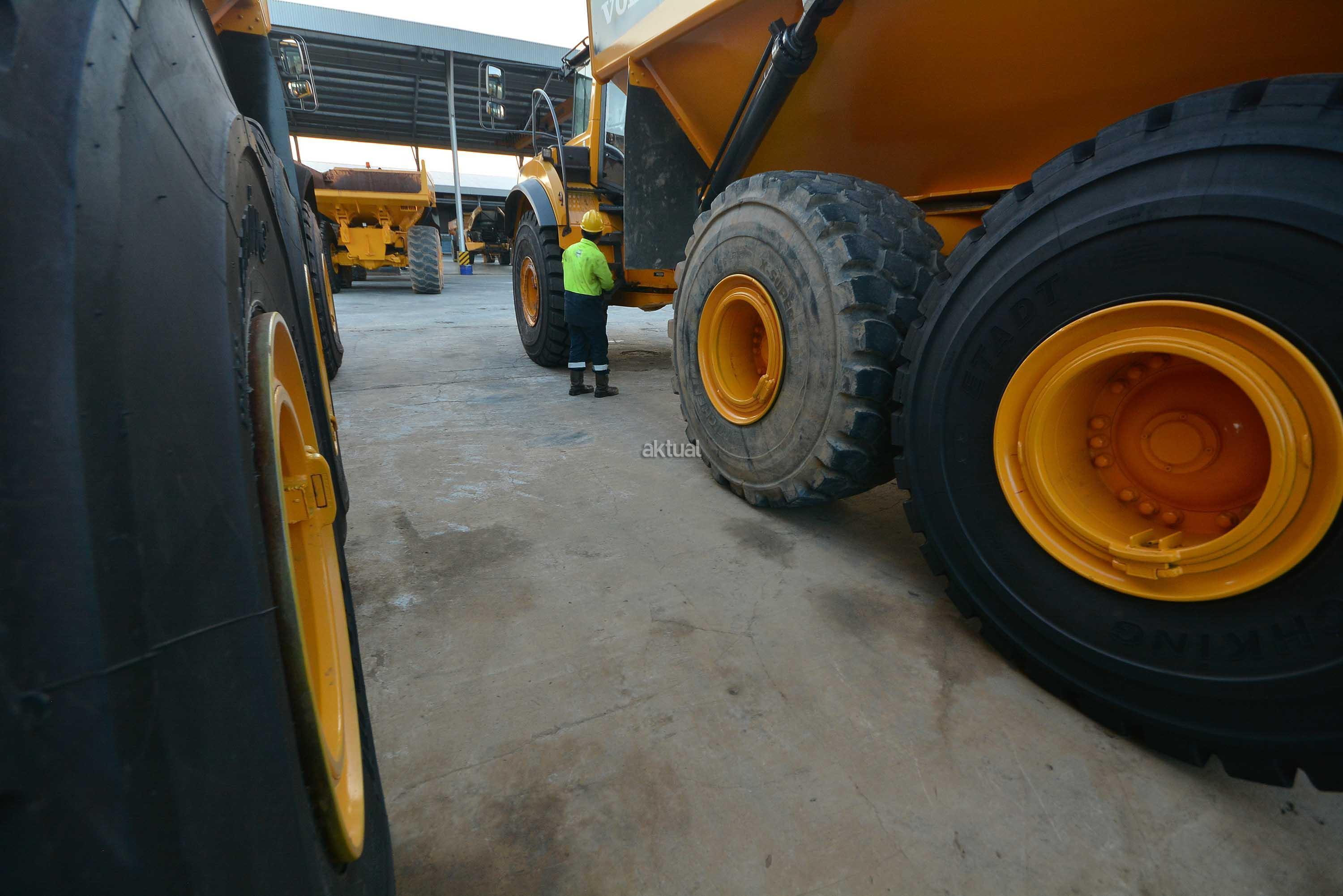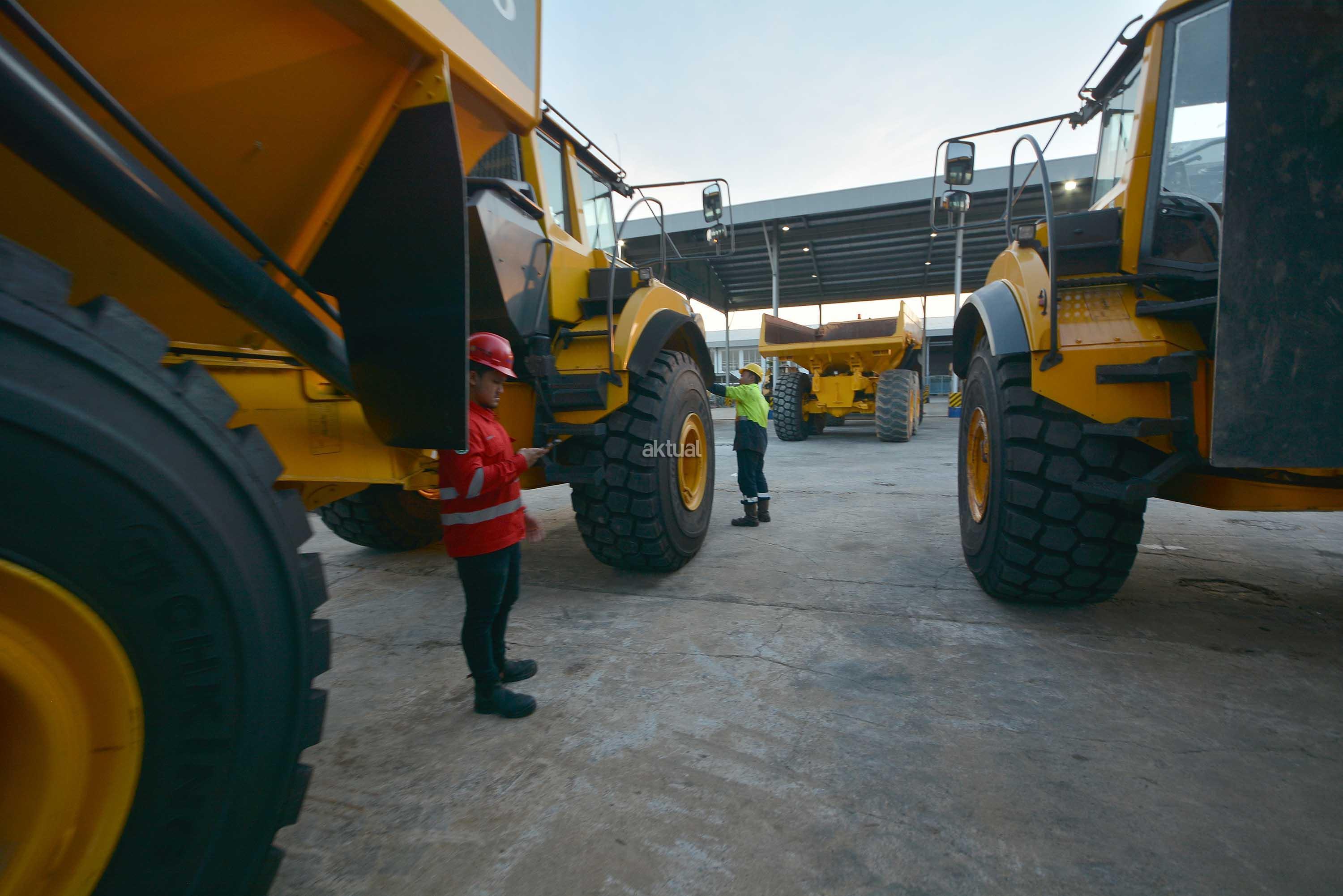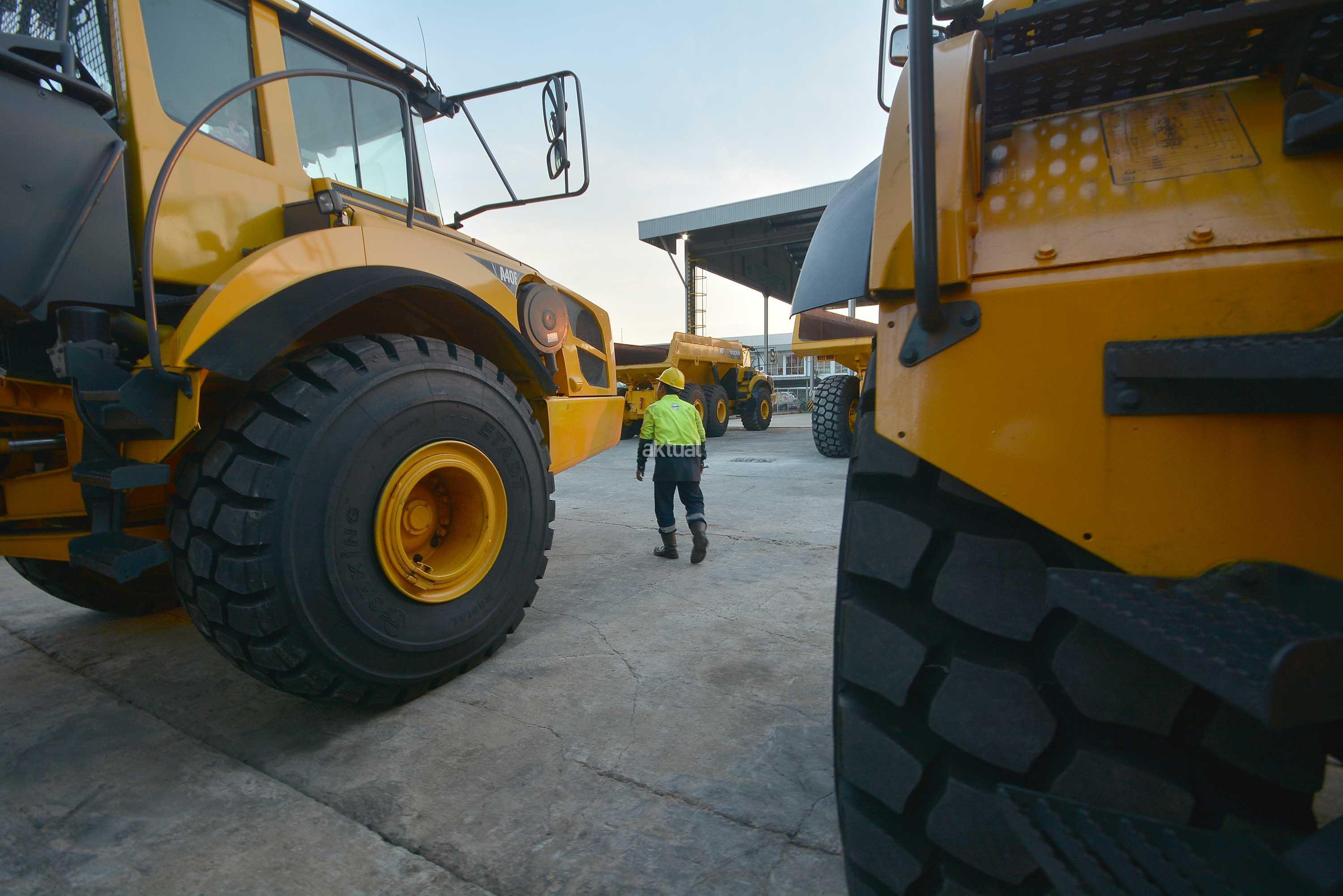 Pekerja memeriksa kendaraan alat berat articulate dump truck di workshop IPPS Balikpapan, Kalimantan Timur, Selasa (25/9). Tingginya penjualan alat berat dan konstruksi INTA Group salah satunya didorong oleh anak usaha yaitu IPPS yang memegang keagenan merek Volvo CE dan SDLG (untuk Kalimantan, Sulawesi dan Maluku) serta merek Dressta untuk seluruh Indonesia. Berdasarkan data ERG Report per Juni 2018, penjualan merek Volvo CE serta SDLG lebih tinggi dari brand alat berat lainnya hingga mencapai pertumbuhan sebesar 69% dan 45% . AKTUAL/Eko S Hilman