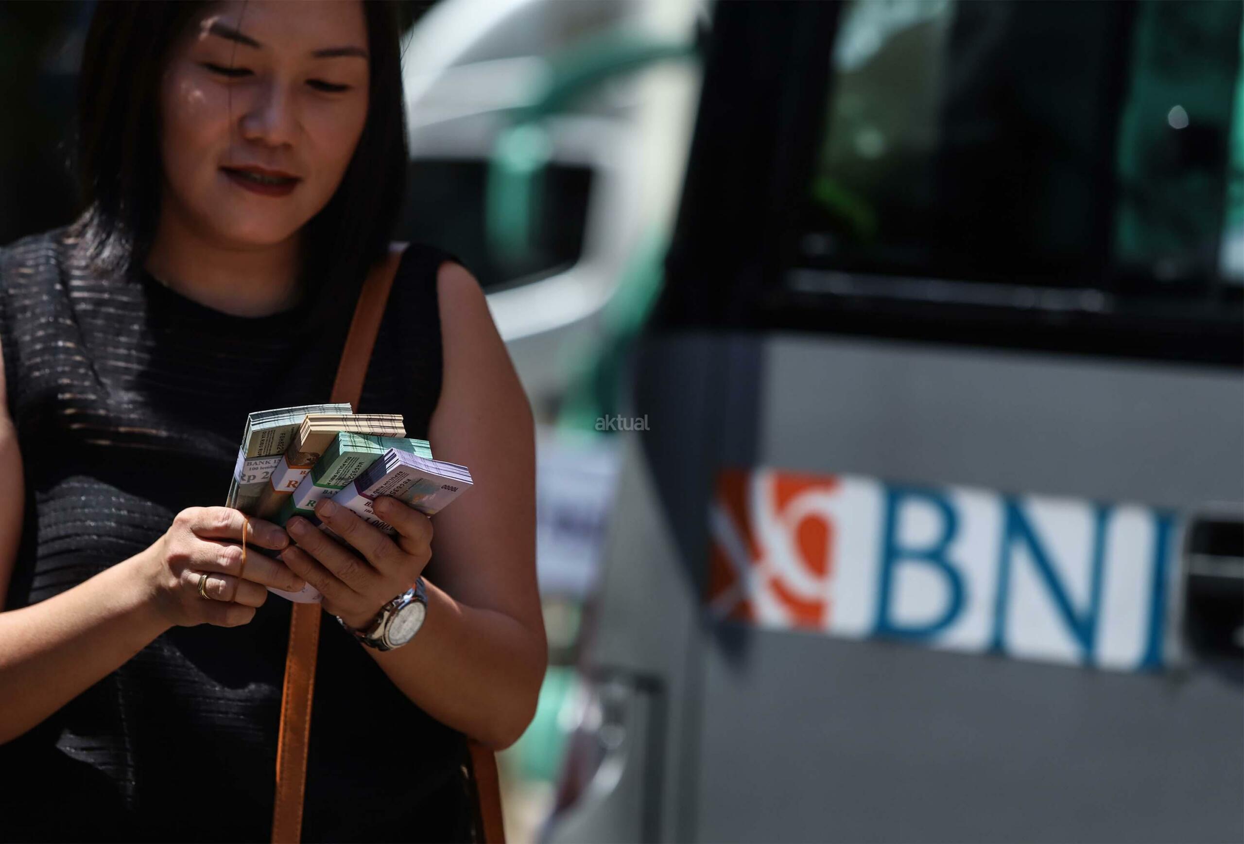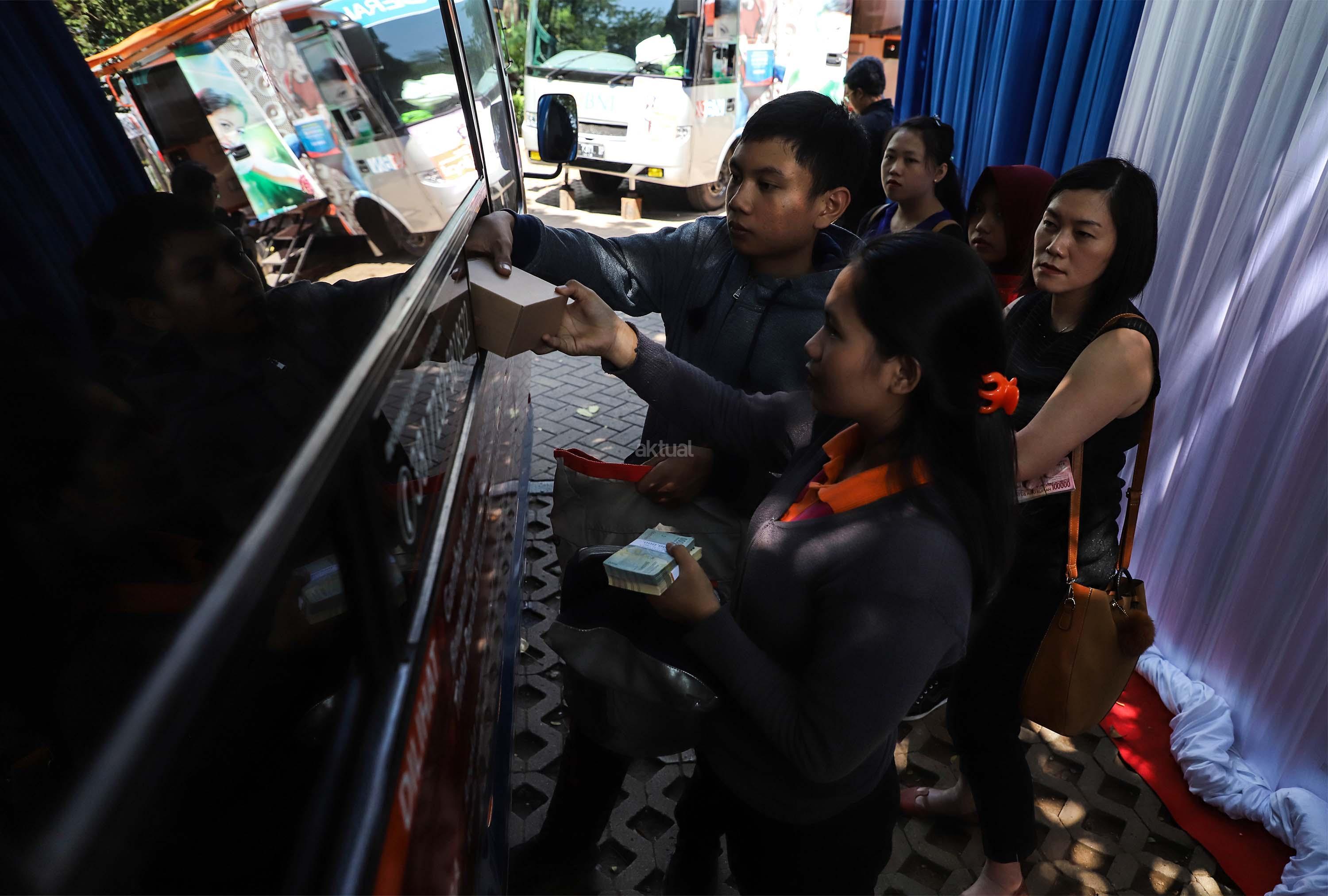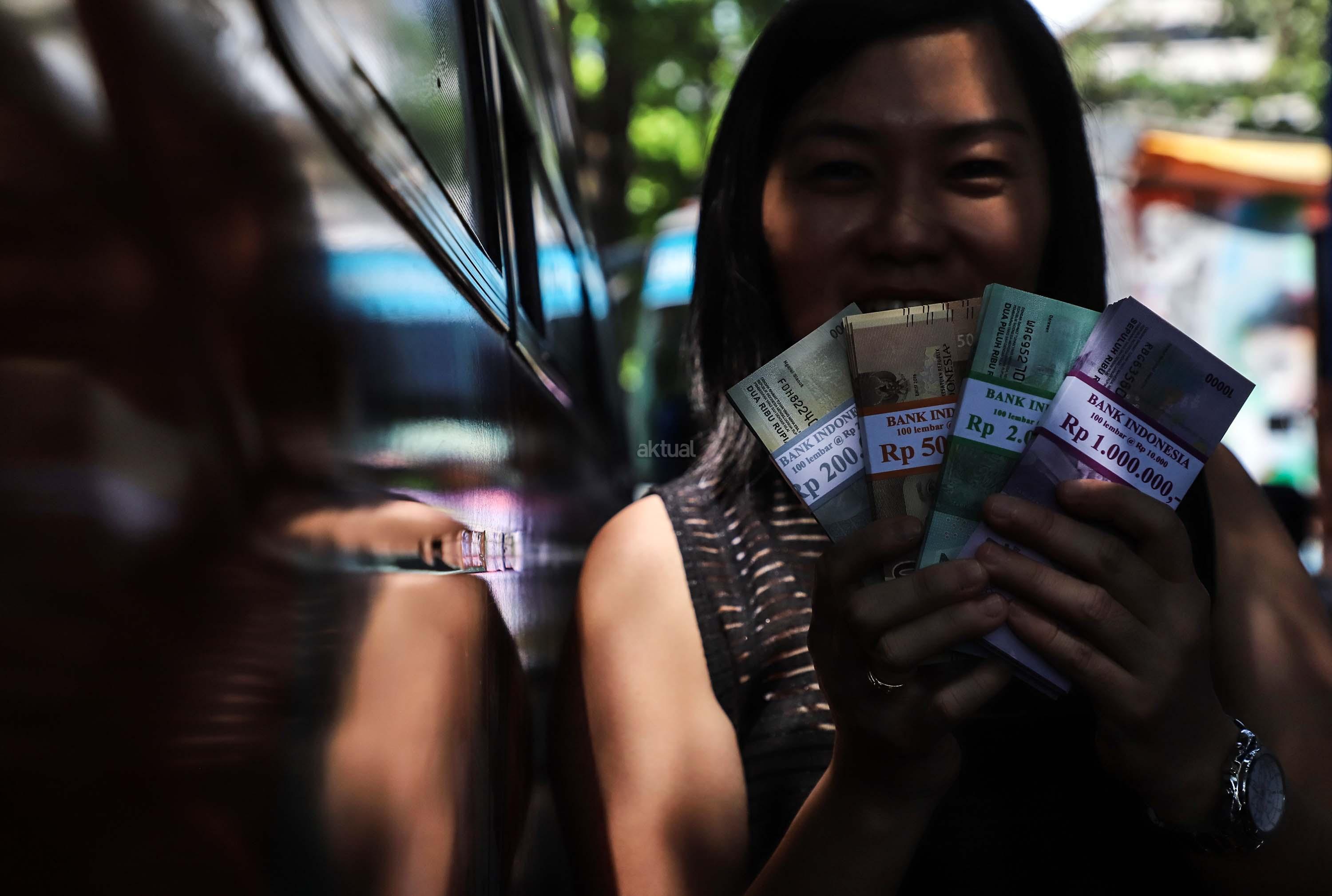 Warga menunjukan uang di loket mobil kas keliling saat pembukaan layanan penukaran uang di Lapangan IRTI, Jakarta, Rabu (23/5/18). Gubernur Bank Indonesia Agus Martowardojo mengatakan pihaknya menyiapkan uang tunai sebesar Rp 167 triliun untuk diedarkan saat Idul Fitri. Dia melihat hal tersebut untuk memenuhi kebutuhan masyarakat akan uang tunai saat hari raya. AKTUAL/Tino Oktaviano