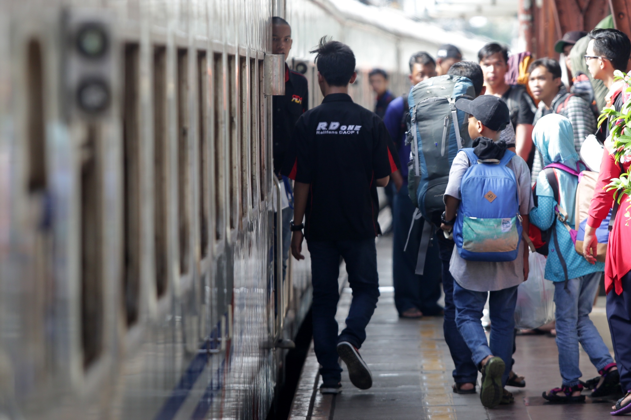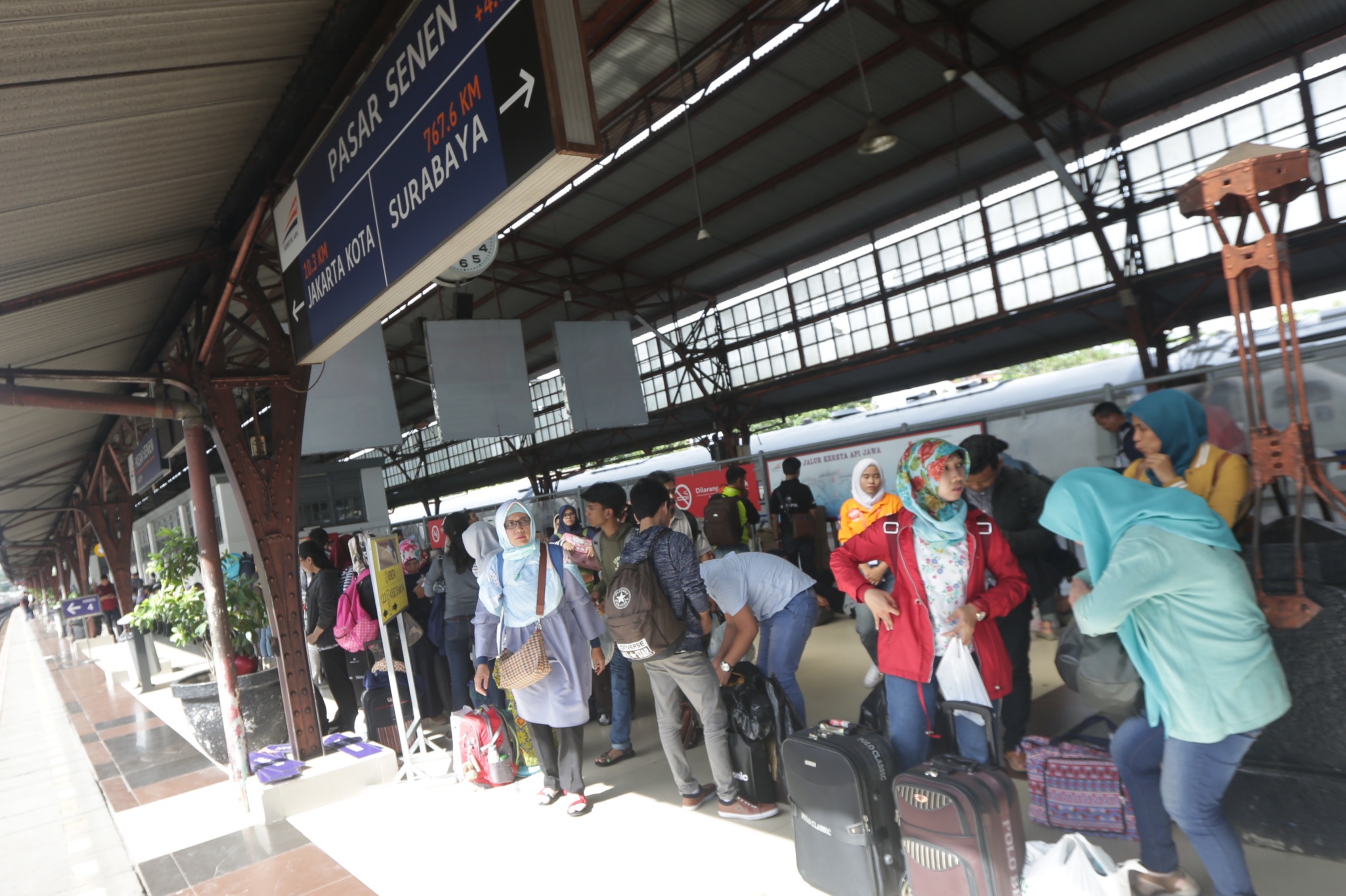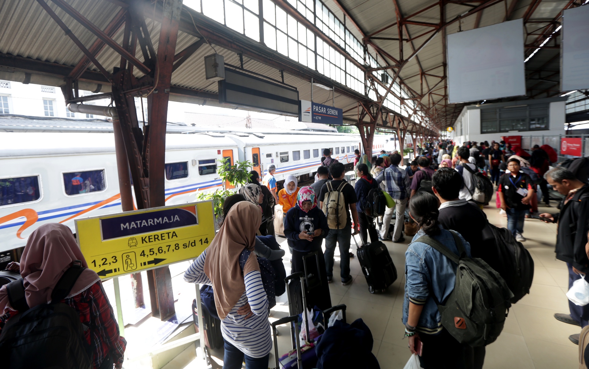 Sejumlah penumpang saat akan menaiki kereta di Stasiun Senen, Jakarta Pusat, Jumat (22/12/2017). Selama libur Natal dan Tahun Baru PT Kereta Api Indonesia (Persero) mencatat jumlah penumpang mengalami peningkatan hingga 10%. Dari jumlah tersebut, tiket keberangkatan baik dari Stasiun Gambir dan Stasiun Pasar Senen pun habis terjual. AKTUAL/Tino Oktaviano
