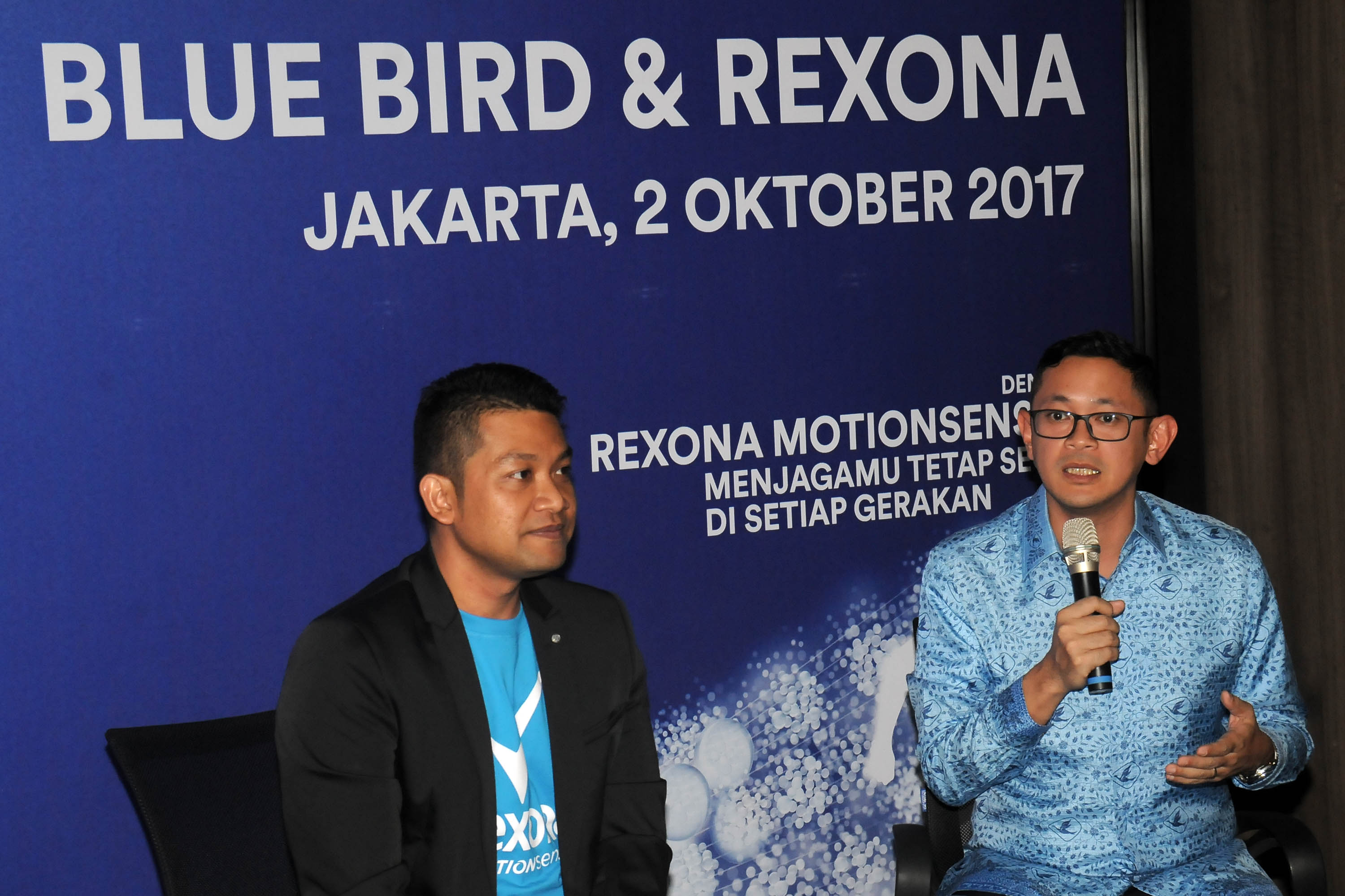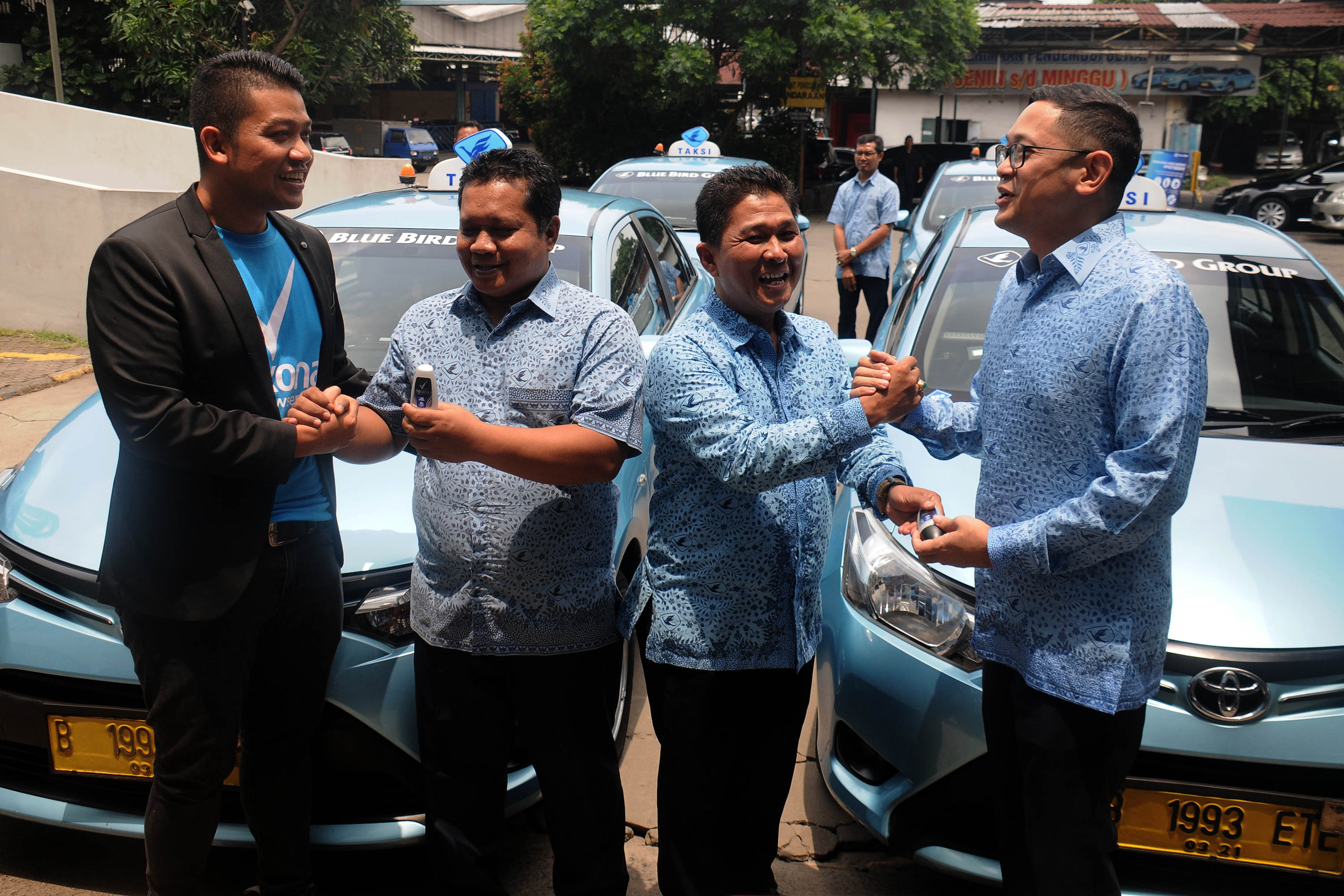 Direktur PT Blue Bird Tbk Andre Djokosoetono (tengah) bersama CCBT Leader Deo Indonesia PT Unilever Indonesia Tbk Diko Handono (kiri) saat berbincang dengan pengemudi pada peluncuran kolaborasi bersama dalam program #P45TISEGAR di Jakarta. Senin (1/10/2017). Peluncuran ini upaya meningkatkan kepedulian pengemudi agar menjaga kebersihan dan kesegaran badan sehingga pelanggan merasa nyaman berpergian selama menggunakan taksi Blue Bird. Program ini merupakan bagian dari service culture project yang sedang dilakukan sebagai bentuk komitmen untuk terus meningkatkan pelayanan kepada pelanggan. Di dalam program ini Blue Bird juga membagikan 5000 (lima ribu) Rexona di 10 pool Blue Bird di Jabodetabek. AKTUAL/Humas Blue Bird