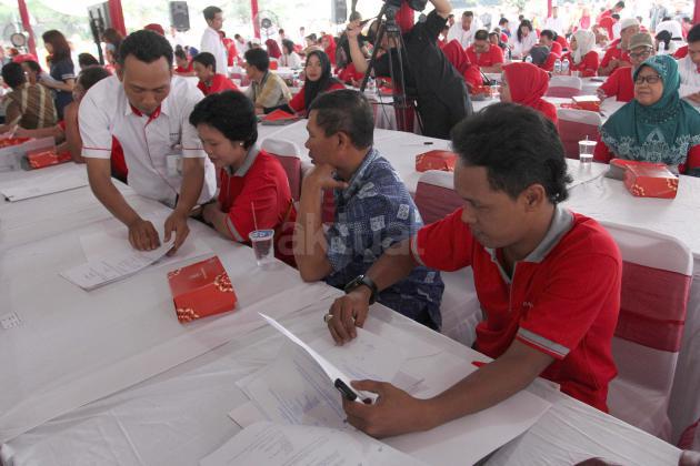 Karyawan Bank DKI berbincang dengan sejumlah pedagang disela penandatanganan penyaluran kredit kepada pedagang di Pasar Induk Kramat Jati, Jakarta, Jumat (4/3). Sebanyak 150 pedagang mendapatkan bantuan dana dari Bank DKI sebesar Rp 10 juta untuk usaha kecil dan menengah dalam rangka meningkatkan intermediasi perbankan kepada sektor UMKM. Secara keseluruhan Bank DKI telah menyalurkan kredit senilai Rp 369,99 Miliar kepada 3.829 pelaku usaha dari sektor UMKM per 31 Desember 2015. Aktual.Com/Eko S Hilman