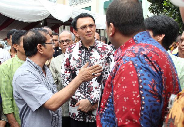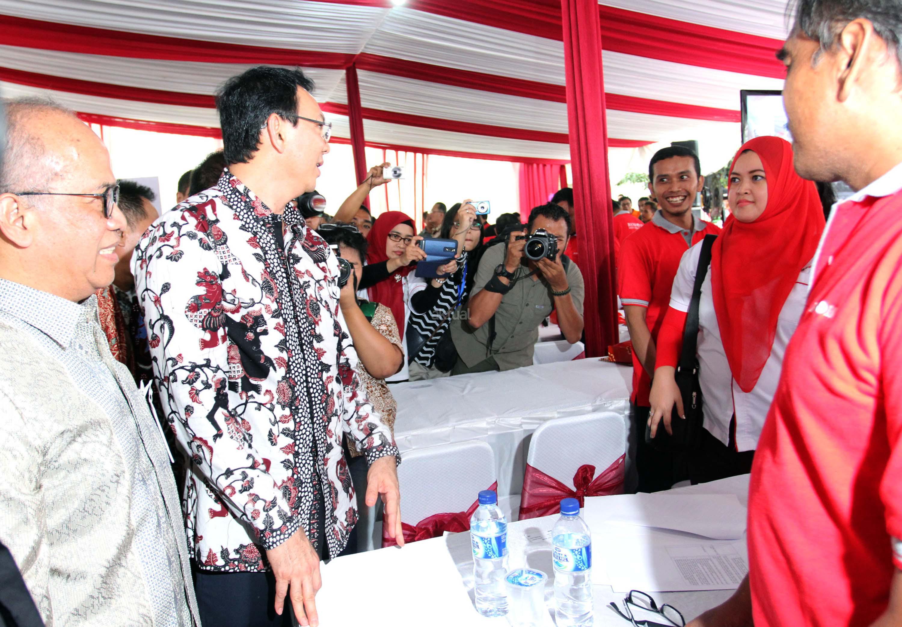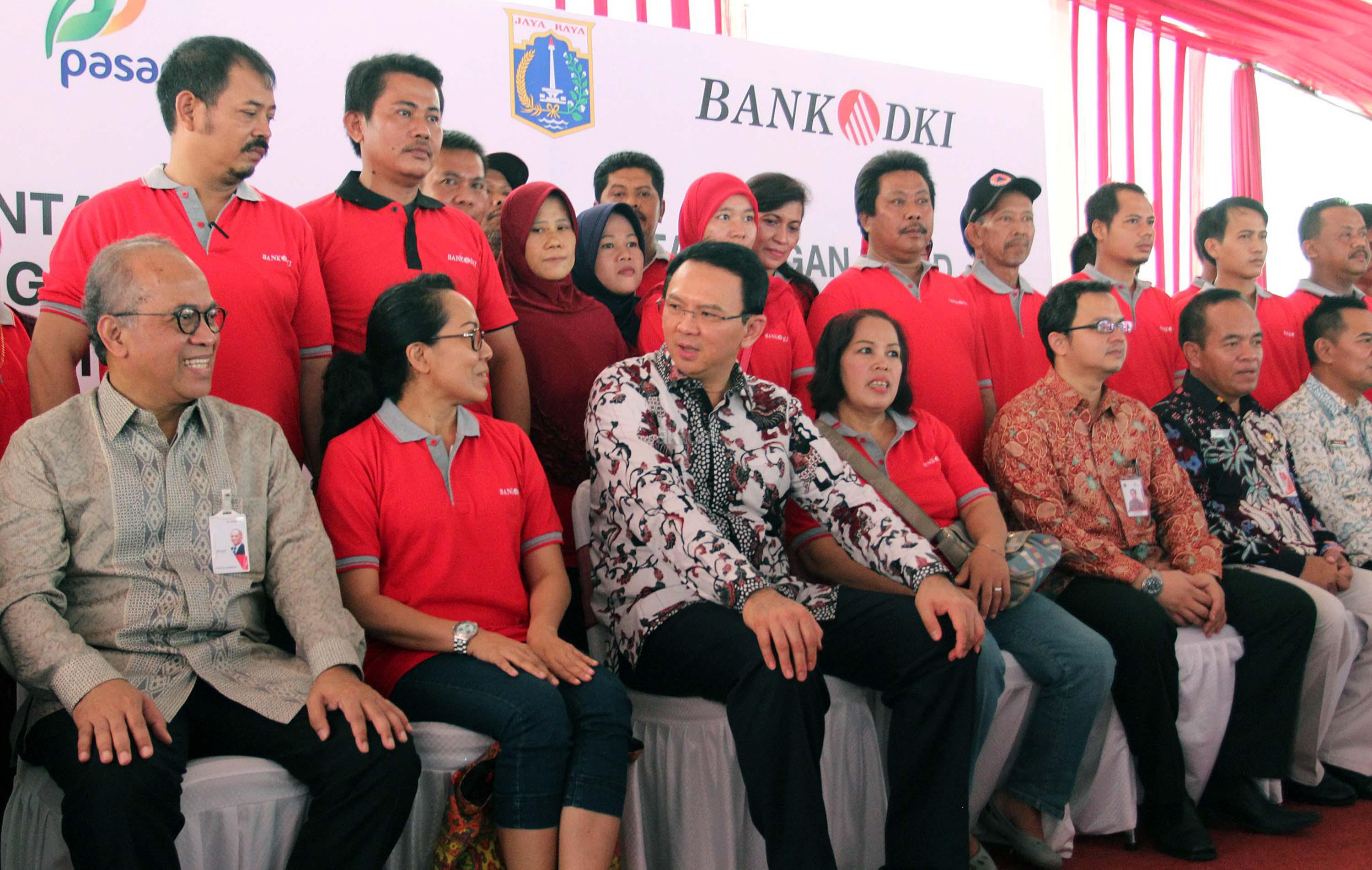 Gubernur DKI Jakarta Basuki Tjahaja Purnama (kedua kanan) didampingi Direktur Utama Bank DKI Kresno Sediarsi (kiri) berbincang dengan pedagang disela penandatanganan penyaluran kredit kepada pedagang di Pasar Induk Kramat Jati, Jakarta, Jumat (4/3). Sebanyak 150 pedagang mendapatkan bantuan dana dari Bank DKI sebesar Rp 10 juta untuk usaha kecil dan menengah dalam rangka meningkatkan intermediasi perbankan kepada sektor UMKM. Secara keseluruhan Bank DKI telah menyalurkan kredit senilai Rp 369,99 Miliar kepada 3.829 pelaku usaha dari sektor UMKM per 31 Desember 2015. Aktual.Com/Eko S Hilman