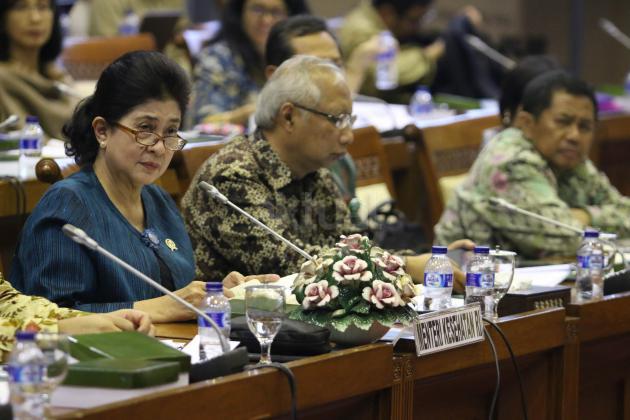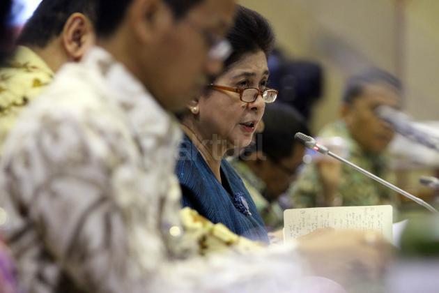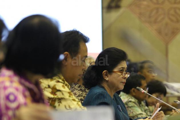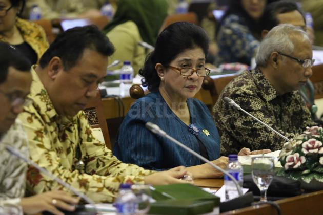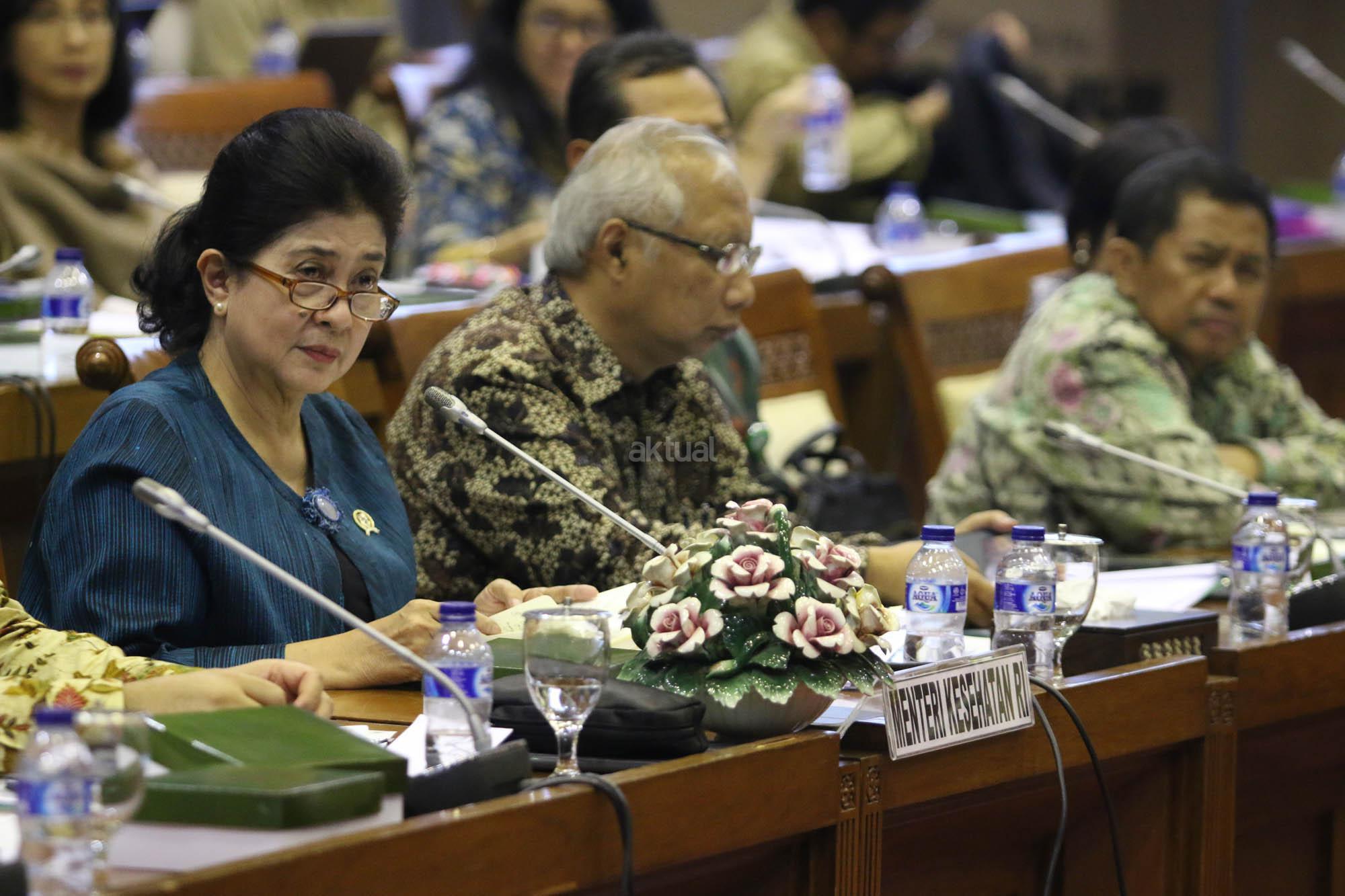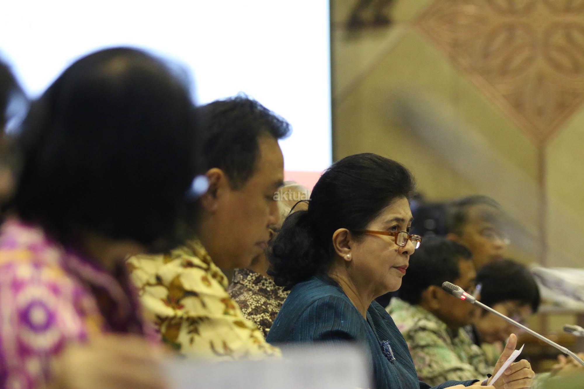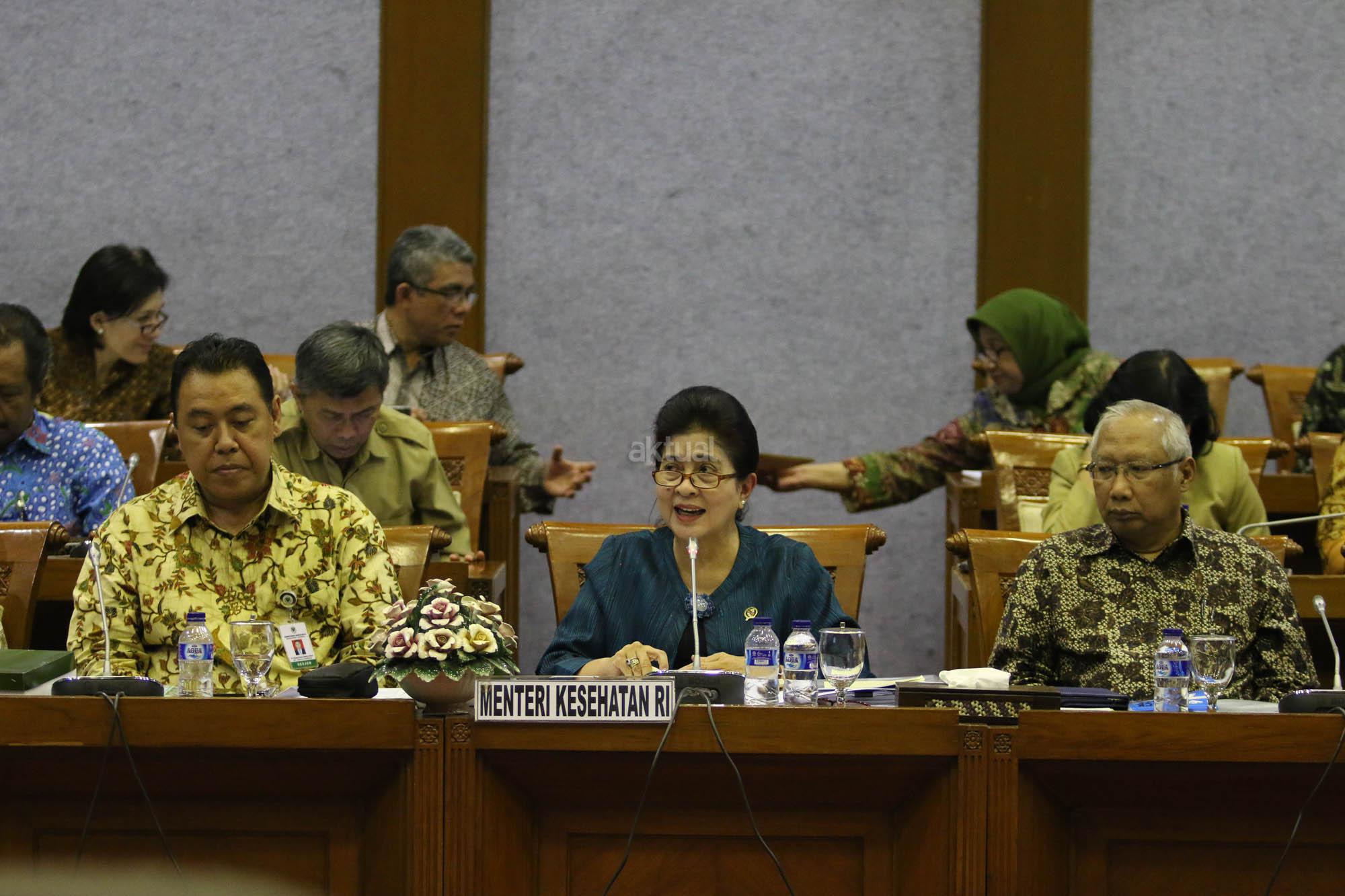 Menteri Kesehatan Nila Moeloek (kiri) menjawab pertanyaan anggota Komisi IX saat rapat di Komplek Parlemen Senayan, Jakarta, Senin (15/2). Rapat tersebut membahas pelaksanaan JKN-KIS oleh BPJS Kesehatan tahun 2015, serta membahas isu kejadian luar biasa Demam Berdarah Dengue, penyebaran virus ZIka dan isu jual beli organ tubuh.