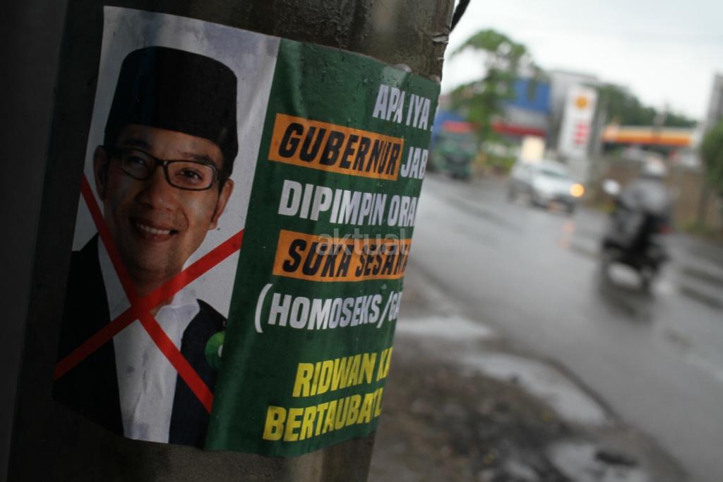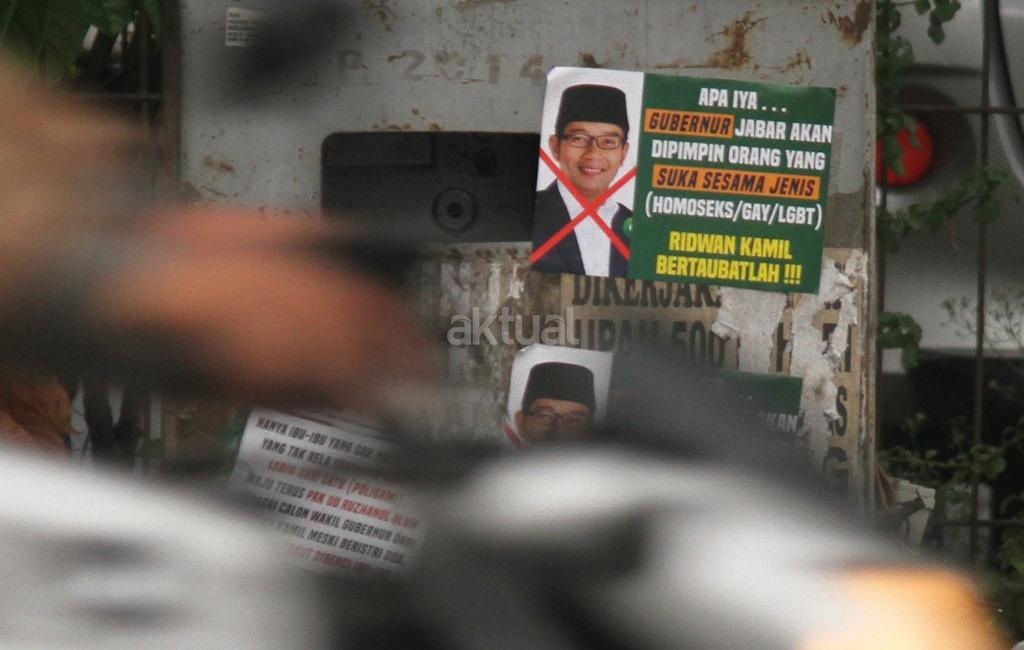 Poster penyebaran 'kampanye hitam' terlihat disepanjang Jalan Raya Siliwangi, Narogong, Bekasi, Senin (25/6). Kampanye hitam yang menyudutkan salah satu calon Gubernur Jawa Barat Ridwan Kamil ini bertebaran jelang pencoblosan Pilkada Jawa Barat pada 27 Juni mendatang. AKTUAL/Tino Oktaviano