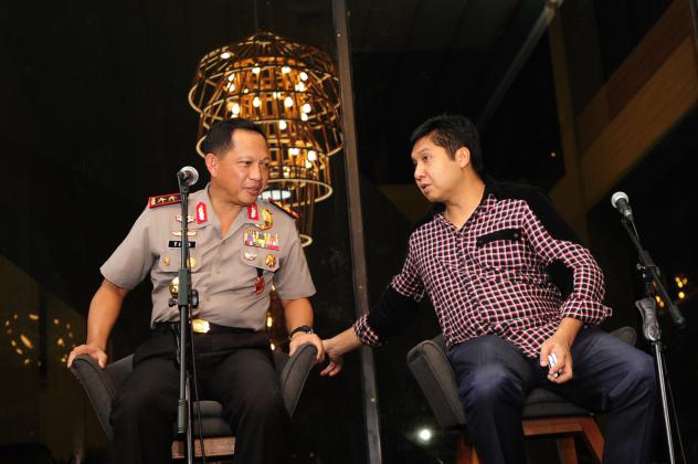 Kapolda Metro Jaya Irjen Pol Tito Karnavian (kiri) berbincang dengan Steering Committee Piala Presiden Maruarar Sirait (kanan) saat konferensi pers terkait final turnamen sepakbola Piala Presiden 2015 di Jakarta, Rabu (14/10). Panitia memutuskan penyelenggaraan final Piala Presiden antara Persib Bandung dan Sriwijaya FC akan digelar di Stadion Utama Gelora Bung Karno pada hari Minggu (18/10) dengan mengerahkan 10.000 personel keamanan dari Polda Metro Jaya, TNI dan unsur terkait. ANTARA FOTO/Wahyu Putro A/aww/15.