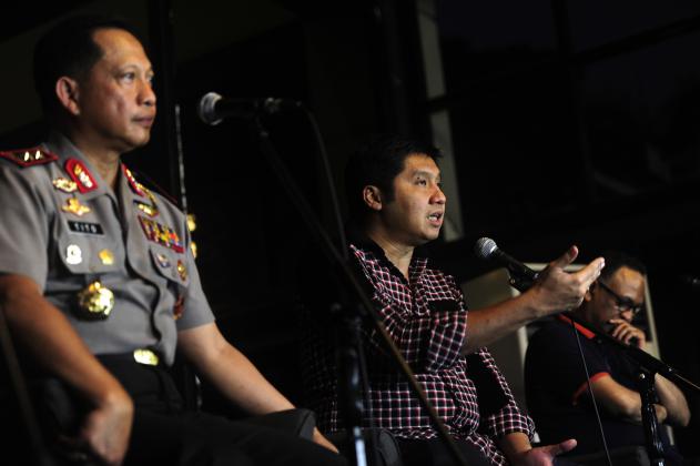 Kapolda Metro Jaya Irjen Pol Tito Karnavian (kiri) bersama Steering Committee Piala Presiden Maruarar Sirait (kanan) memberikan keterangan pers terkait final turnamen sepakbola Piala Presiden 2015 di Jakarta, Rabu (14/10). Panitia memutuskan penyelenggaraan final Piala Presiden antara Persib Bandung dan Sriwijaya FC akan digelar di Stadion Utama Gelora Bung Karno pada hari Minggu (18/10) dengan mengerahkan 10.000 personel keamanan dari Polda Metro Jaya, TNI dan unsur terkait. ANTARA FOTO/Wahyu Putro A/aww/15.