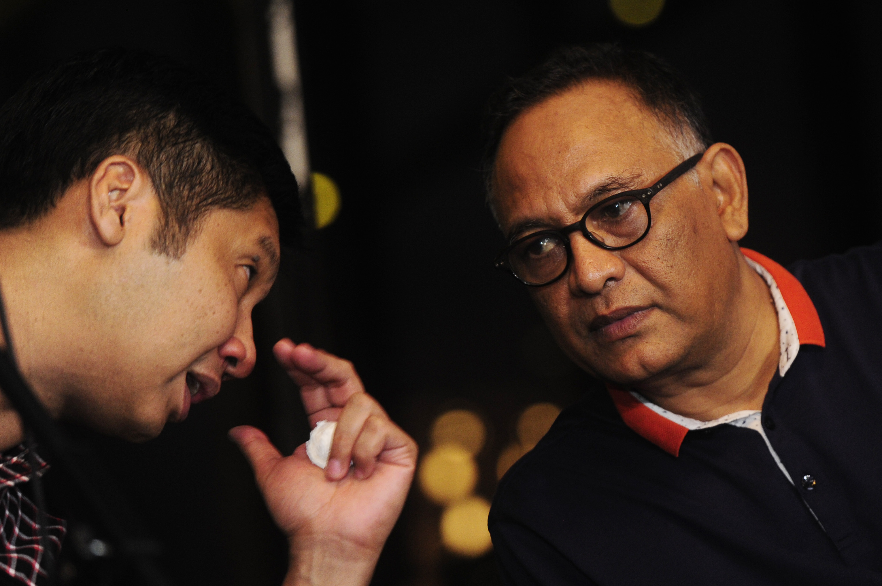 Steering Committee Piala Presiden Maruarar Sirait (kiri) berbincang dengan CEO Mahaka, Hasani Abdulgani saat konferensi pers terkait final turnamen sepak bola Piala Presiden di Jakarta, Rabu (14/10). Panitia memutuskan penyelenggaraan final Piala Presiden antara Persib Bandung dan Sriwijaya FC akan digelar di Stadion Utama Gelora Bung Karno pada hari Minggu (18/10) dengan mengerahkan 10.000 personel keamanan dari Polda Metro Jaya, TNI dan unsur terkait. ANTARA FOTO/Wahyu Putro A/aww/15.