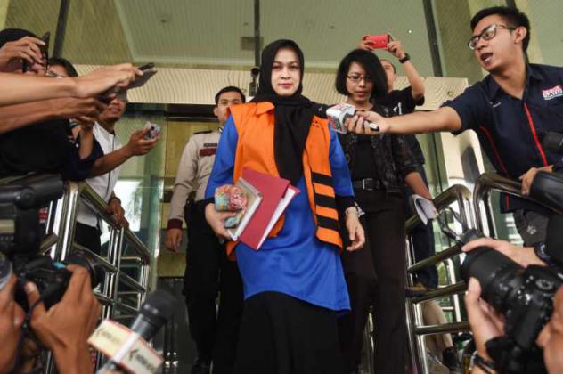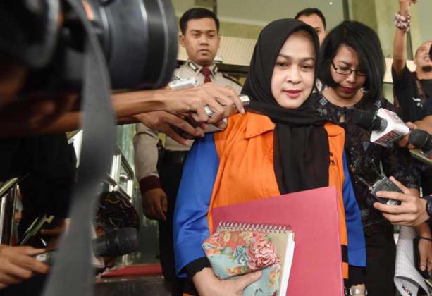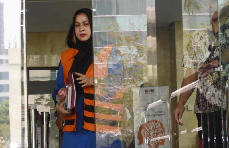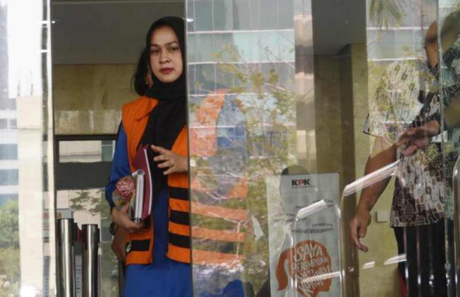 Tersangka kasus suap Hakim dan Panitera PTUN Medan Evi Susanti meninggalkan Gedung KPK usai menjalani pemeriksaan di Jakarta, Jumat (25/9). Istri muda Gubernur Sumatera Utara Gatot Pujo Nugroho itu diperiksa dalam kasus dugaan suap di PTUN Medan yang juga melibatkan suaminya dan pengacara senior OC Kaligis. ANTARA FOTO/Akbar Nugroho Gumay