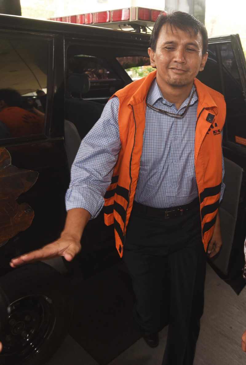 Gubernur Sumatera Utara Gatot Pujo Nugroho tiba di Gedung KPK untuk menjalani pemeriksaan di Jakarta, Jumat (25/9). Tersangka kasus dugaan suap hakim dan panitera PTUN Medan itu diperiksa oleh KPK guna mengembangkan penyelidikan kasus baru dugaan suap interpelasi di DPRD Sumatera Utara. ANTARA FOTO/Akbar Nugroho Gumay