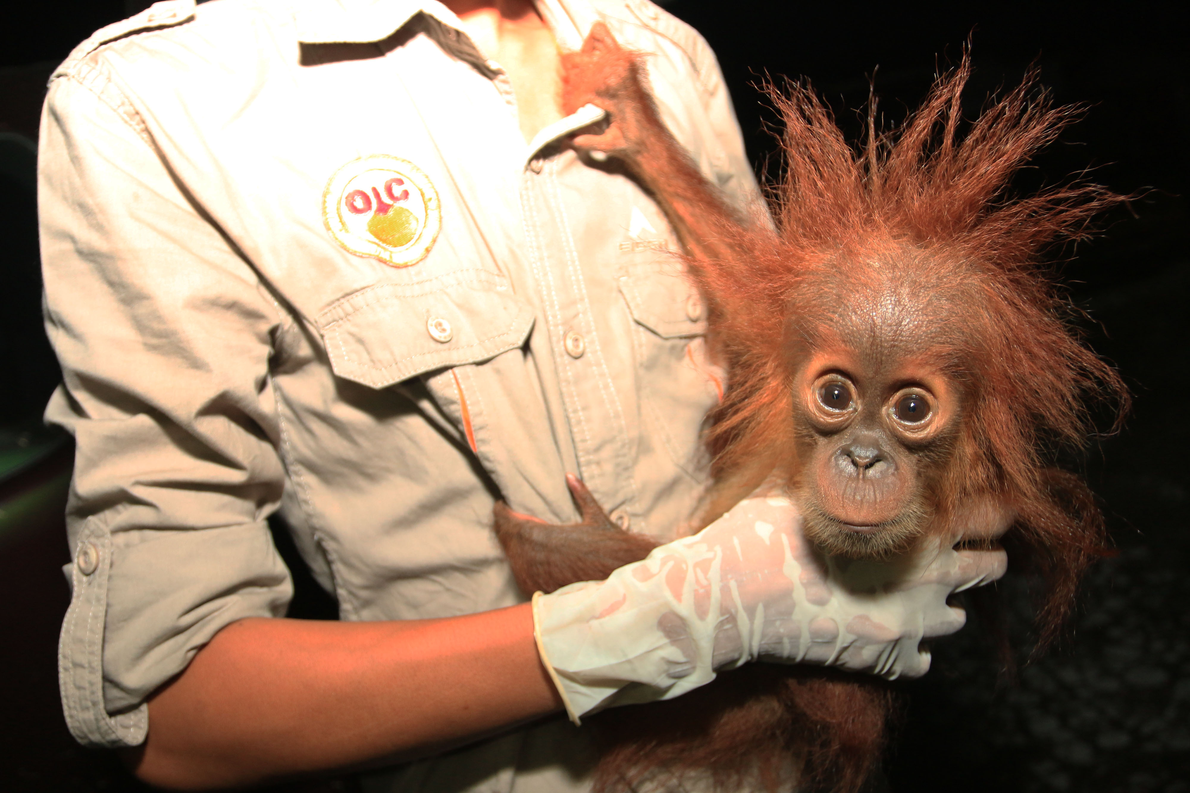 Petugas Yayasan Orangutan Sumatera Lestari-Orangutan Information Centre (YOSL-OIC) menggendong bayi orangutan sumatera (Pongo abelii) berumur satu tahun yang akan dibawa ke karantina Sumatran Orangutan Conservation Program (SOCP) Batumbelin, Sibolangit, di Deli Serdang, Sumatera Utara, Sabtu (9/7). Bayi Orangutan Sumatera betina tersebut sebelumnya dipelihara warga di Kabupaten Aceh Timur, yang kemudian diserahkan kepada pihak TNI bekerja sama dengan petugas Yayasan Orangutan Sumatera Lestari-Orangutan Information Centre (YOSL-OIC) dan BKSDA Aceh. ANTARA FOTO/Irsan Mulyadi/aww/16.