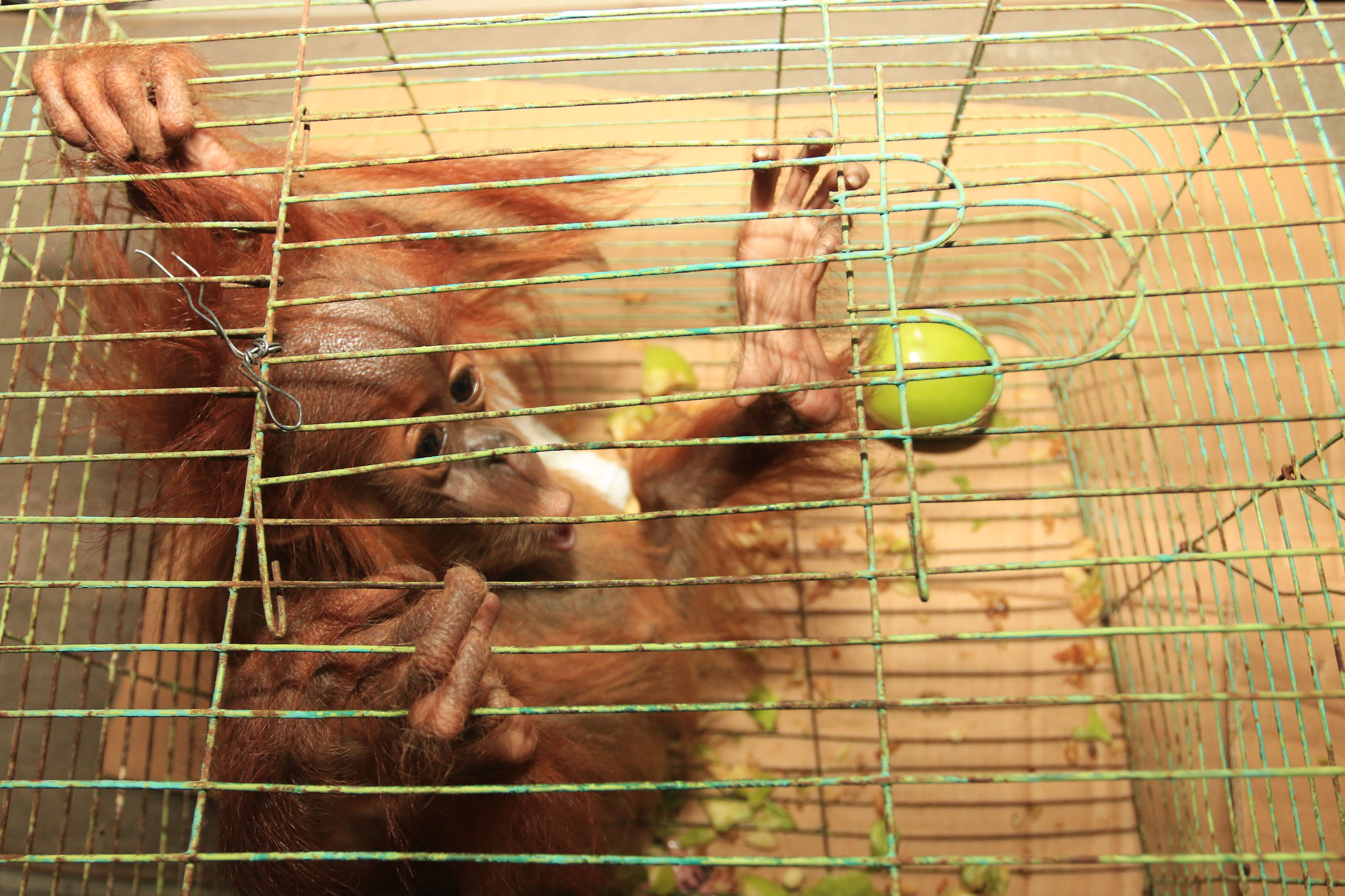 Orangutan sumatera (Pongo abelii) berumur satu tahun berada di dalam kandang saat akan dibawa ke karantina Sumatran Orangutan Conservation Program (SOCP) Batumbelin, Sibolangit, di Deli Serdang, Sumatera Utara, Sabtu (9/7). Bayi Orangutan Sumatera betina tersebut sebelumnya dipelihara warga di Kabupaten Aceh Timur, yang kemudian diserahkan kepada pihak TNI bekerja sama dengan petugas Yayasan Orangutan Sumatera Lestari-Orangutan Information Centre (YOSL-OIC) dan BKSDA Aceh. ANTARA FOTO/Irsan Mulyadi/aww/16.