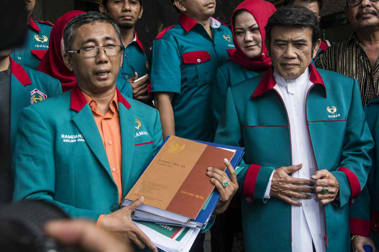 Ketua Umum Partai IDAMAN Rhoma Irama (kanan) mendampingi Sekjen Partai IDAMAN Ramdansyah (kiri) menunjukan berkas kelengkapan pendaftaran kepengurusan partai di Ditjen AHU Kementerian Hukum dan HAM, Jakarta, Jumat (29/7). Penyerahan berkas tersebut sebagai syarat partai untuk memiliki badan hukum supaya dapat lolos menjadi peserta Pemilu 2019. ANTARA FOTO/Aprillio Akbar/kye/16.