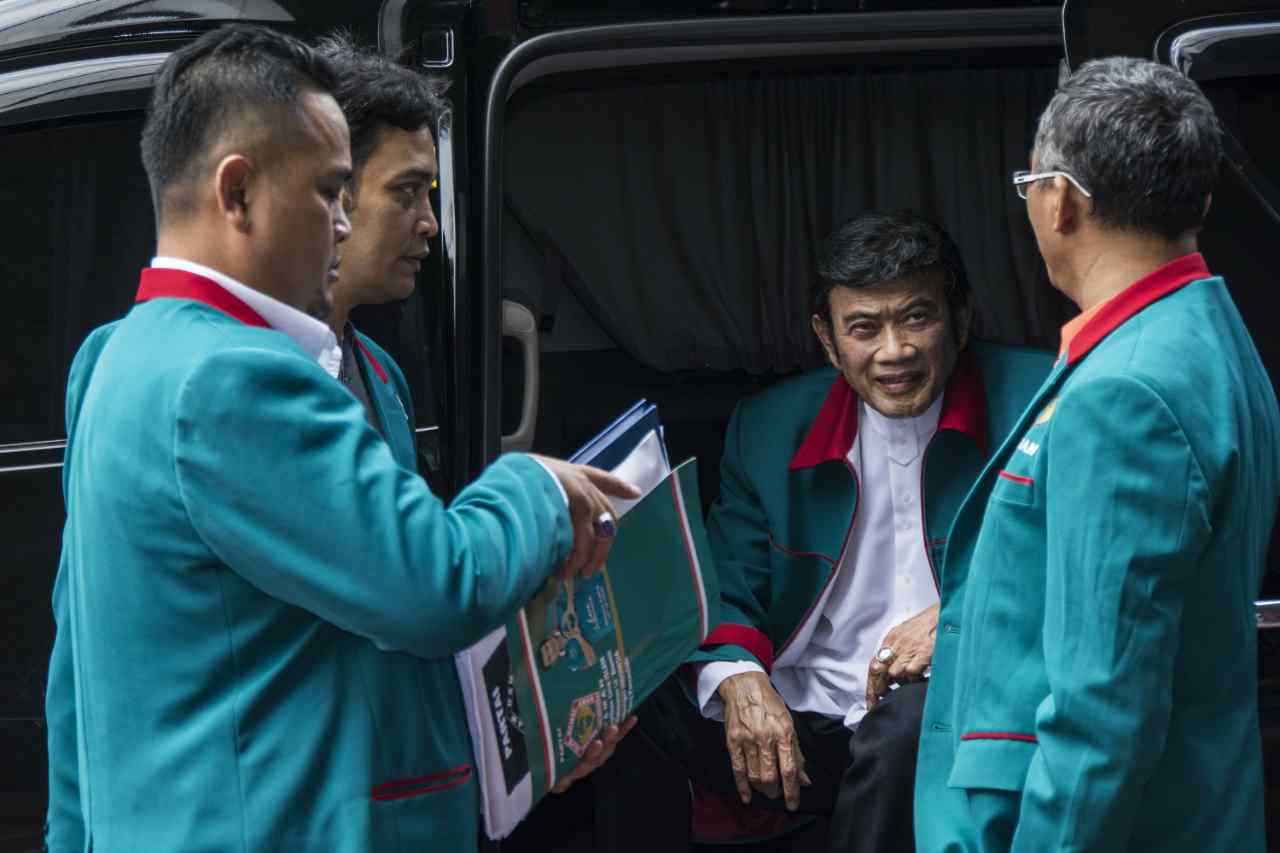 Ketua Umum Partai IDAMAN Rhoma Irama (kedua kanan) berbincang dengan anggota Partai IDAMAN sebelum menyerahkan berkas kelengkapan pendaftaran kepengurusan partai di Ditjen AHU Kementerian Hukum dan HAM, Jakarta, Jumat (29/7). Penyerahan berkas tersebut sebagai syarat partai untuk memiliki badan hukum supaya dapat lolos menjadi peserta Pemilu 2019. ANTARA FOTO/Aprillio Akbar/kye/16.