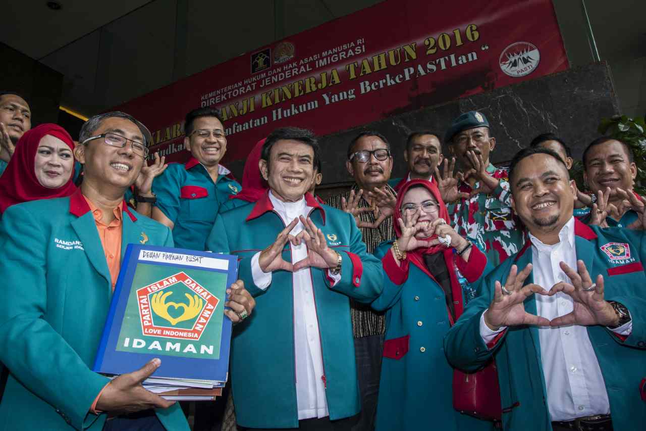 Ketua Umum Partai IDAMAN Rhoma Irama (kedua kiri) dan Sekjen Partai IDAMAN Ramdansyah (kiri) beserta anggota partai berfoto bersama sebelum menyerahkan berkas kelengkapan pendaftaran kepengurusan partai di Ditjen AHU Kementerian Hukum dan HAM, Jakarta, Jumat (29/7). Penyerahan berkas tersebut sebagai syarat partai untuk memiliki badan hukum supaya dapat lolos menjadi peserta Pemilu 2019. ANTARA FOTO/Aprillio Akbar/kye/16.