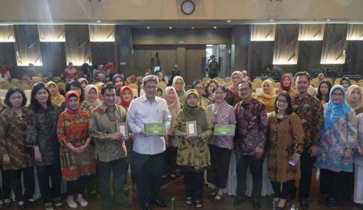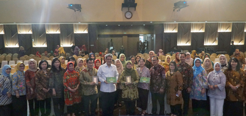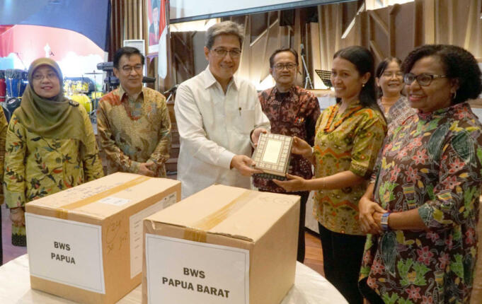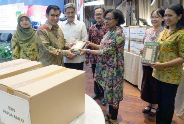 Ketua Harian Yayasan Muslim Sinar Mas, Dhony Rahajoe (ketiga dari kiri) menyerahkan secara simbolis wakaf Al Qur’an kepada perwakilan Ibu Dharma Wanita Kementrian Pekerjaan Umum dan Perumahan Rakyat (PUPR) disaksikan Penasihat Dharma Wanita Persatuan Kementrian PUPR, Kartika Basuki Hadimuljono (kiri) di Auditorium Kantor PUPR, Jakarta, Jumat (26/4). AKTUAL/STR-Eko S Hilman