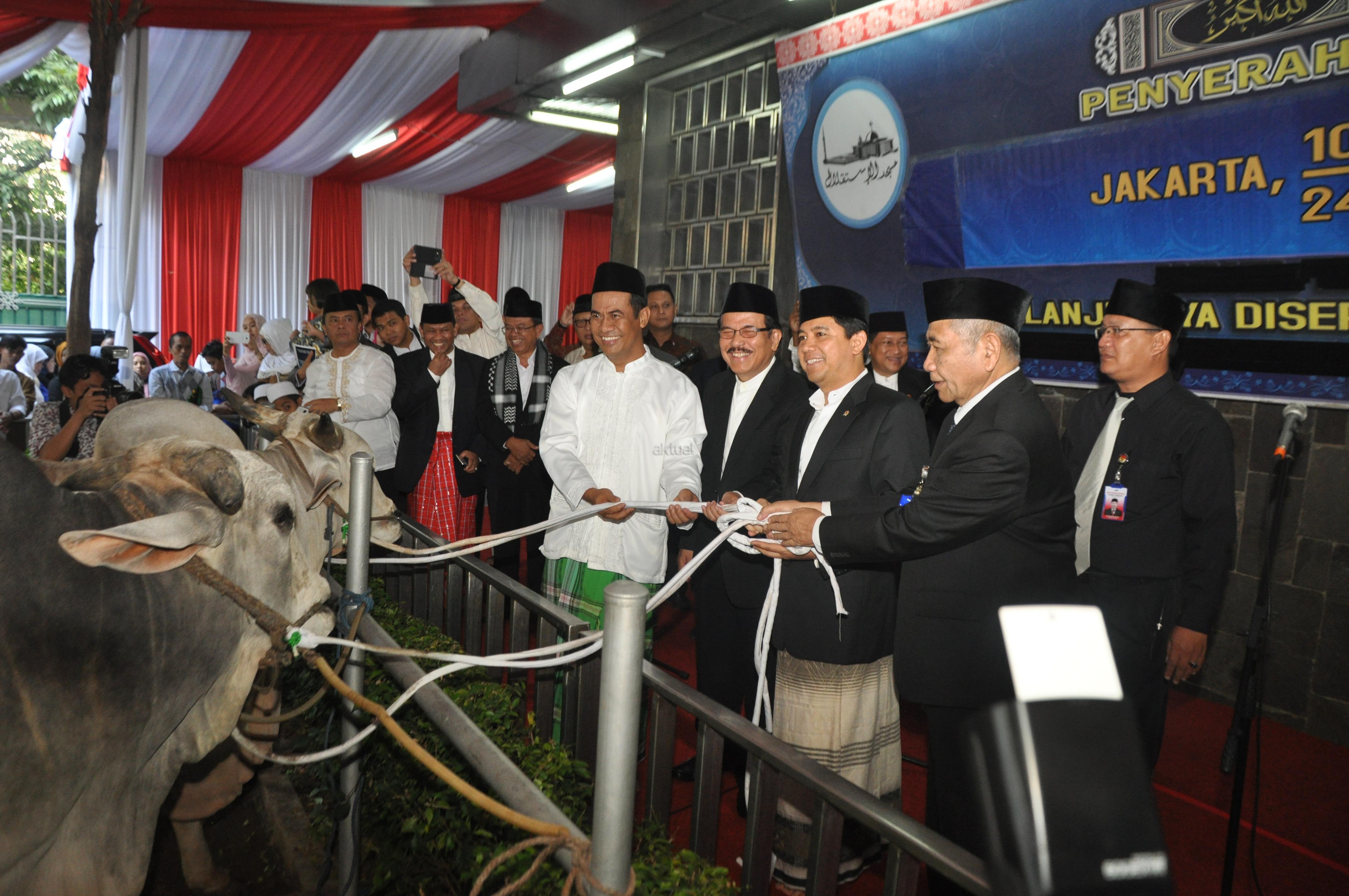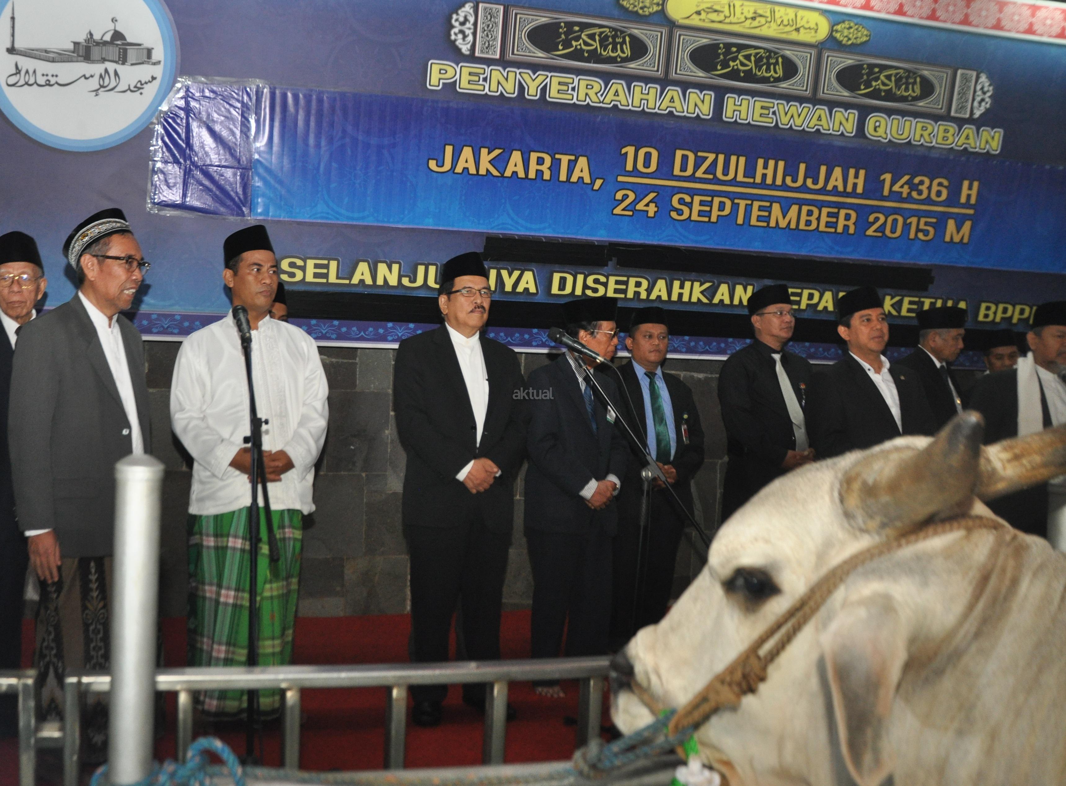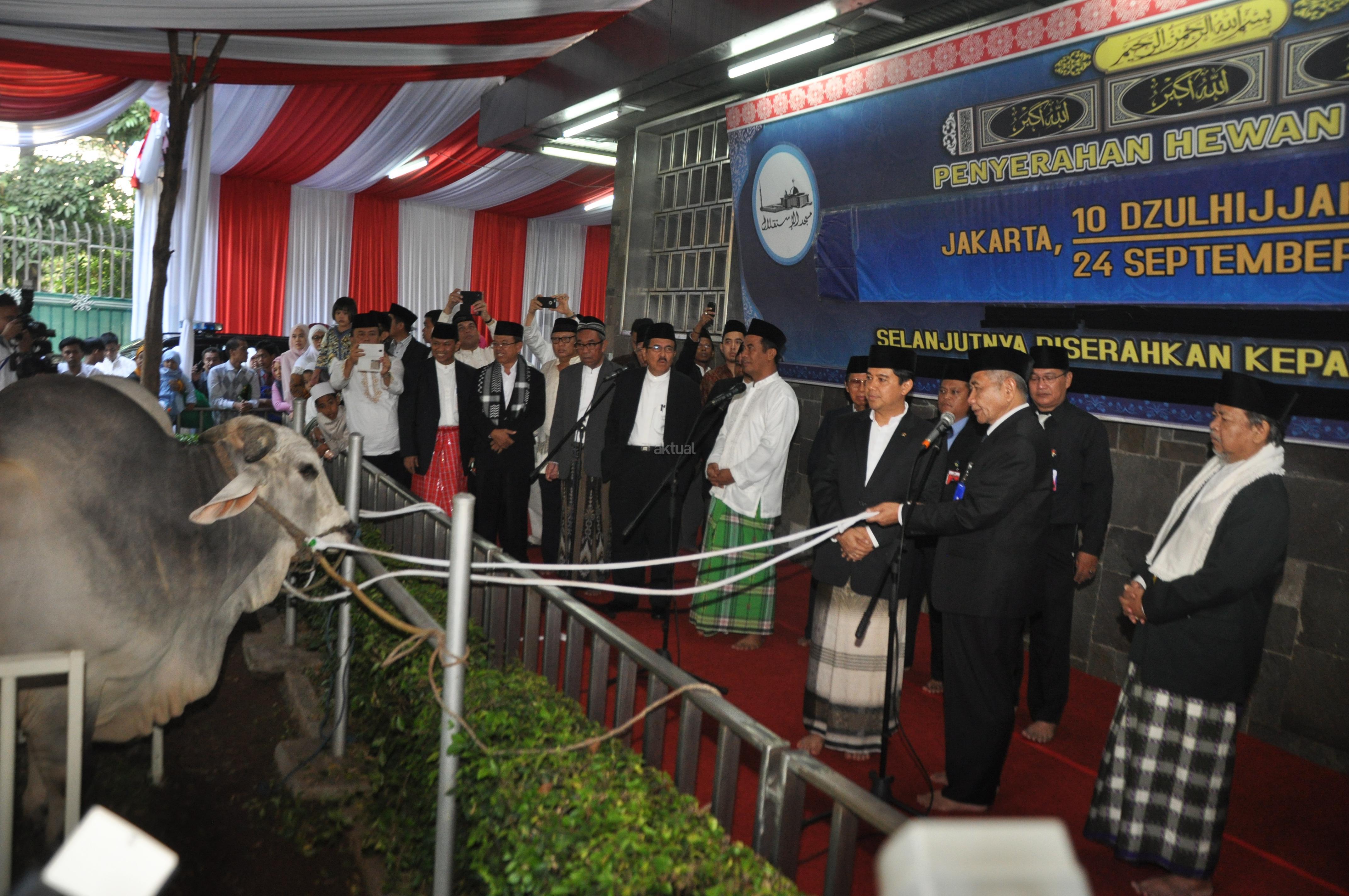 Menteri Pendayagunaan Aparatur Negara dan Reformasi Birokrasi (MenPAN-RB) Yuddy Chrisnandi meyerahkan Hewan Qurban berupa satu ekor sapi milik Presiden RI, Joko Widodo di Halaman Masjid Istiqlal, Jakarta, Kamis (24/9/2015). Sedangkan sapi Wakil Presiden Jusuf Kalla diserahkan Menteri Pertanian Andi Amran Sulaiman.