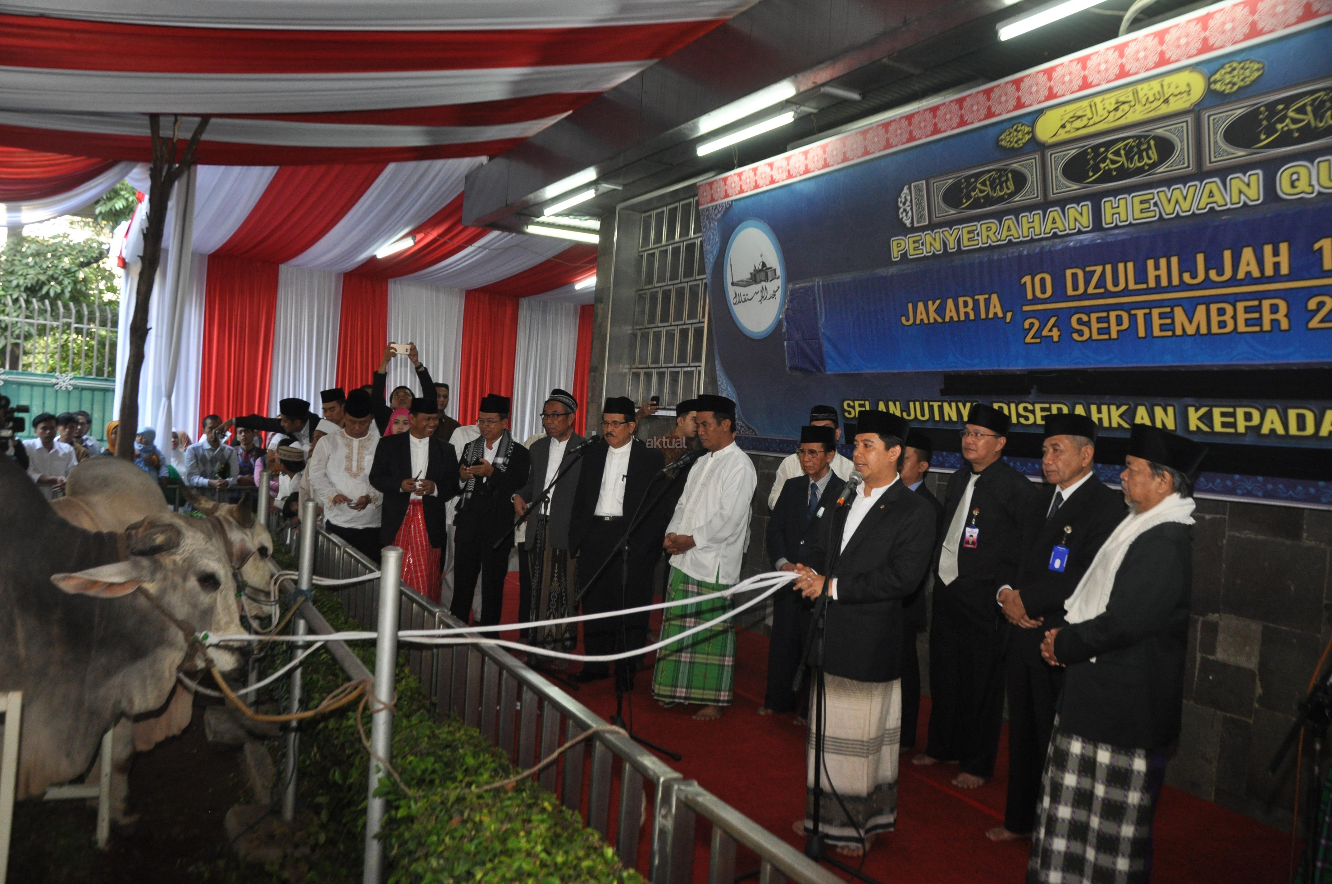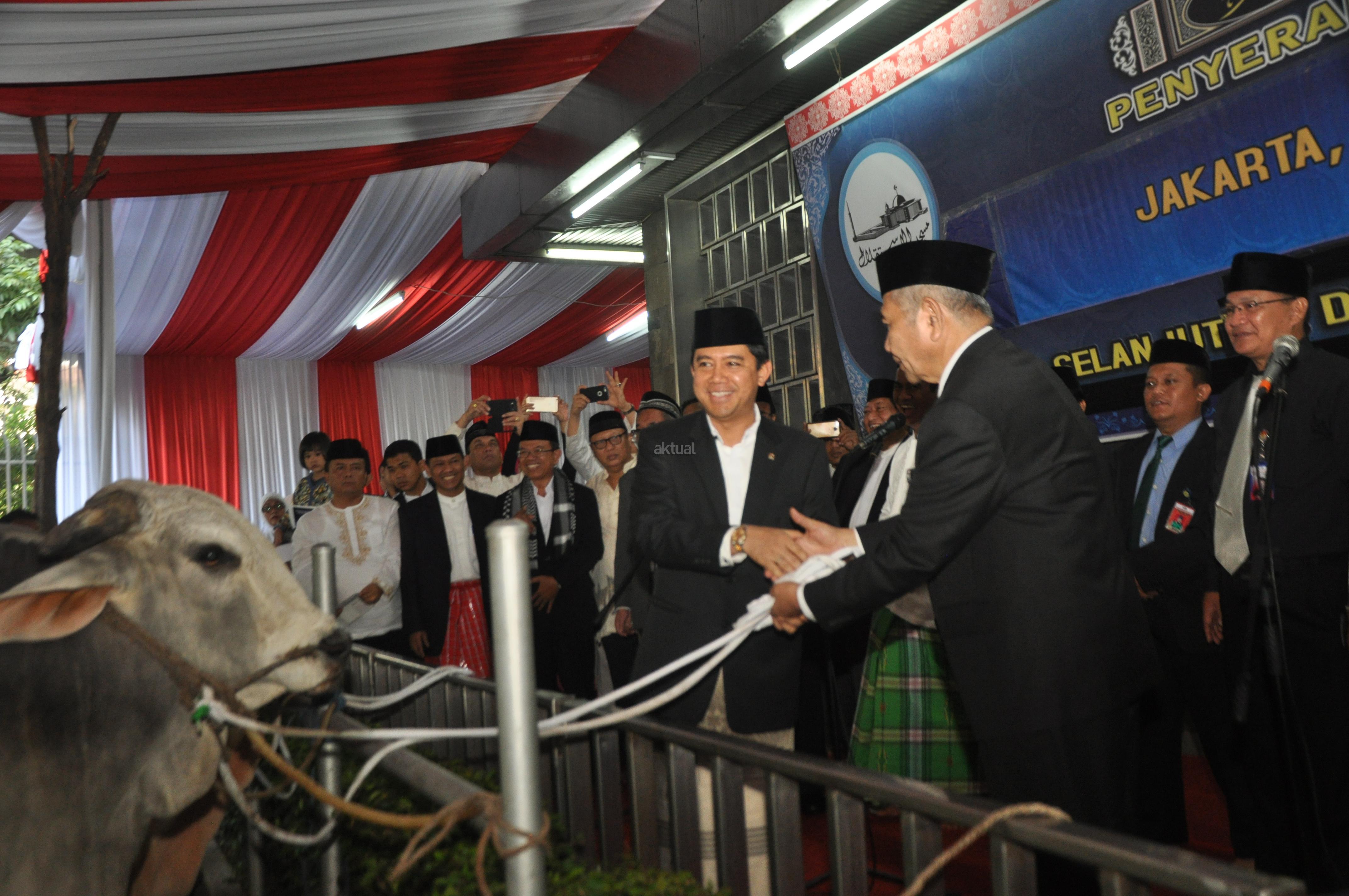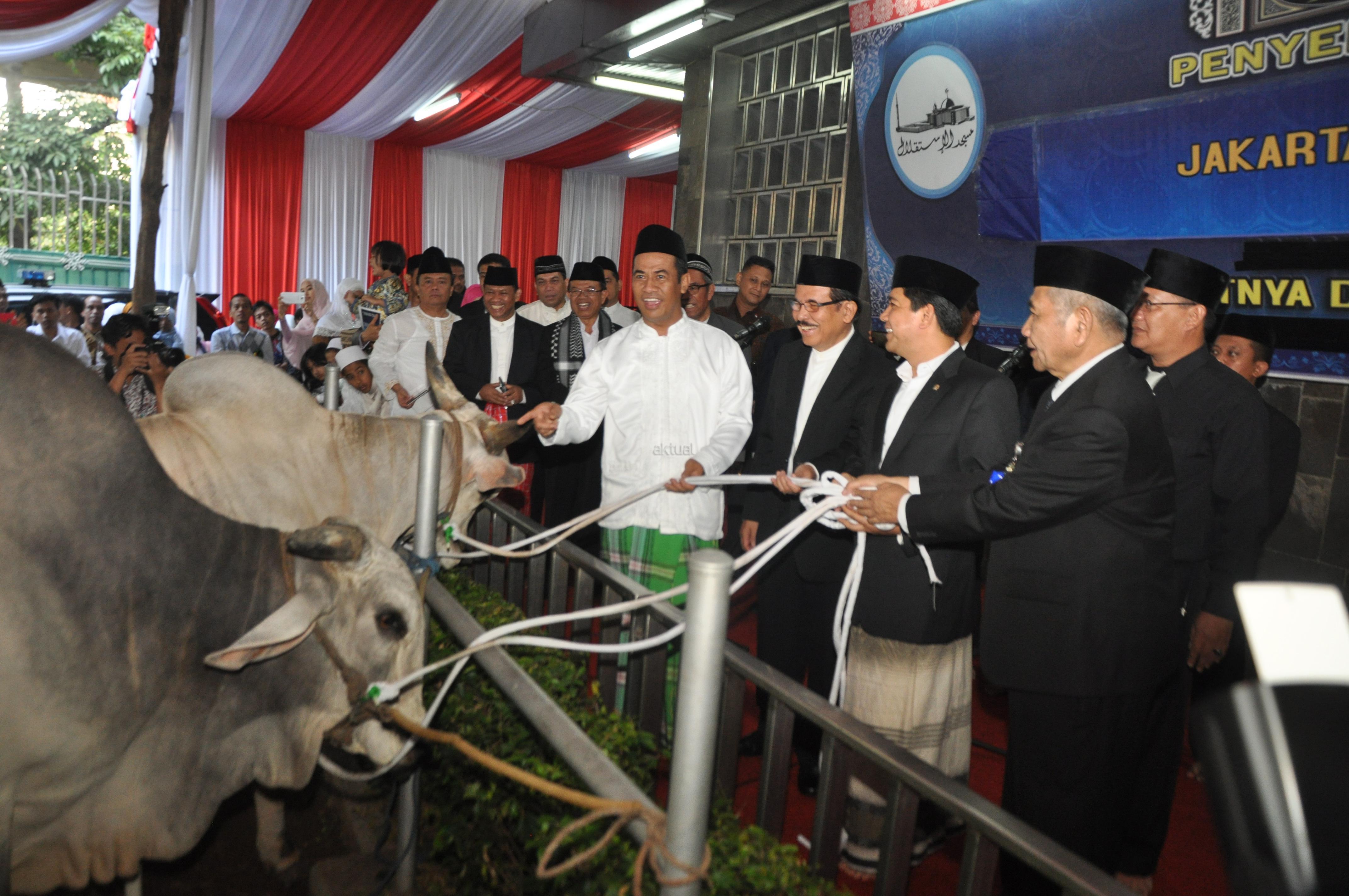 Menteri Pendayagunaan Aparatur Negara dan Reformasi Birokrasi (MenPAN-RB) Yuddy Chrisnandi meyerahkan Hewan Qurban berupa satu ekor sapi milik Presiden RI, Joko Widodo di Halaman Masjid Istiqlal, Jakarta, Kamis (24/9/2015). Sedangkan sapi Wakil Presiden Jusuf Kalla diserahkan Menteri Pertanian Andi Amran Sulaiman.