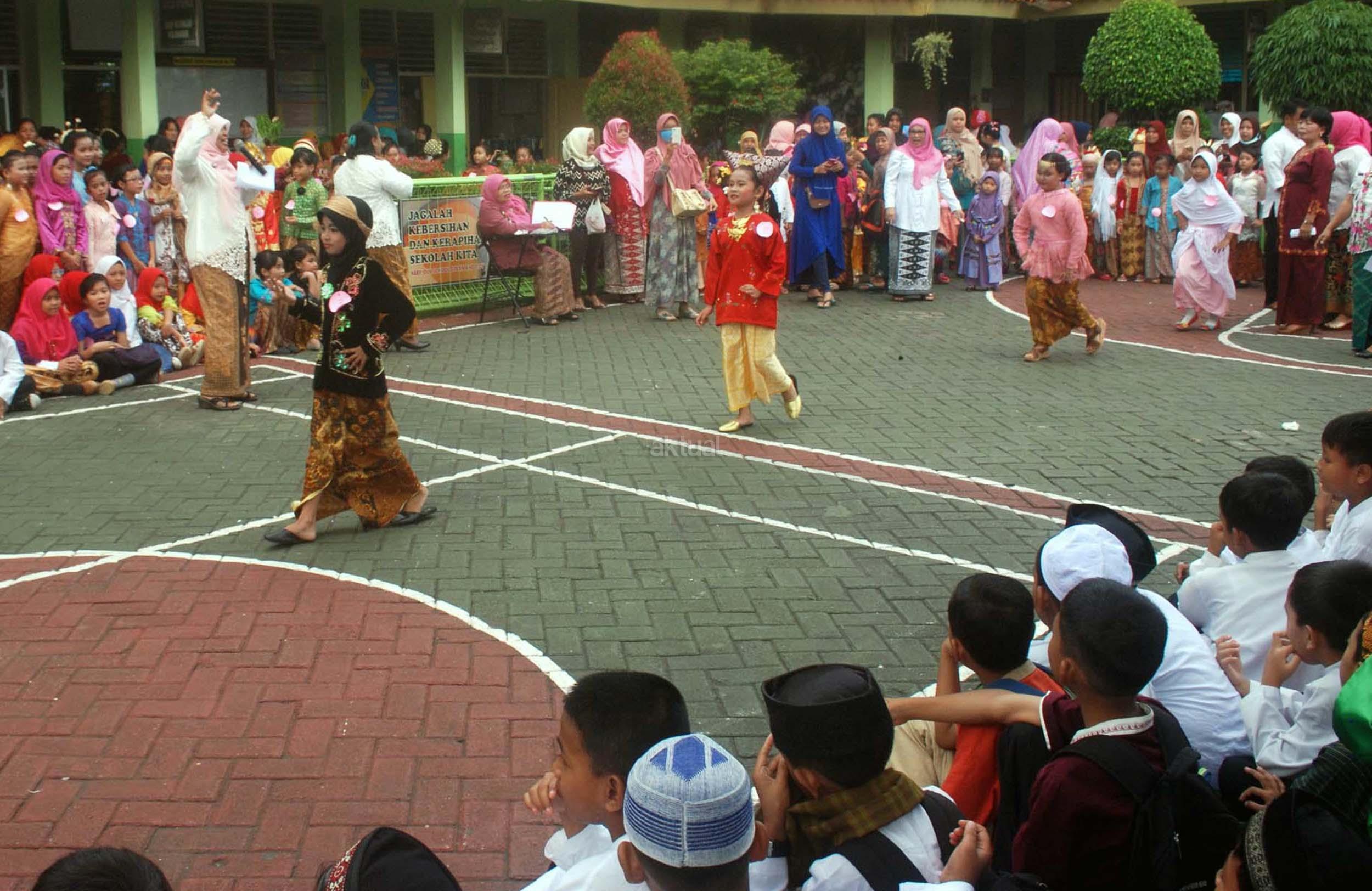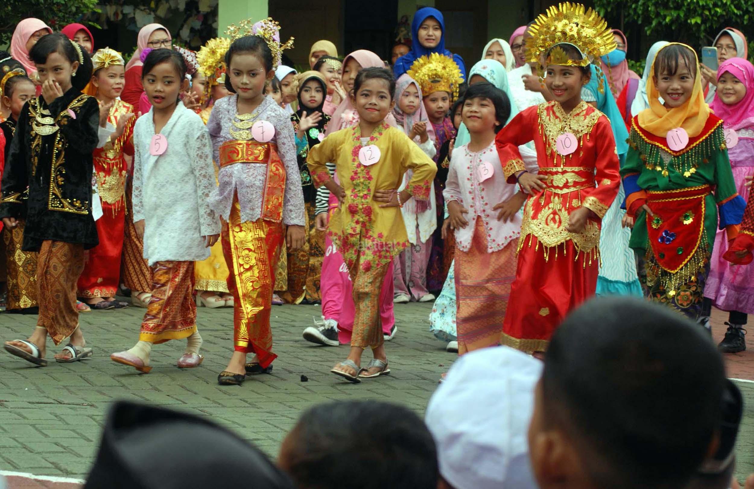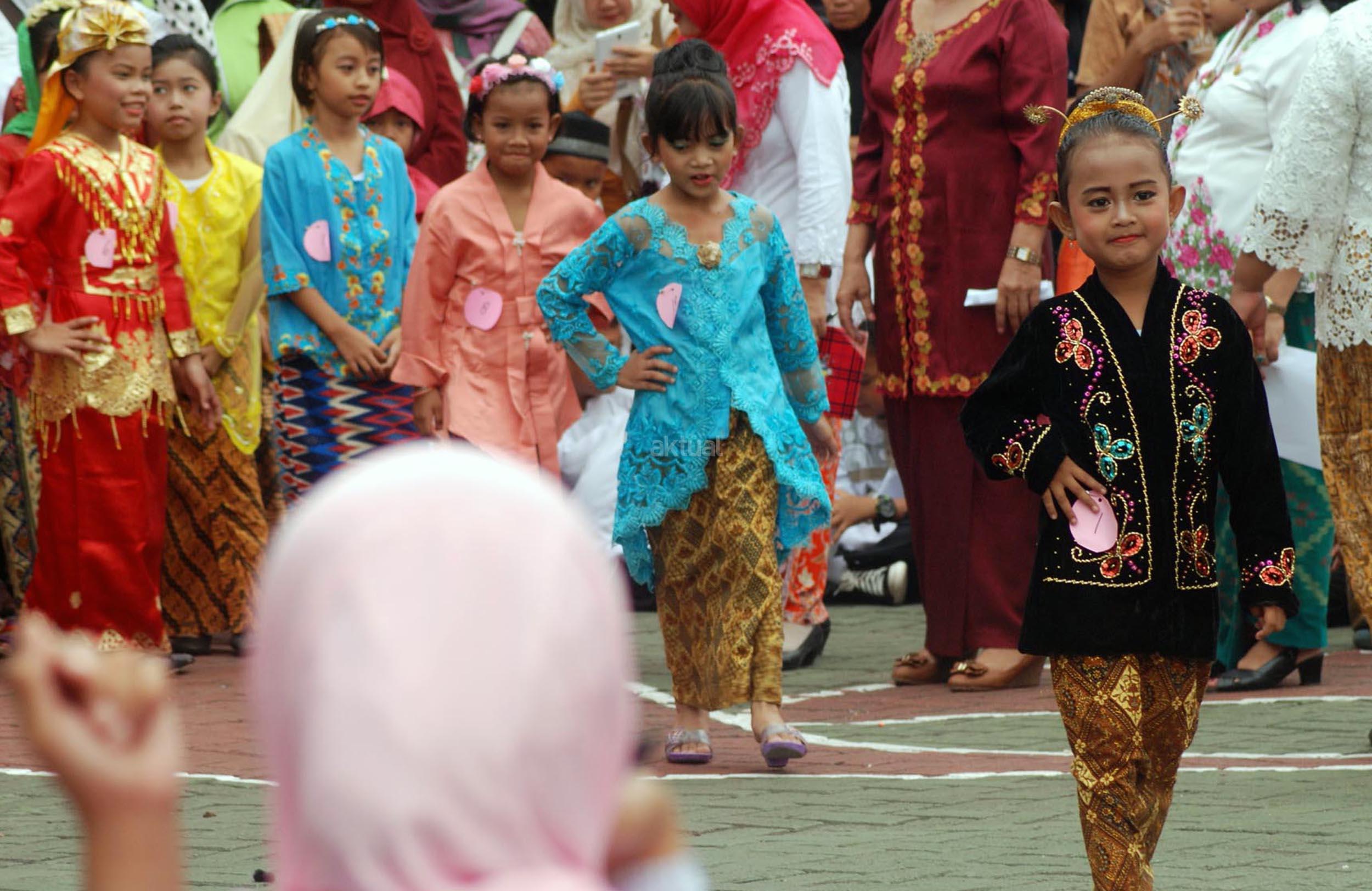 Sejumlah murid SD Cibubur 04 mengikuti kegiatan fashion show dengan menggunakan baju adat , Jakarta, Jumat (21/4/2017). Kegiatan tersebut digelar dalam rangka memperingati Hari Kartini. AKTUAL/Munzir