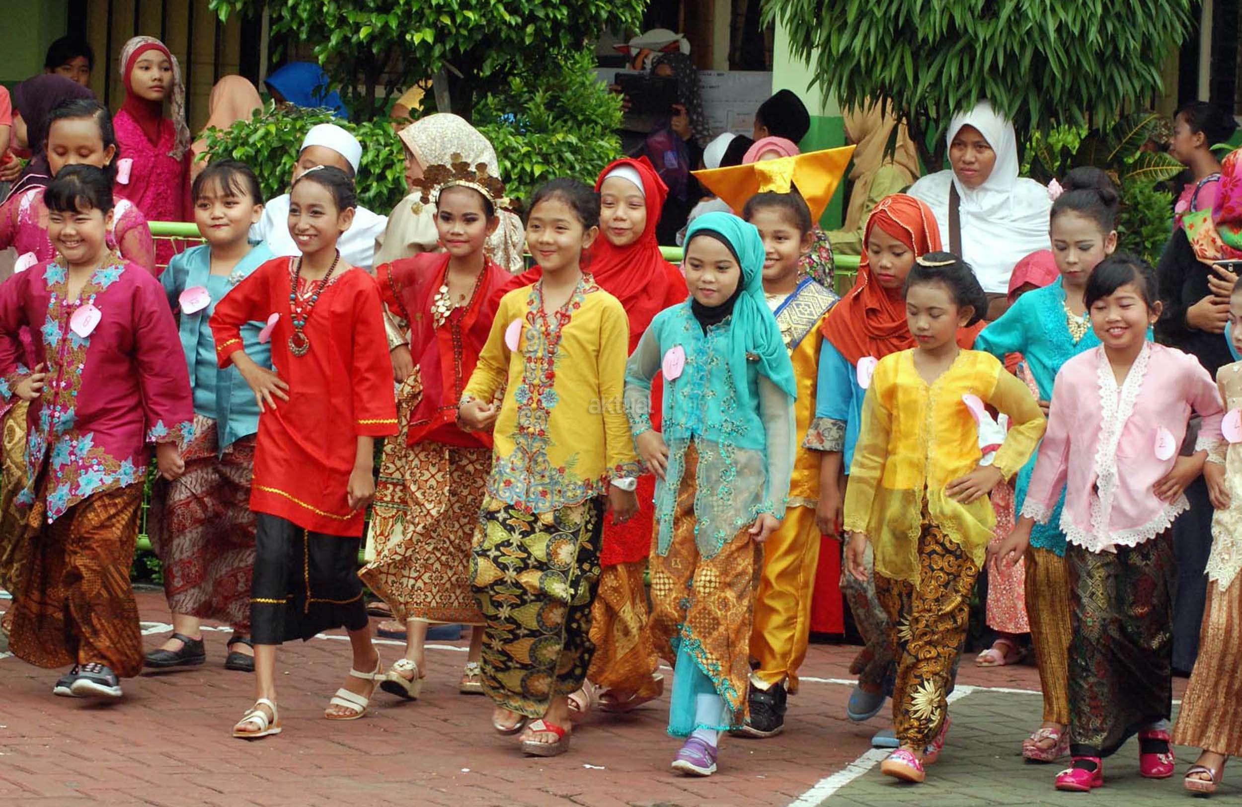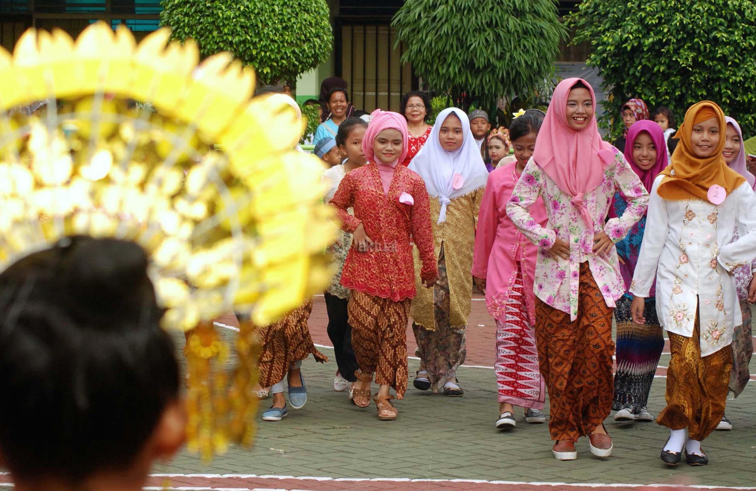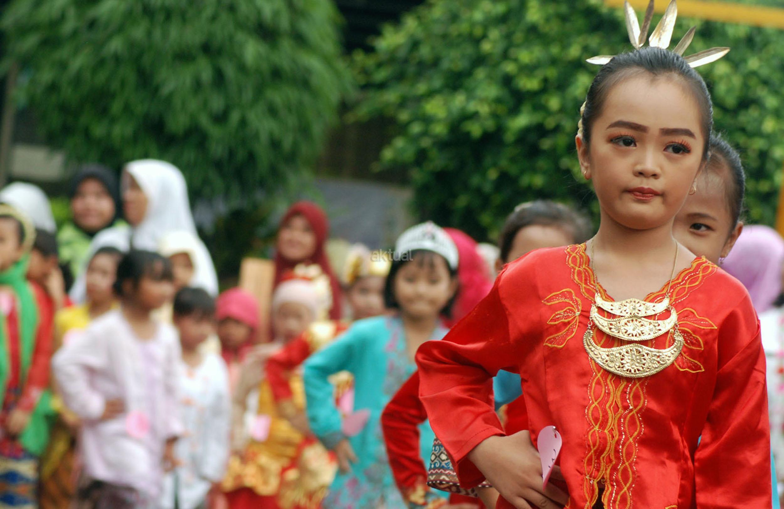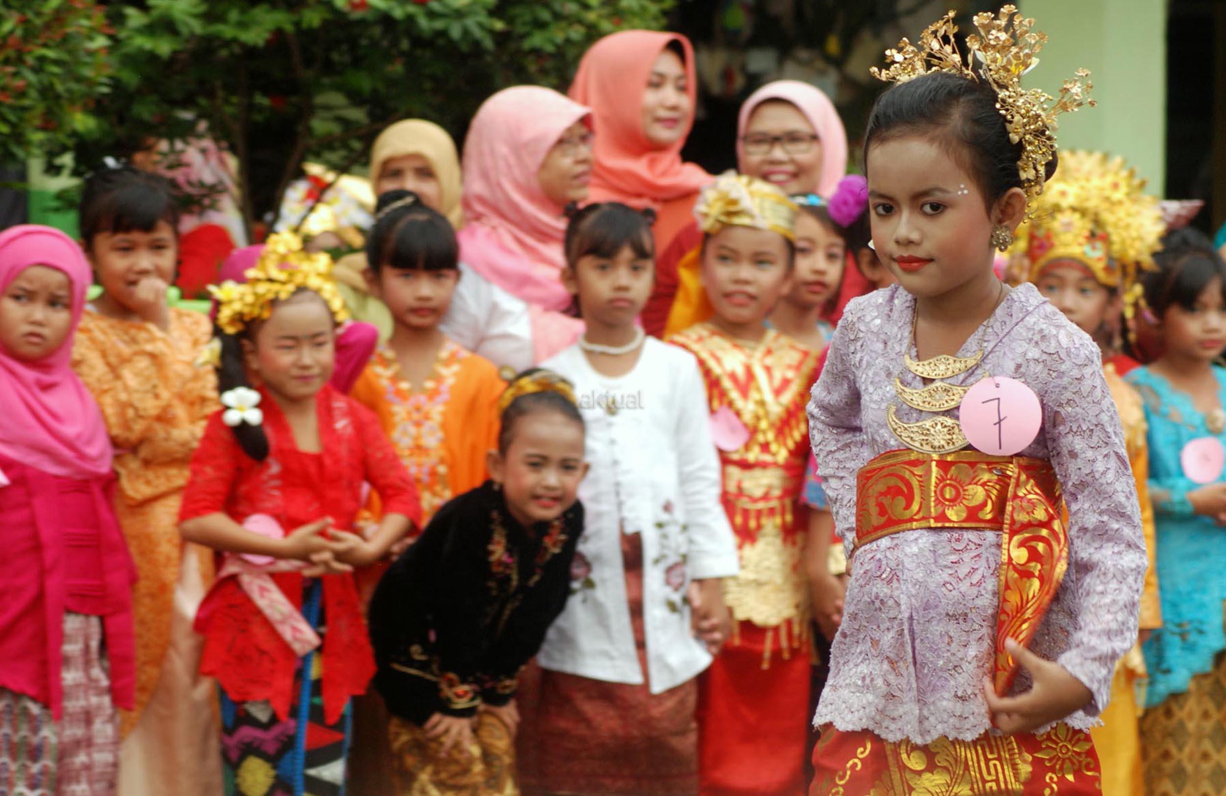 Sejumlah murid SD Cibubur 04 mengikuti kegiatan fashion show dengan menggunakan baju adat , Jakarta, Jumat (21/4/2017). Kegiatan tersebut digelar dalam rangka memperingati Hari Kartini. AKTUAL/Munzir