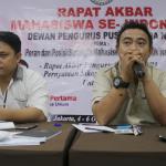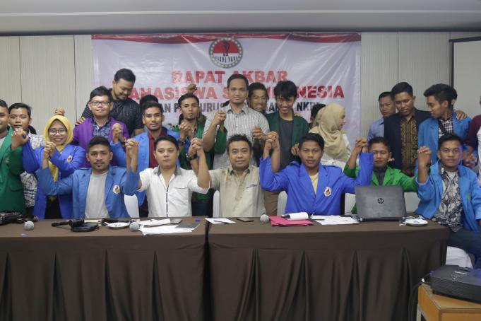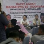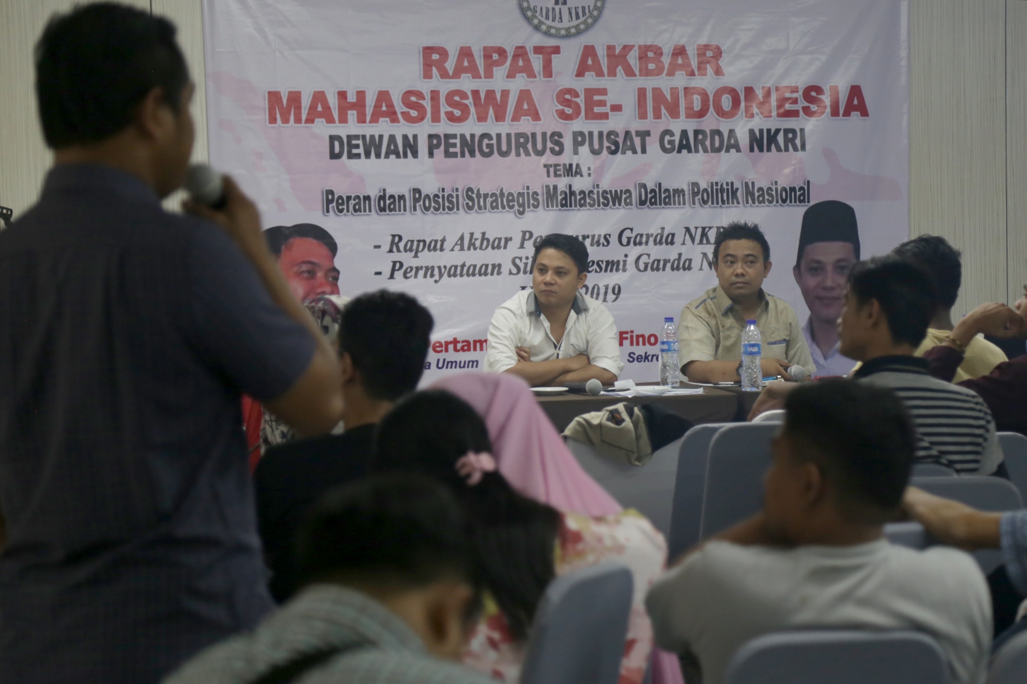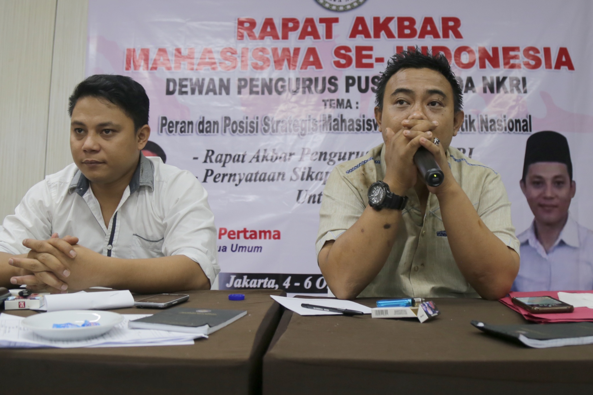 Ketua Umum Garda NKRI Haris Pratama bersama Sekjen Garda NKRI Fino Mongkau saat Penutupan Rapat Akbar Mahasiswa Se – Indonesia Dewan Pengurus Pusat Garda NKRI bertema “Peran dan Posisi Strategis Mahasiswa dalam Politik Nasional” di Jakarta, Sabtu (6/10). Garda NKRI menyatakan sikap dengan resmi untuk mendukung Penuh dan bulat Bapak Ir. Joko Widodo sebagai Presiden dan Bapak KH. Ma’ruf Amin Sebagai Wakil Presiden Republik Indonesia Periode 2019-2024. AKTUAL/Tino Oktaviano