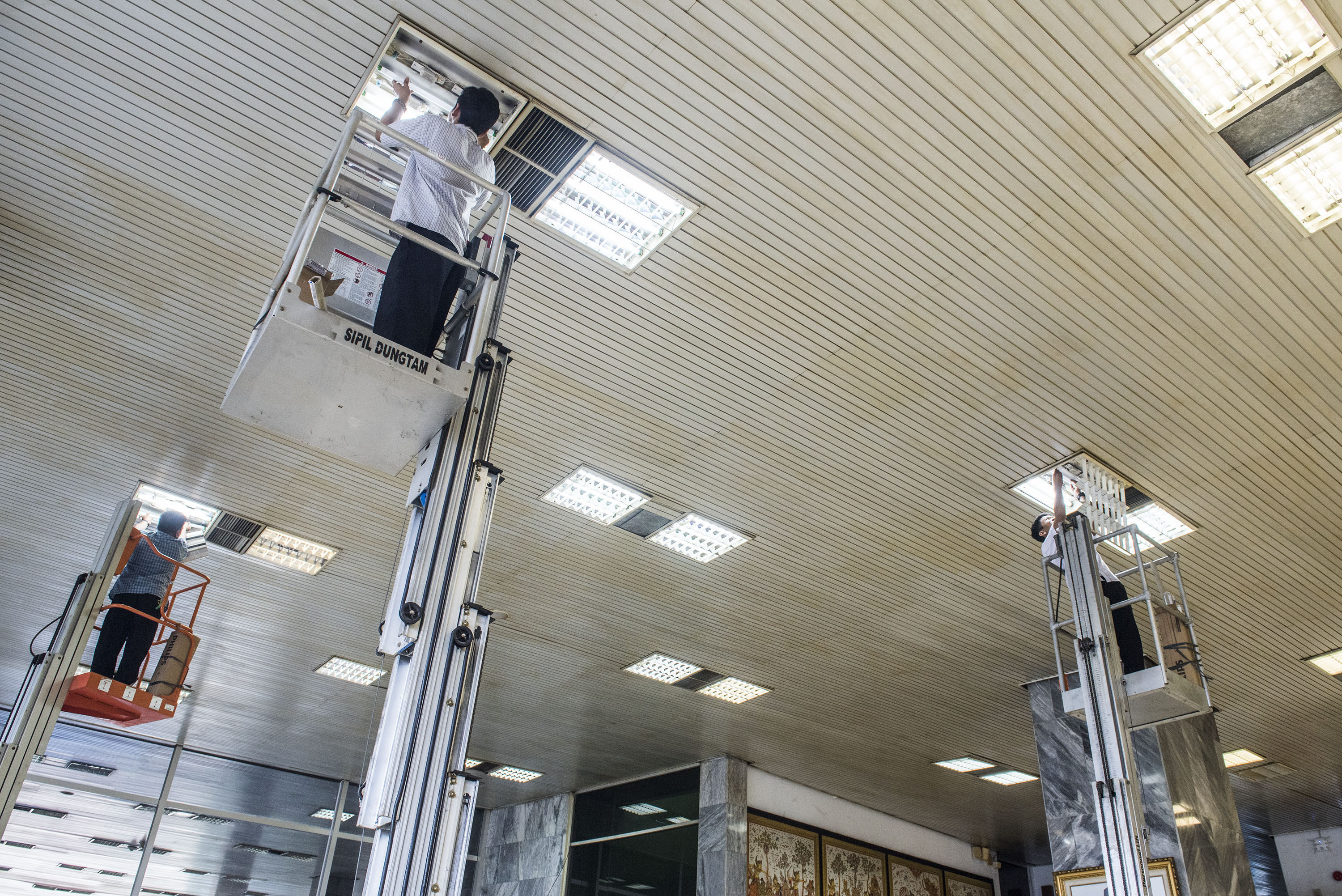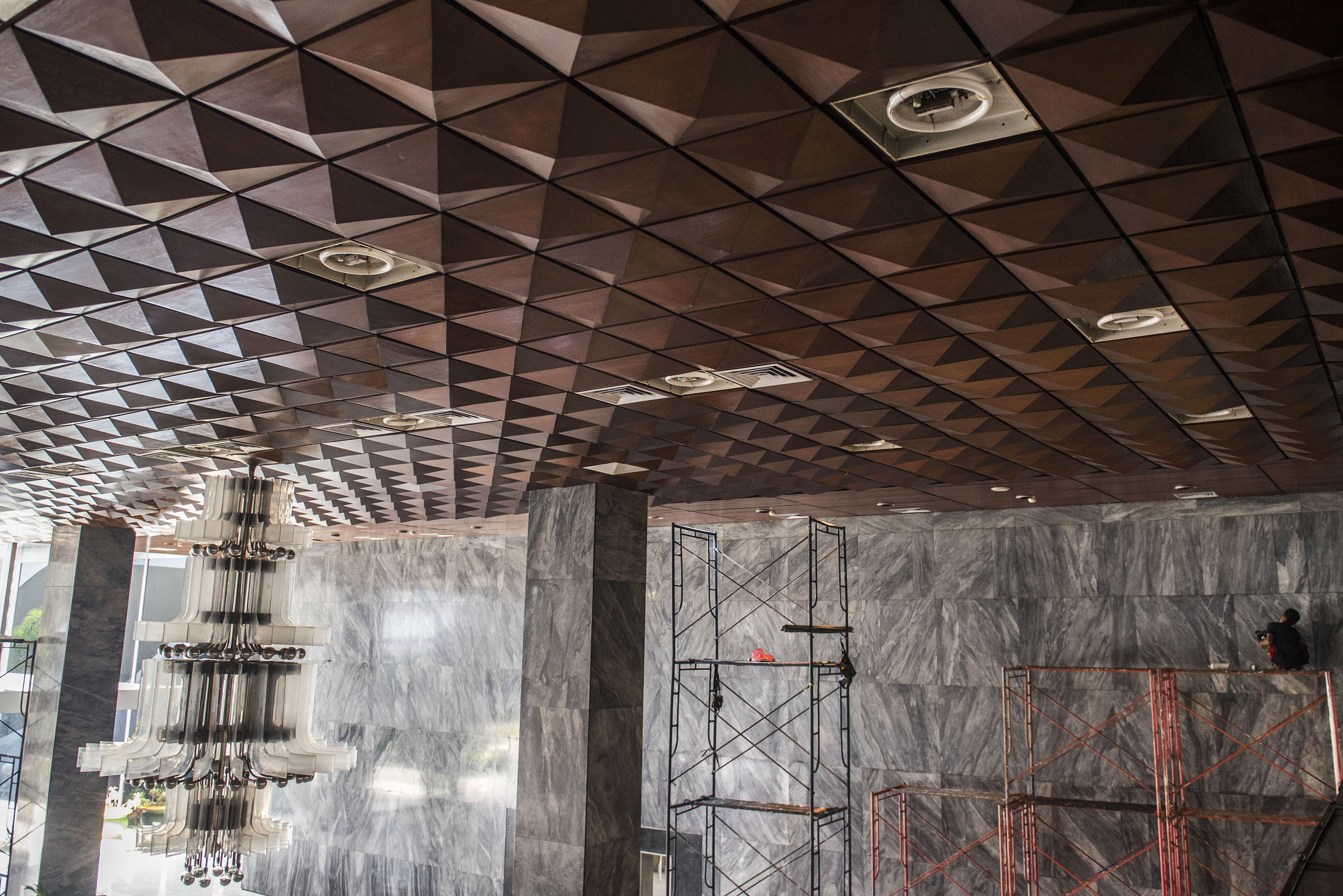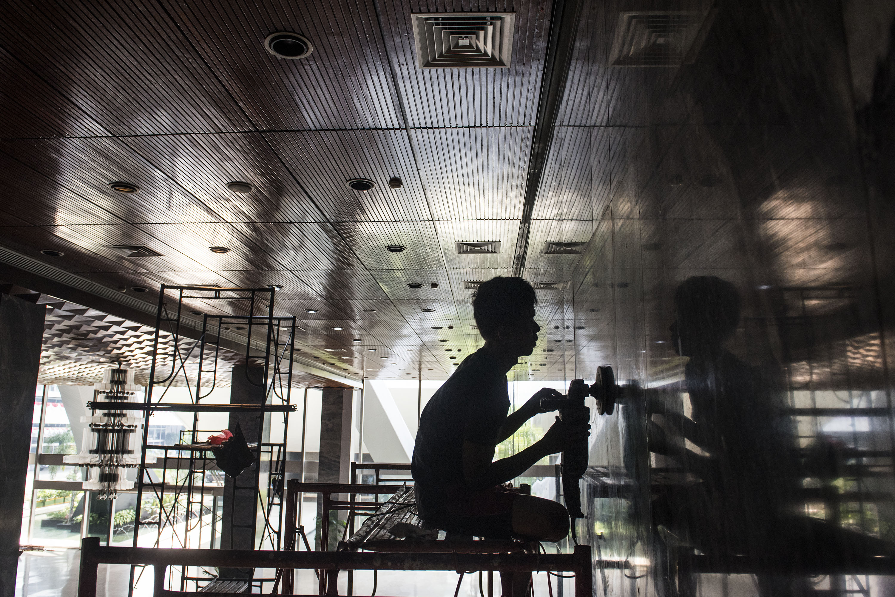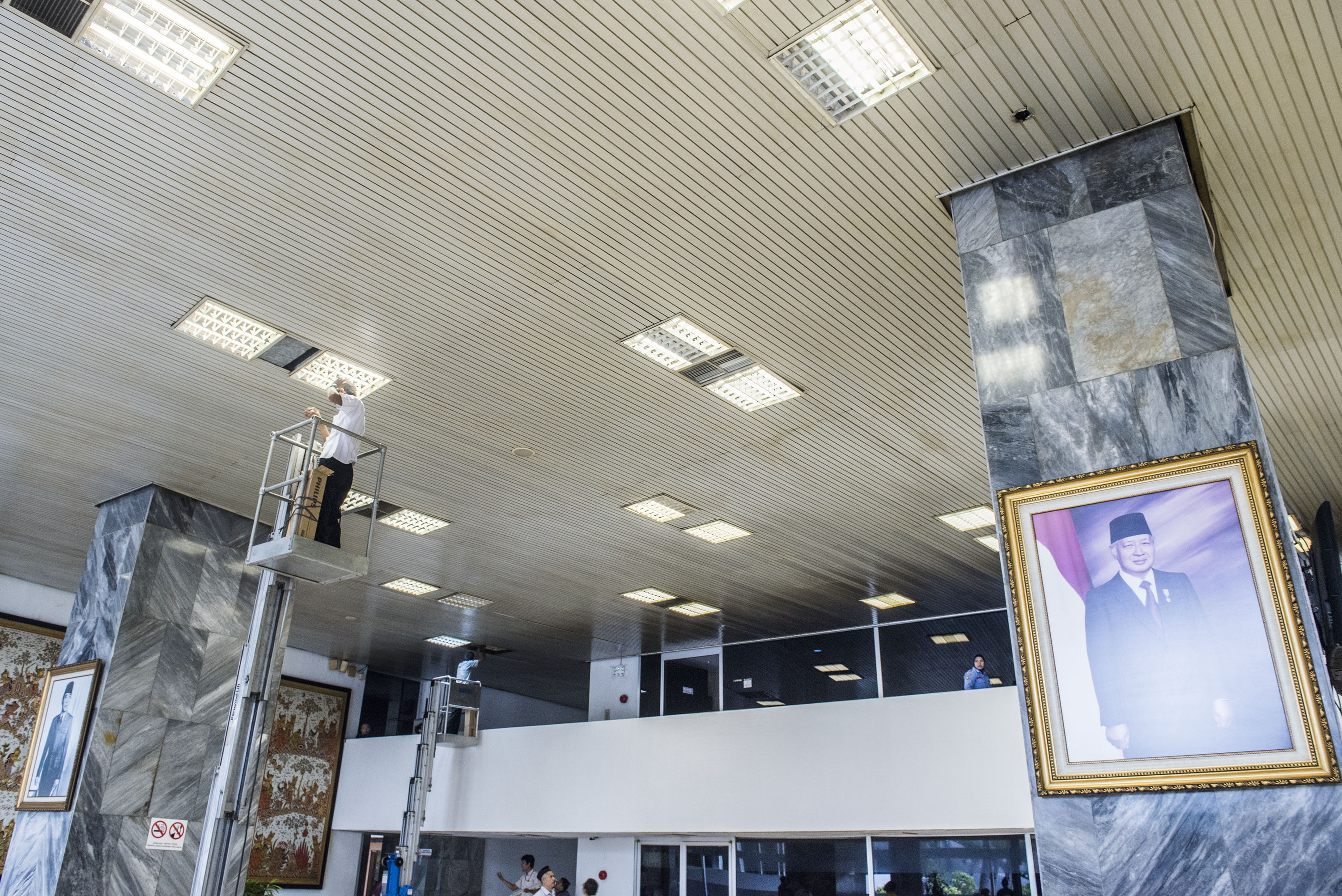 Pekerja melakukan perawatan rutin di gedung Nusantara 2, Kompleks Parlemen, Senayan, Jakarta, Senin (1/8). Perawatan tersebut dilakukan dalam rangka persiapan Pidato Kenegaraan Presiden Joko Widodo pada 16 Agustus mendatang. ANTARA FOTO/M Agung Rajasa/aww/16.